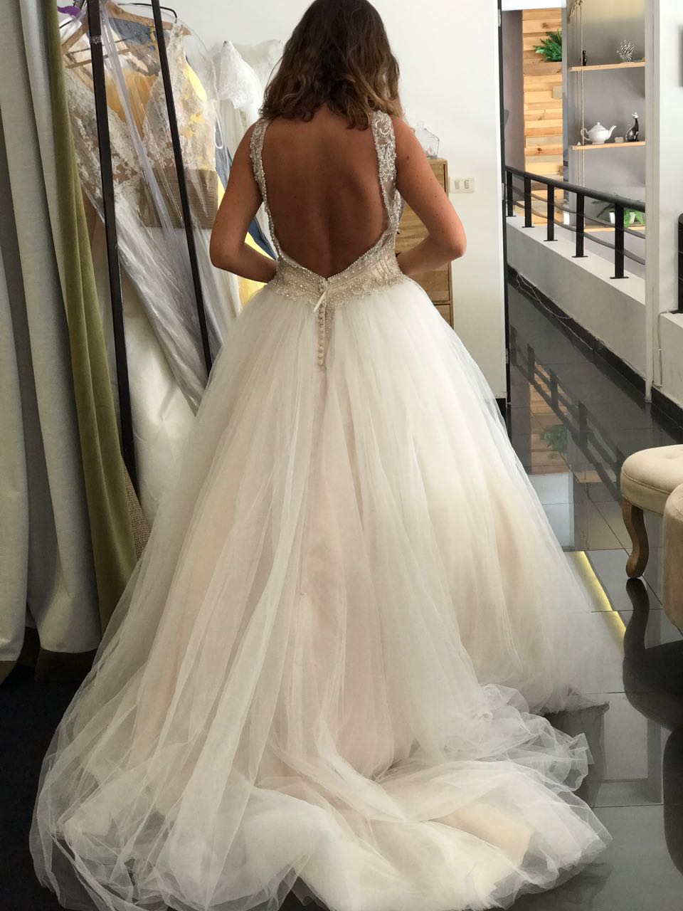 Vestido de novia estilo princesa. Con espalda modificada, entallado en la cintura y le retire el relleno. Le abrí toda la espalda.