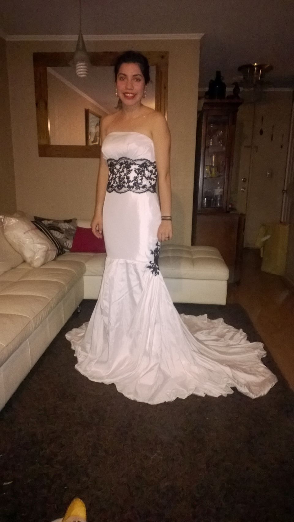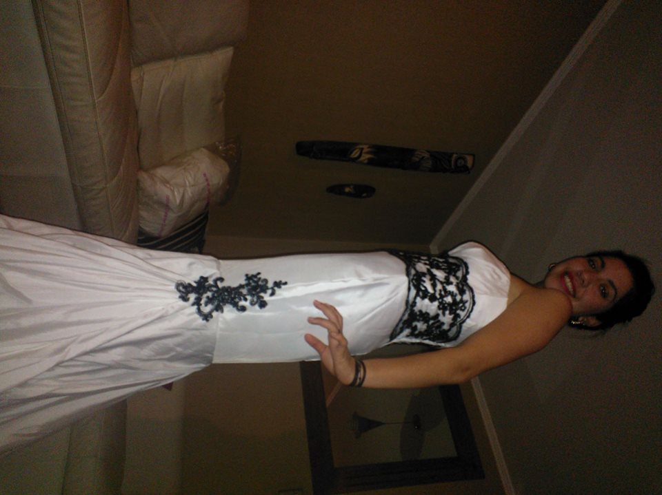 Hola amigas soy la dueña de una distribuidora de vestidos de novia importados de EEUU, Dulce Sueños y remato este vestido por estar fuera de temporada 2014, su confección es de primer nivel perfecto calce da de una talla 36 a la 40 ya que es estilo corsett tiene aplicación con broderi en negro que fue lo que se esta usando.