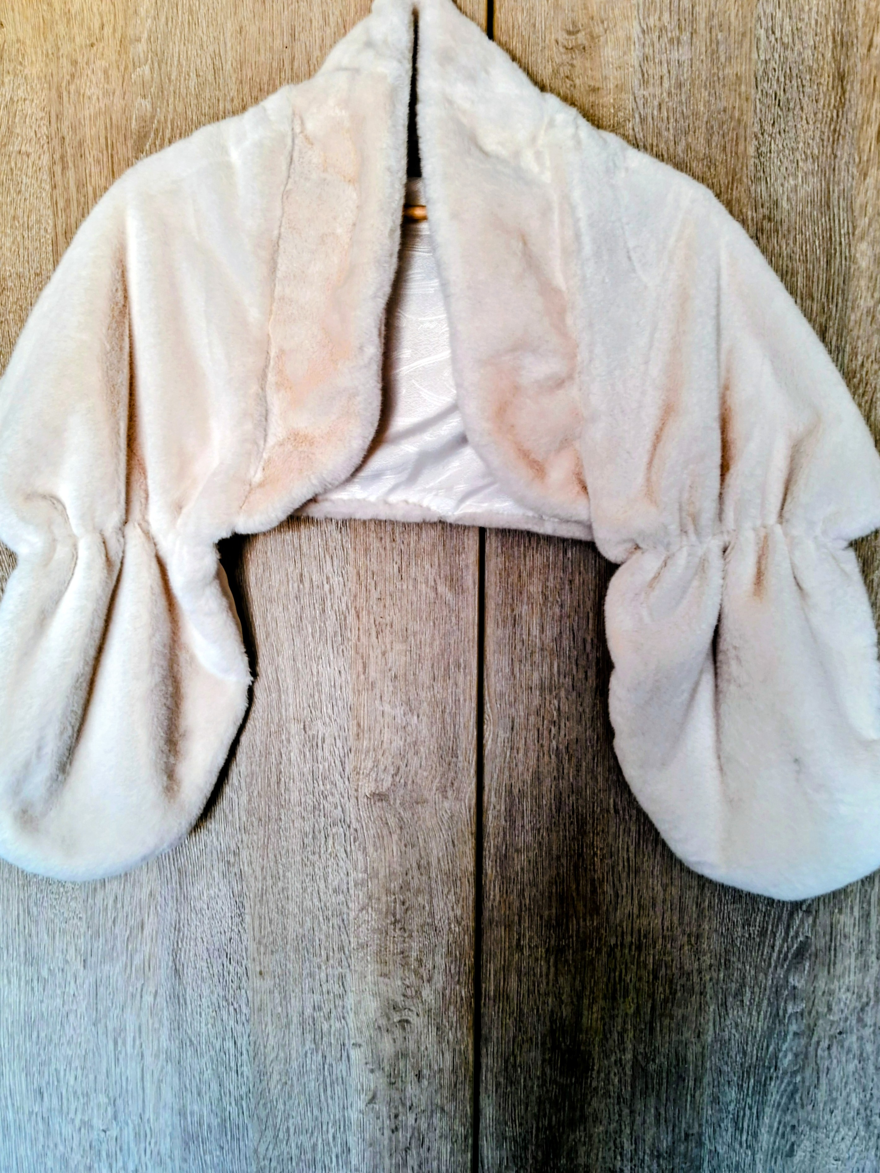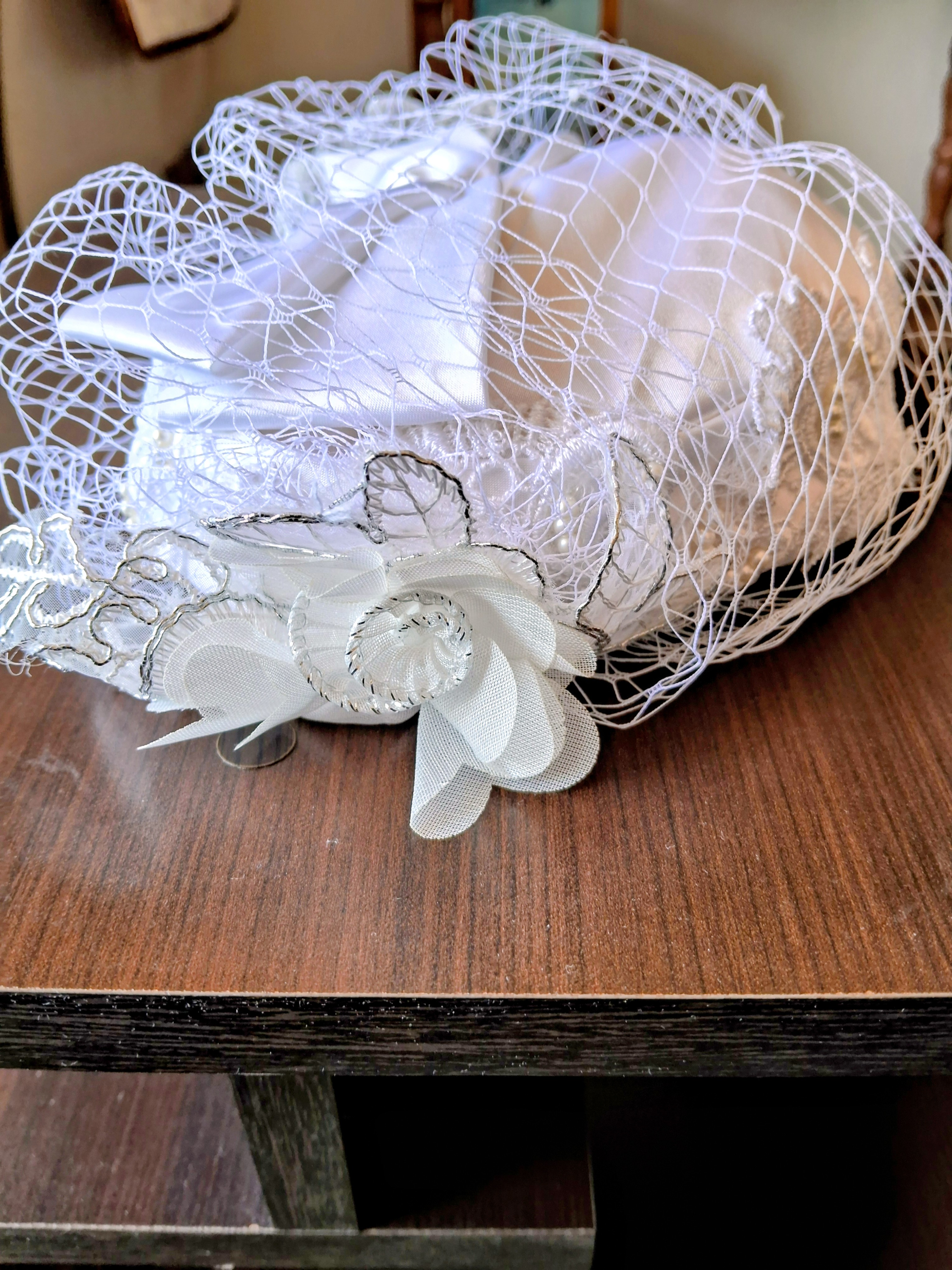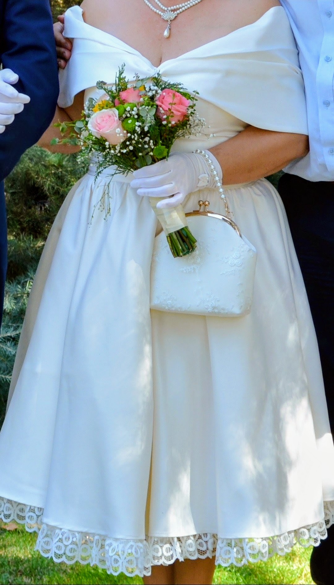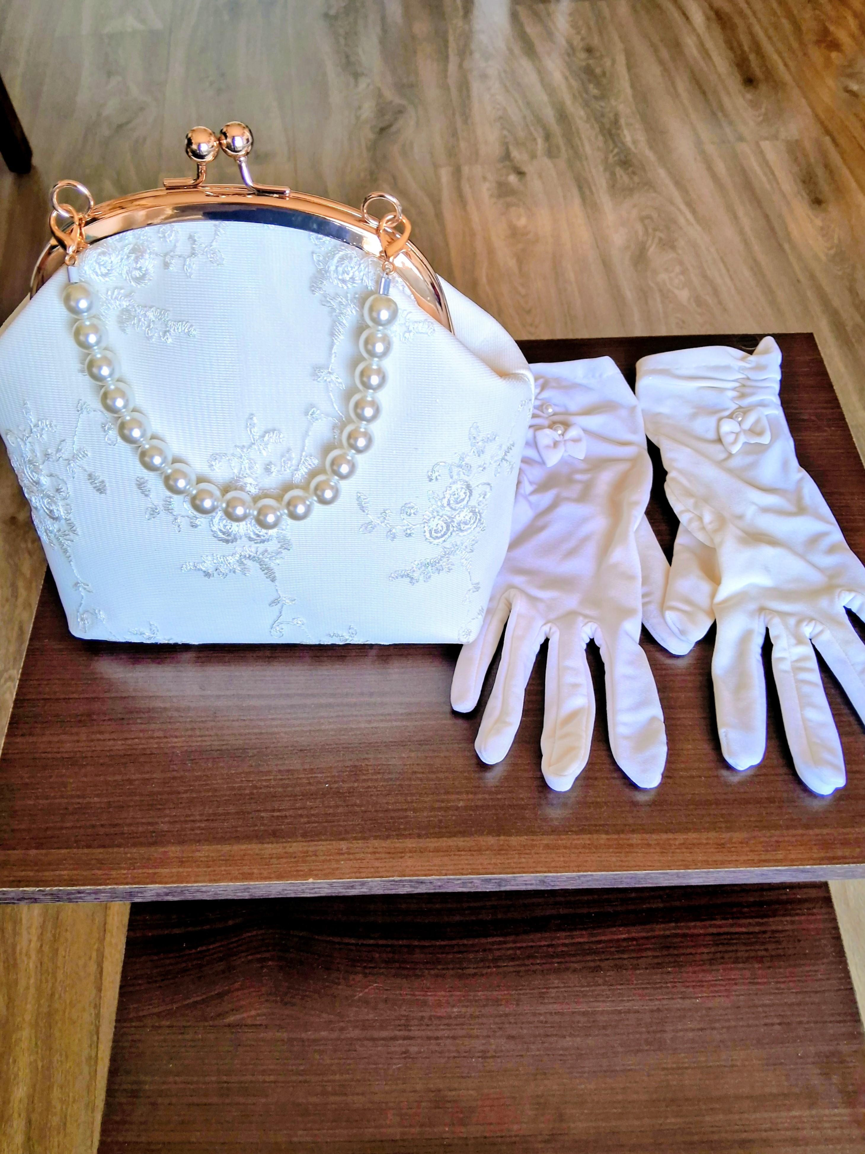 Incluye accesorios: sombrero pastillero de satin blanco con malla, estola de piel blanca, cartera de satin bordada con manilla de perlas, guantes blancos.