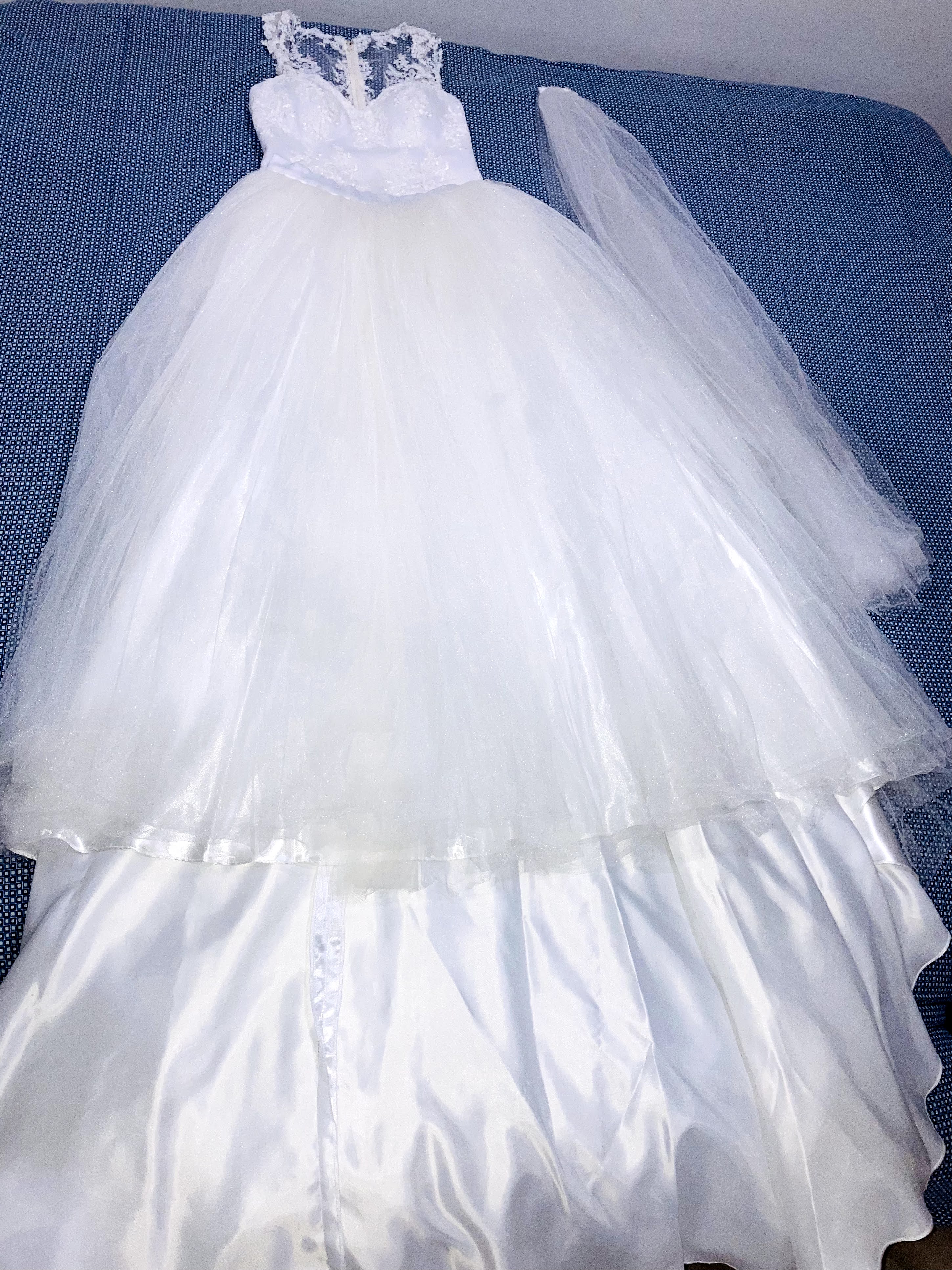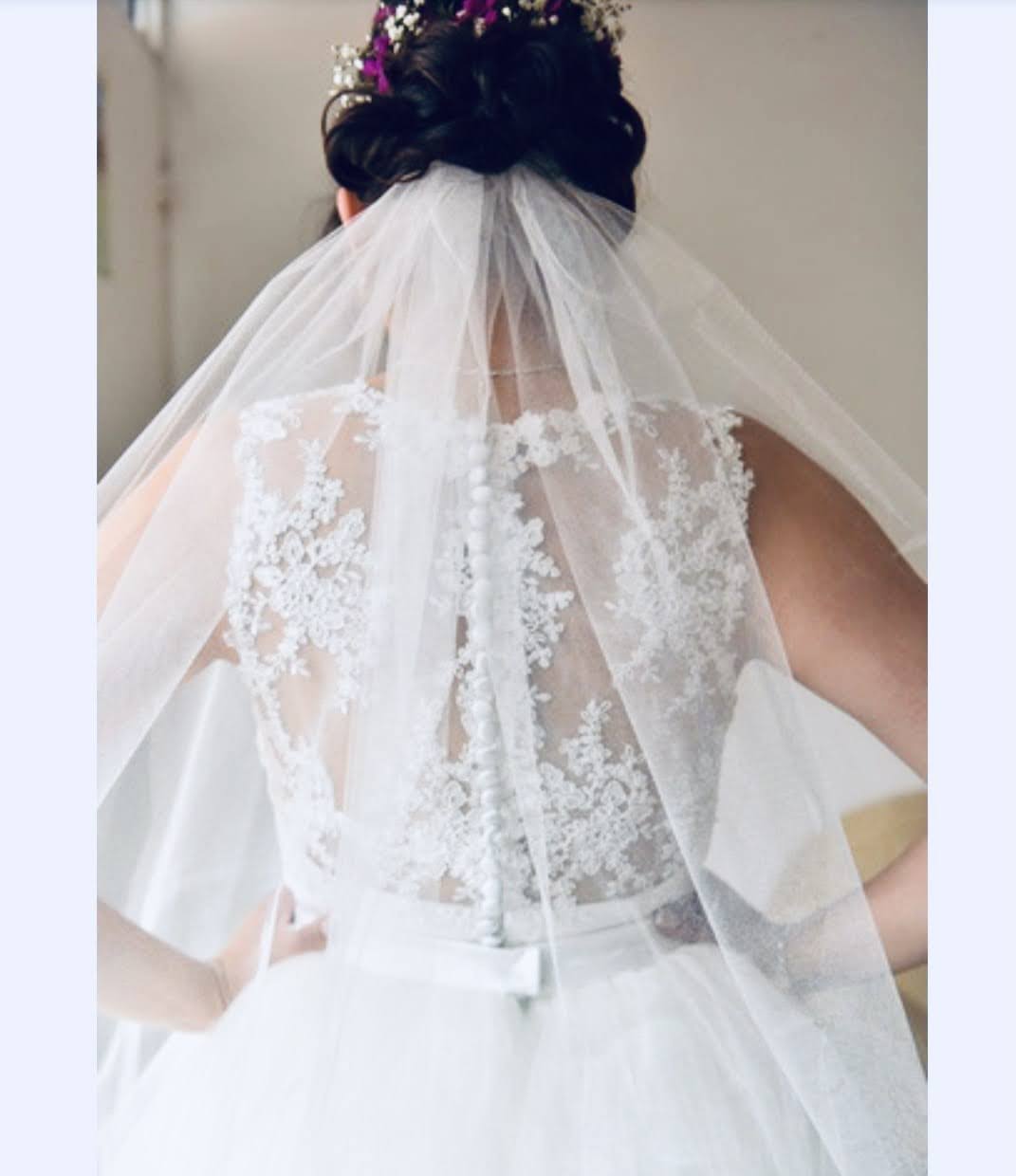 Vestido de novial, echo con encaje Ivory y una falda en varias capas de tules, el cual es talla M y se uso para una dama de 60 kg y de 1,65 de estatura.