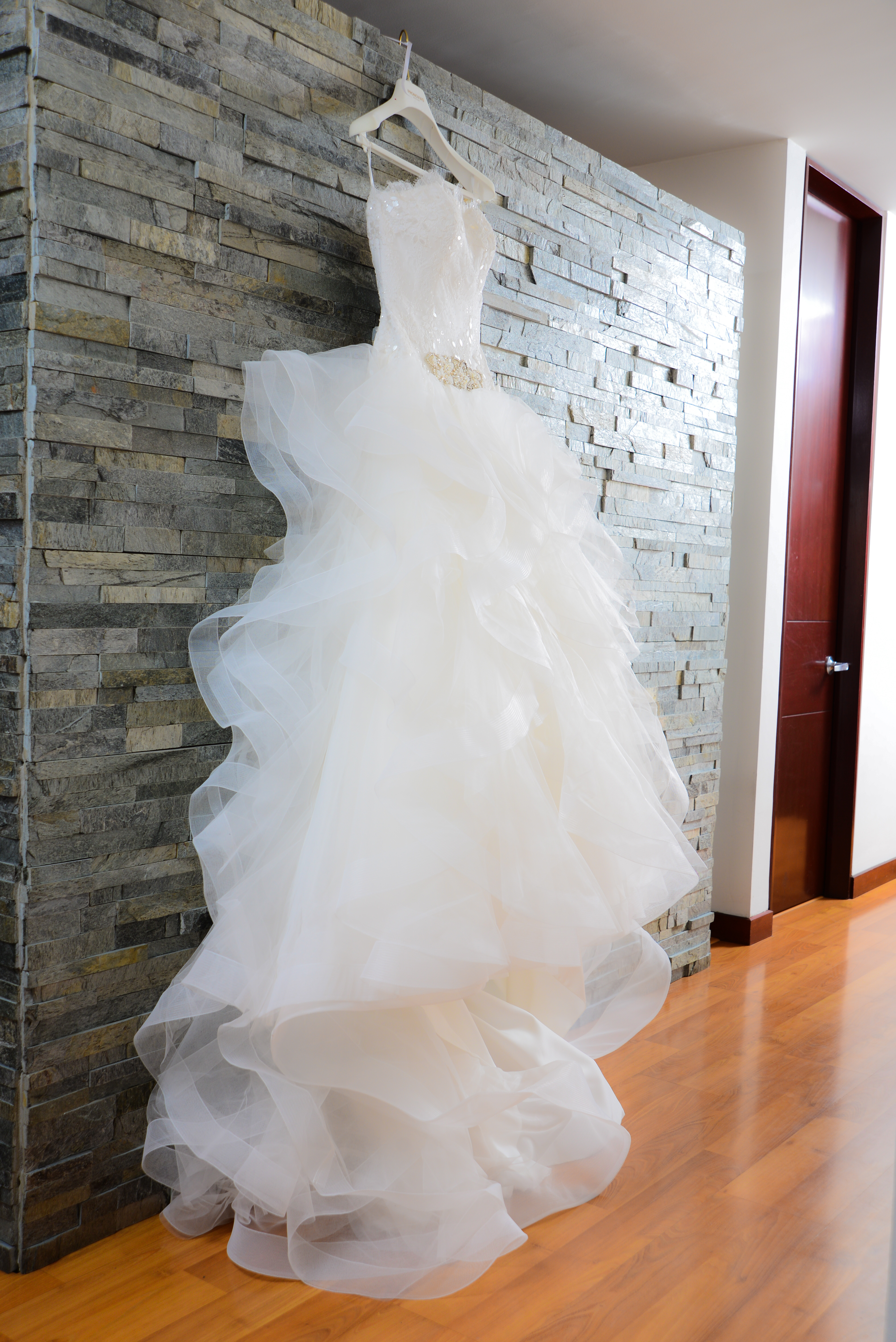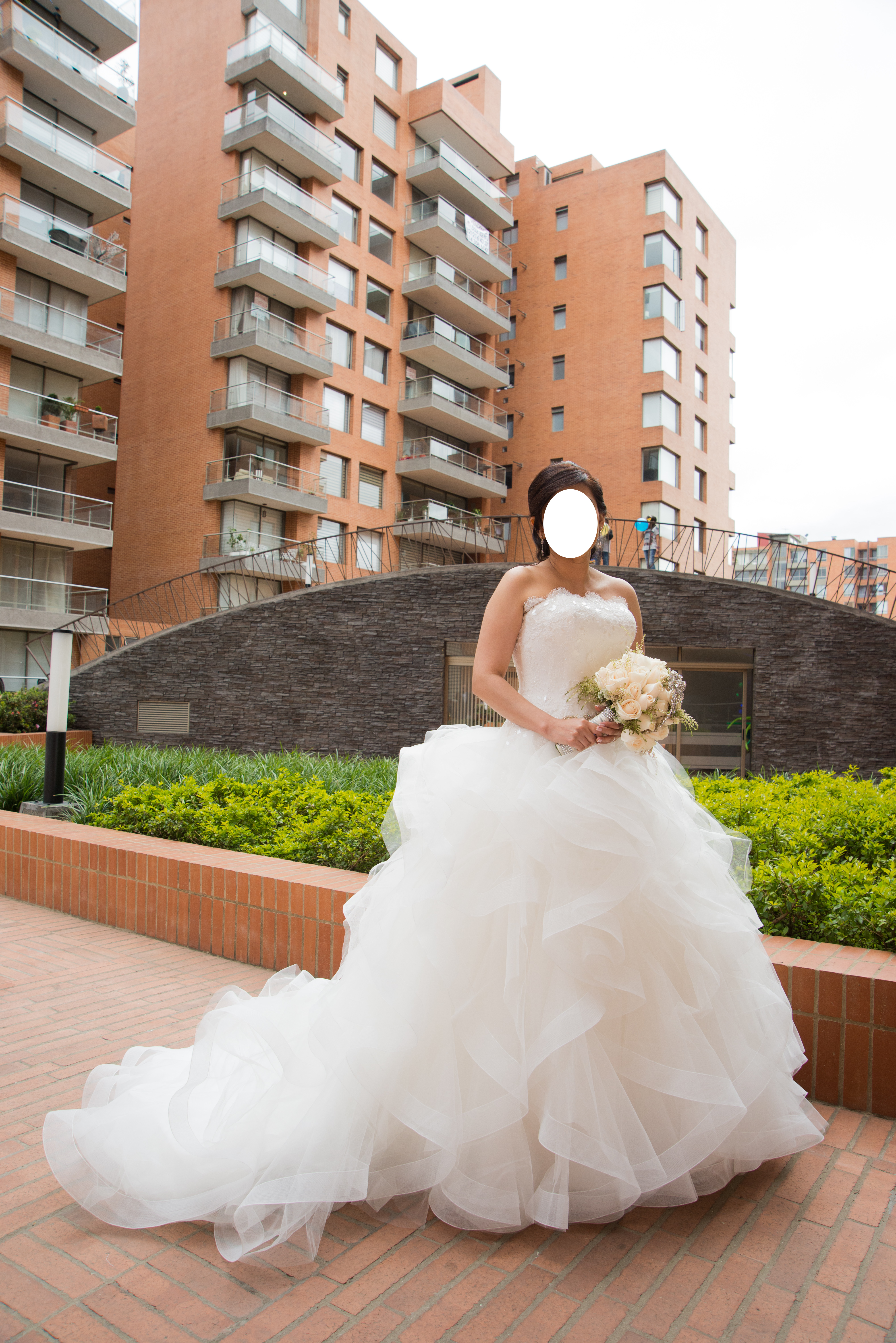 El vestido lo adquirí en la tienda pronovias, del C.C el Retiro y lo trajeron desde Barcelona. Se ha utilizado una sola vez y después de haberse usado se mandó a lavar en la empresa sugerida, quien realizó un lavado a mano, por lo que no se emplearon químicos para así conservar la tela y los accesorios. Al vestido se le adicionó un broche que fue cocido al nivel de la cintura, el cual también fue adquirido en el mismo almacén. Tiene muchos apliques en la parte de arriba y en la falda tiene varias capas, por lo que el vestido tiene mucho vuelo y si quieres más o menos, le puedes poner can-can por debajo. Es elegante pero a la vez moderno. Debido al diseño del vestido, se mantiene fijo al cuerpo, sin que exista ningún riesgo de que se baje. La falda puede recogerse, lo que da mucho movimiento. El vestido se encuentra en su funda original. Se puede negociar el precio.