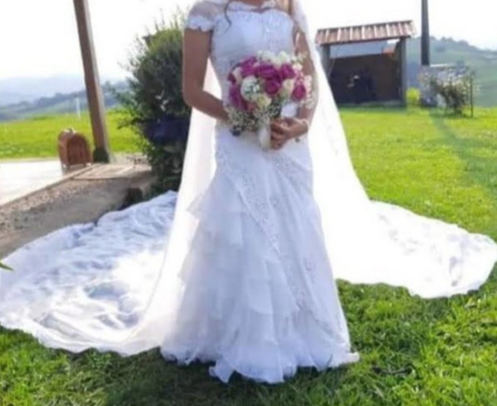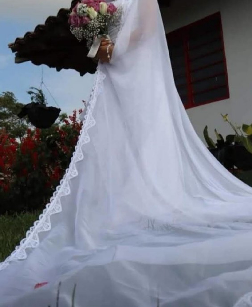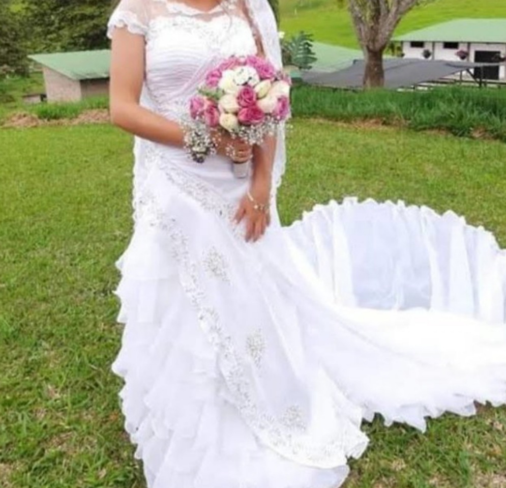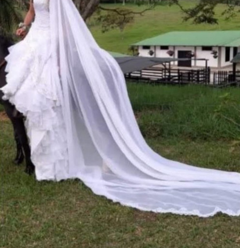 Vestido de novia con velo importado, italiano. Fue hecho sobre medidas, talla pequeña, yo mido 1.54 m, me quedaba largito, forma de la cola de el vestido en cola de pato, con bordes en encaje el velo y en el escote. Piedreria en todo el vestido. Puesto solo una vez, único dueño.