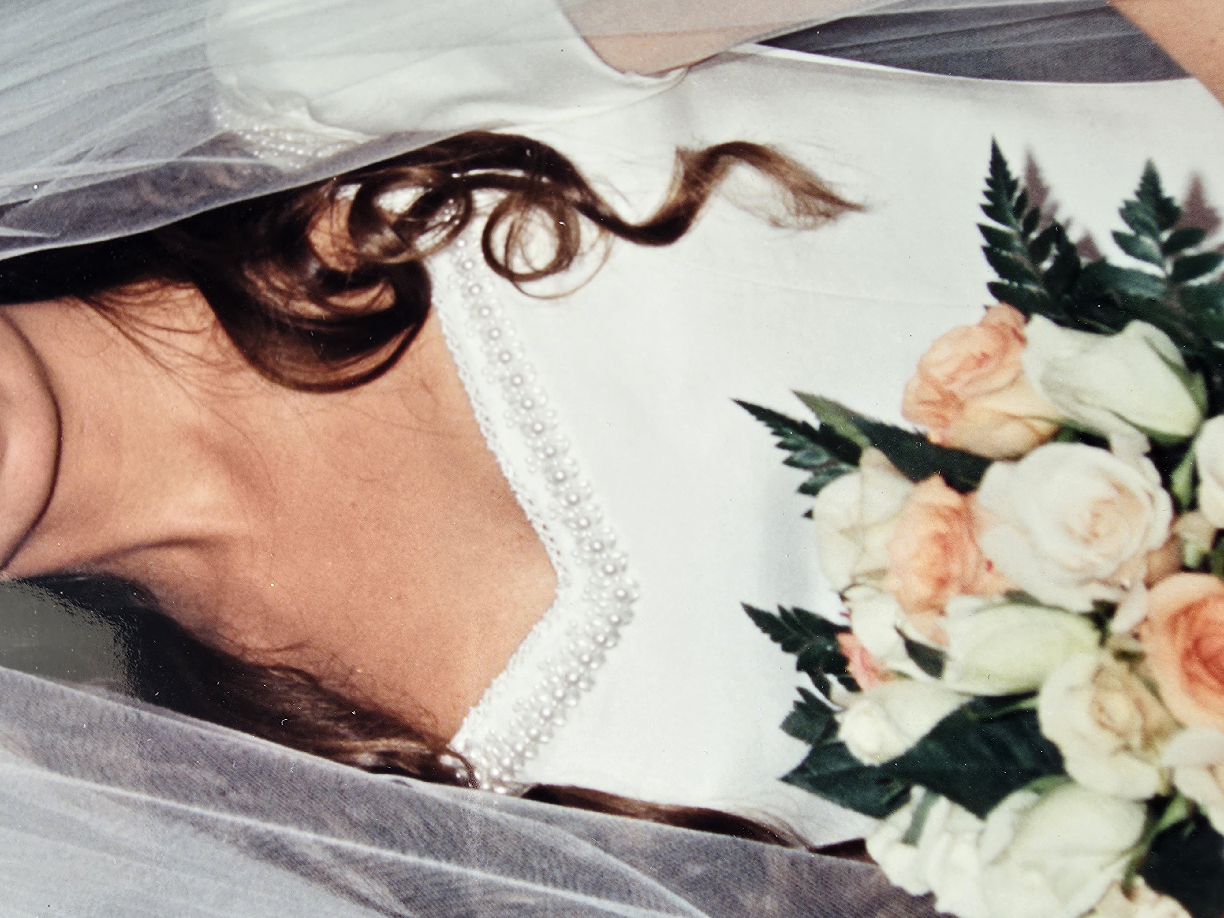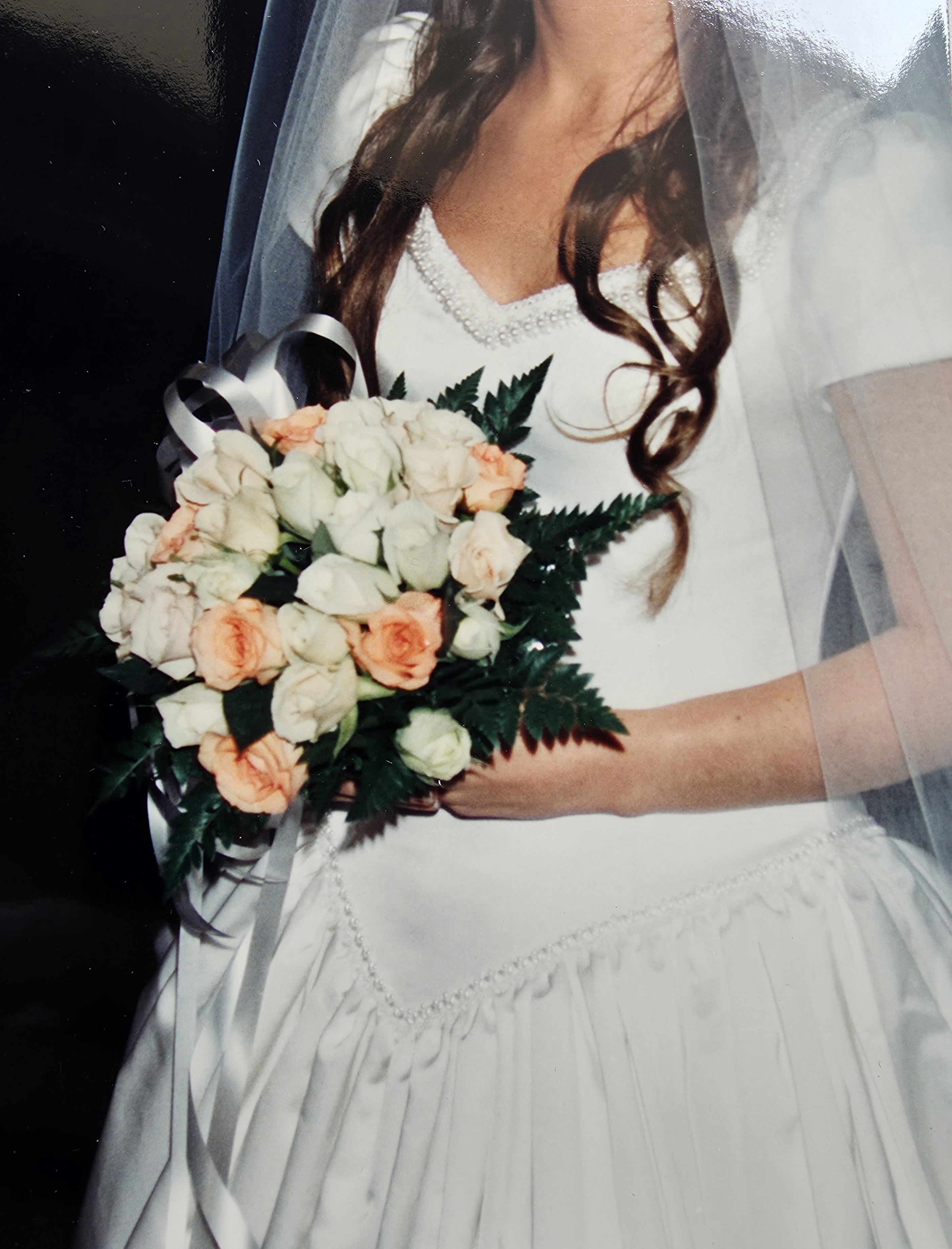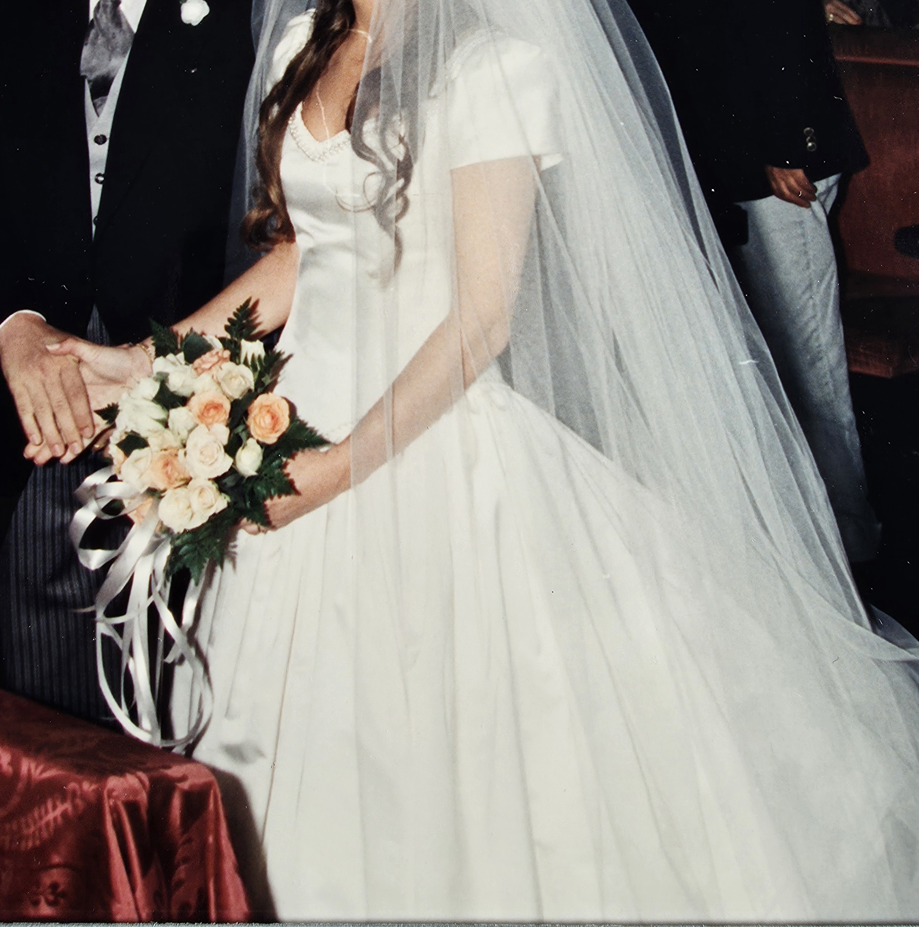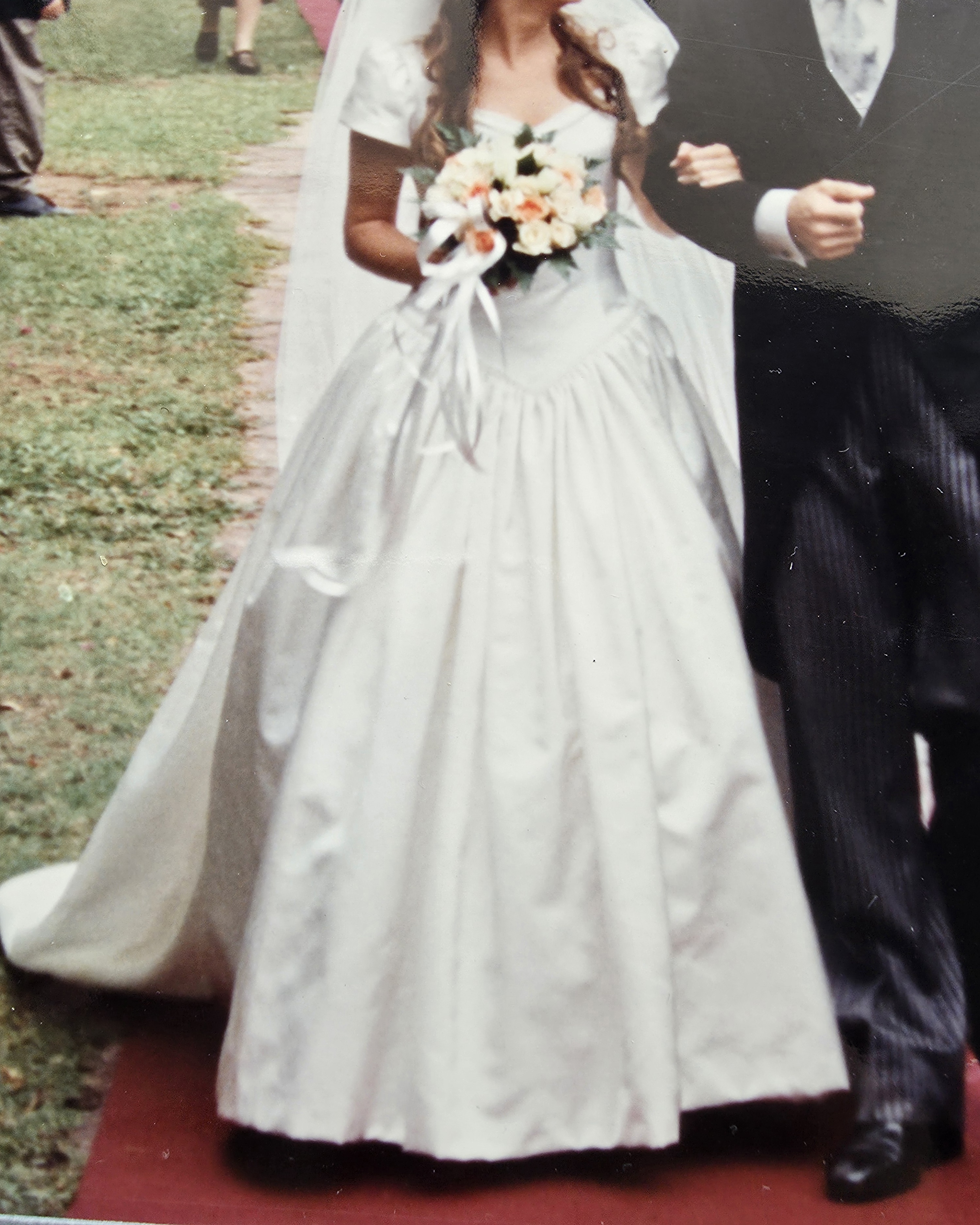 Vestido de novia de seda natural de la firma Adela Roy. Tiene una talla 38 para una mujer de altura 1.60 cm. El vestido marca la cintura hasta la cadera adornada por perlitas, asi como el escote que es cuadrado con pico en el centro también adornado con perlitas, la espalda se cierra con una tira de botones. Es de manga corta . Tiene una cola de 2 metros y un velo de tul de 3.5 metros. La tela de seda natural le da una caída muy elegante de alta costura.