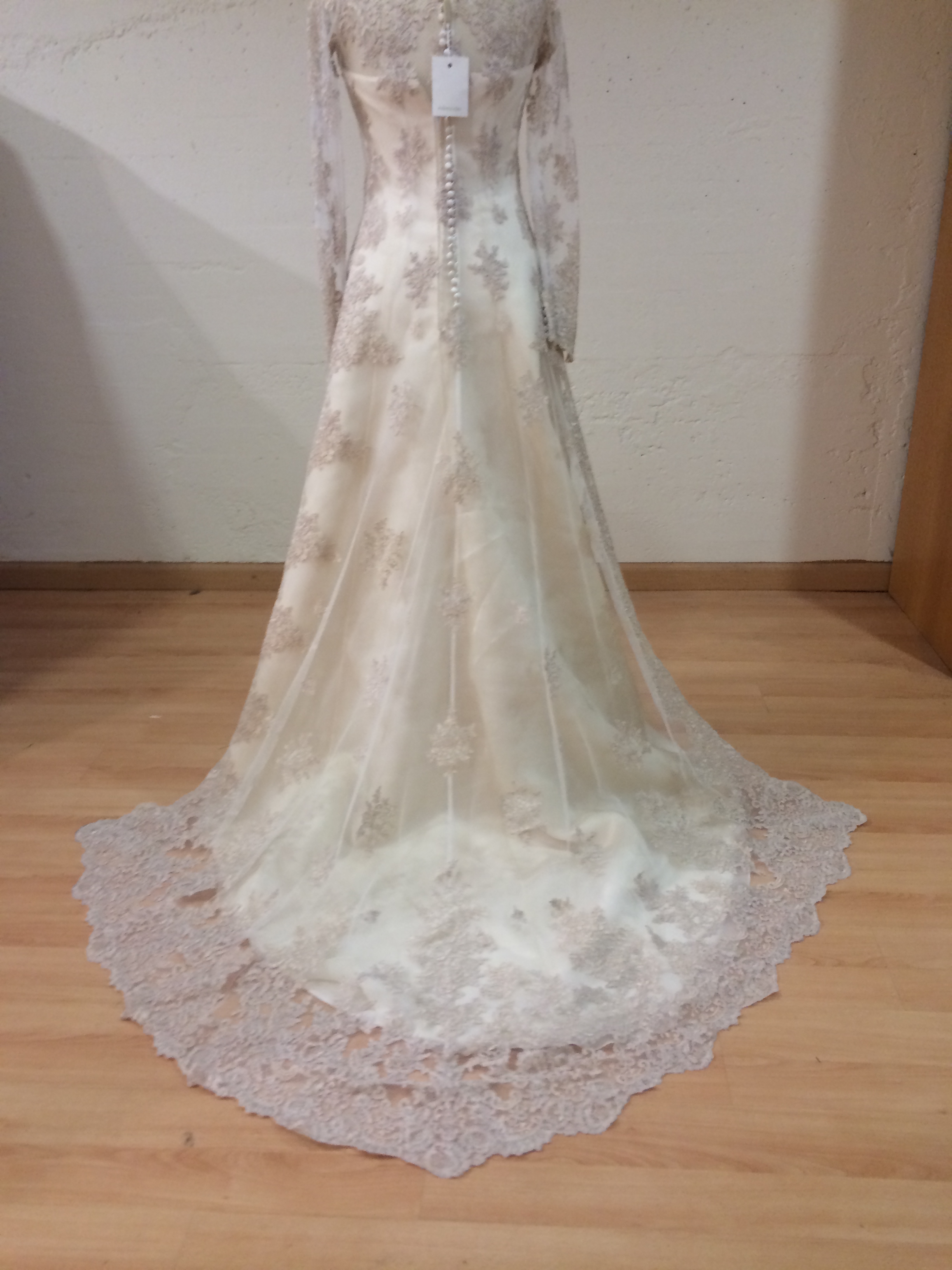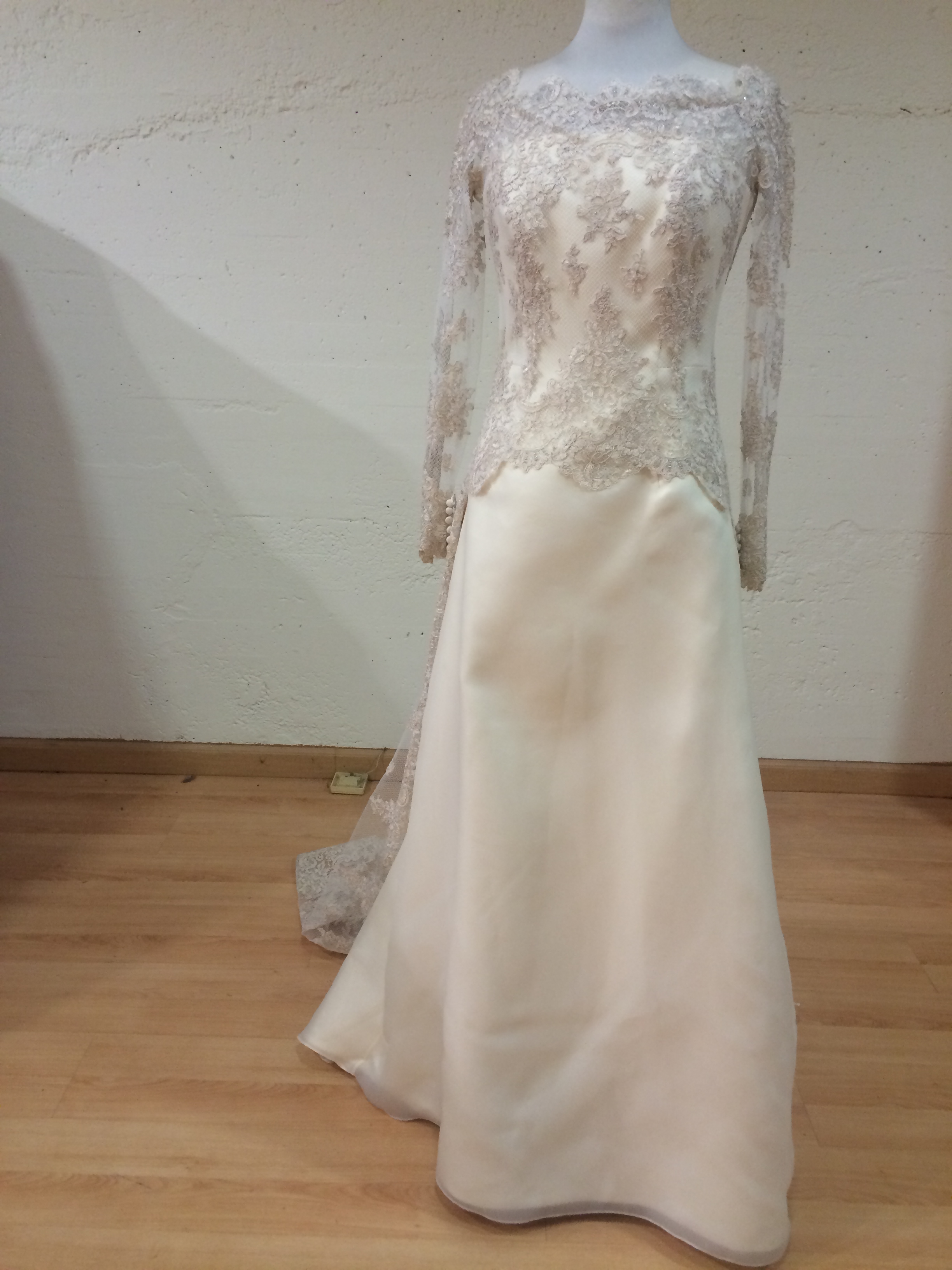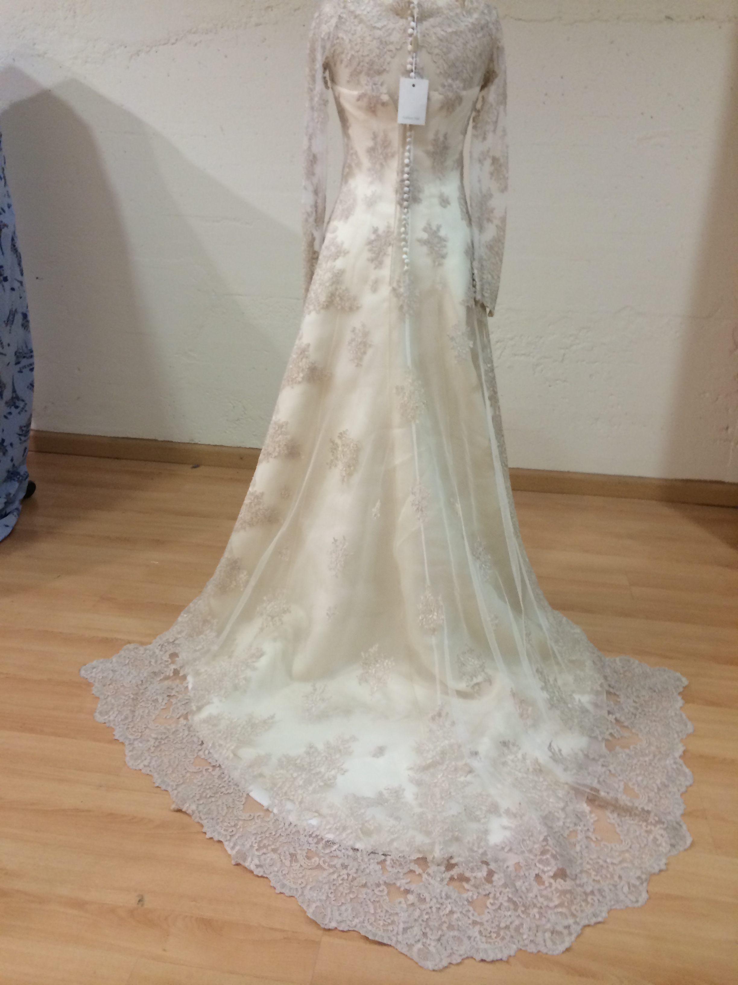 Vestido de novia, de encaje las mangas el cuerpo y la cola. Es suelto, se puede quitar y queda el vestido de organza. Muy elegante