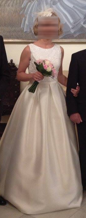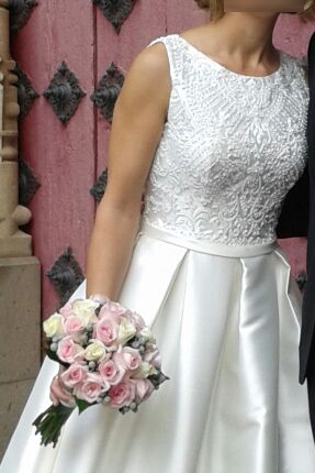 Vestido de mikado bordado y pedreria en color natural. Usado para ceremonia civil. La cola se acortó unos centímetros. El vestido se encuentra en perfectísimo estado.