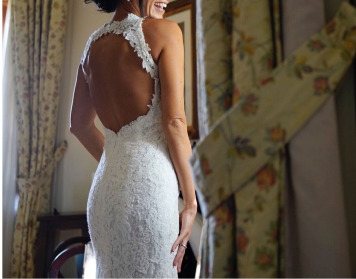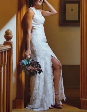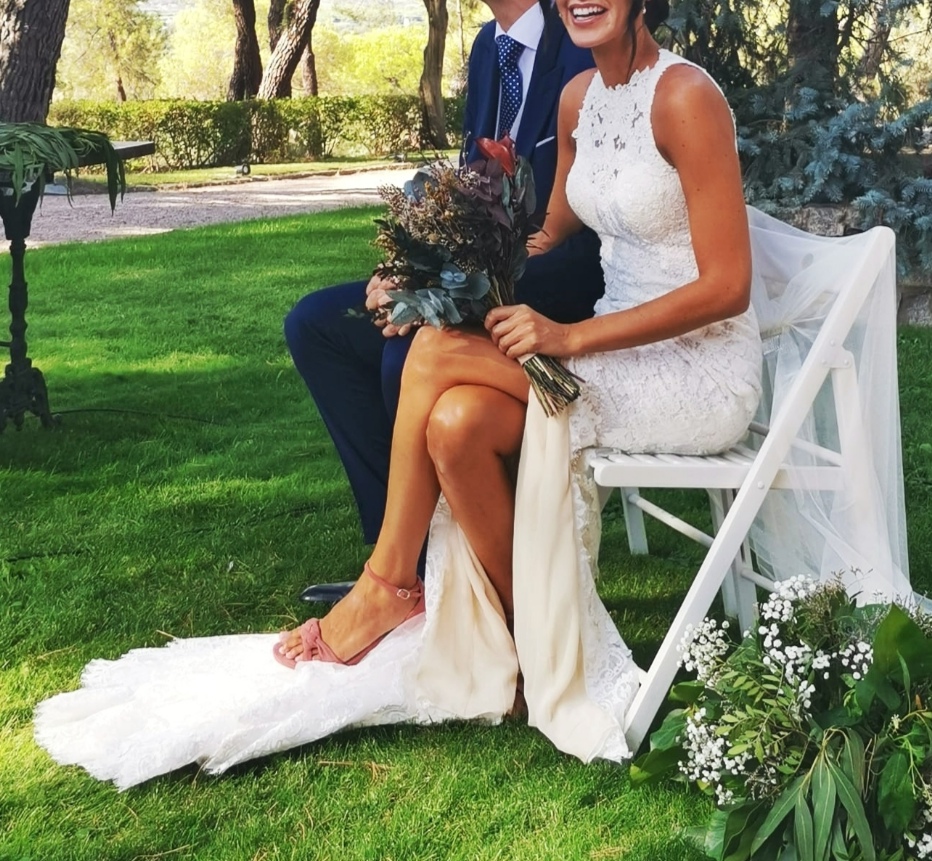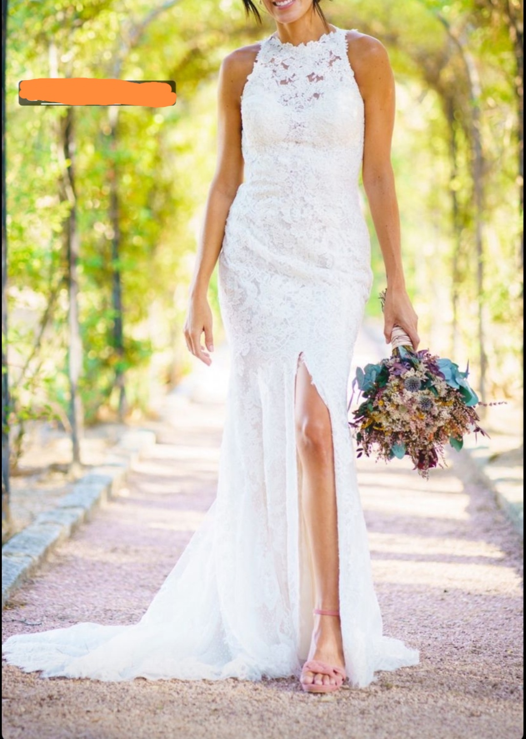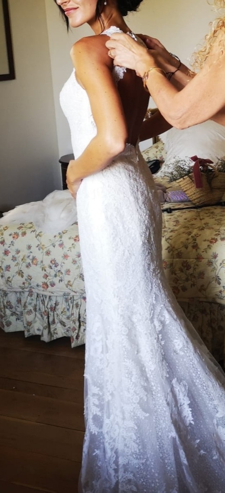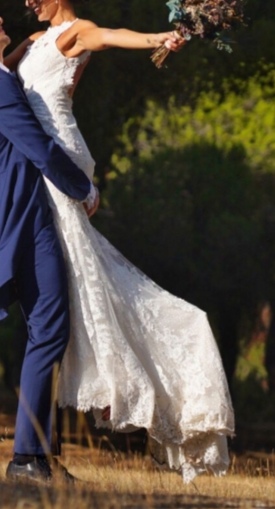 Elegante Aire Barcelona en encaje con cuello halter y abertura en piernas. Tiene cola media y espalda al aire. Es un vestido muy cómodo con posibilidad de arreglo en modista para agrandar, achicar o hacer modificaciones en abertura de piernas, escote y cola. Está en perfecto estado, ha sido cuidado con mucho mimo. Lleva cazuelitas de quita y pon para no tener que llevar sujetador. Puedo ampliar información, vídeos y fotos.