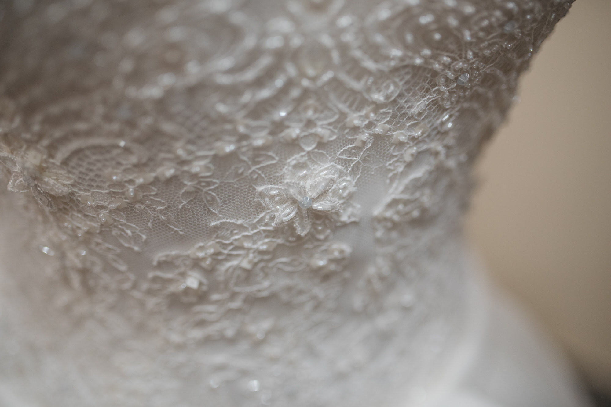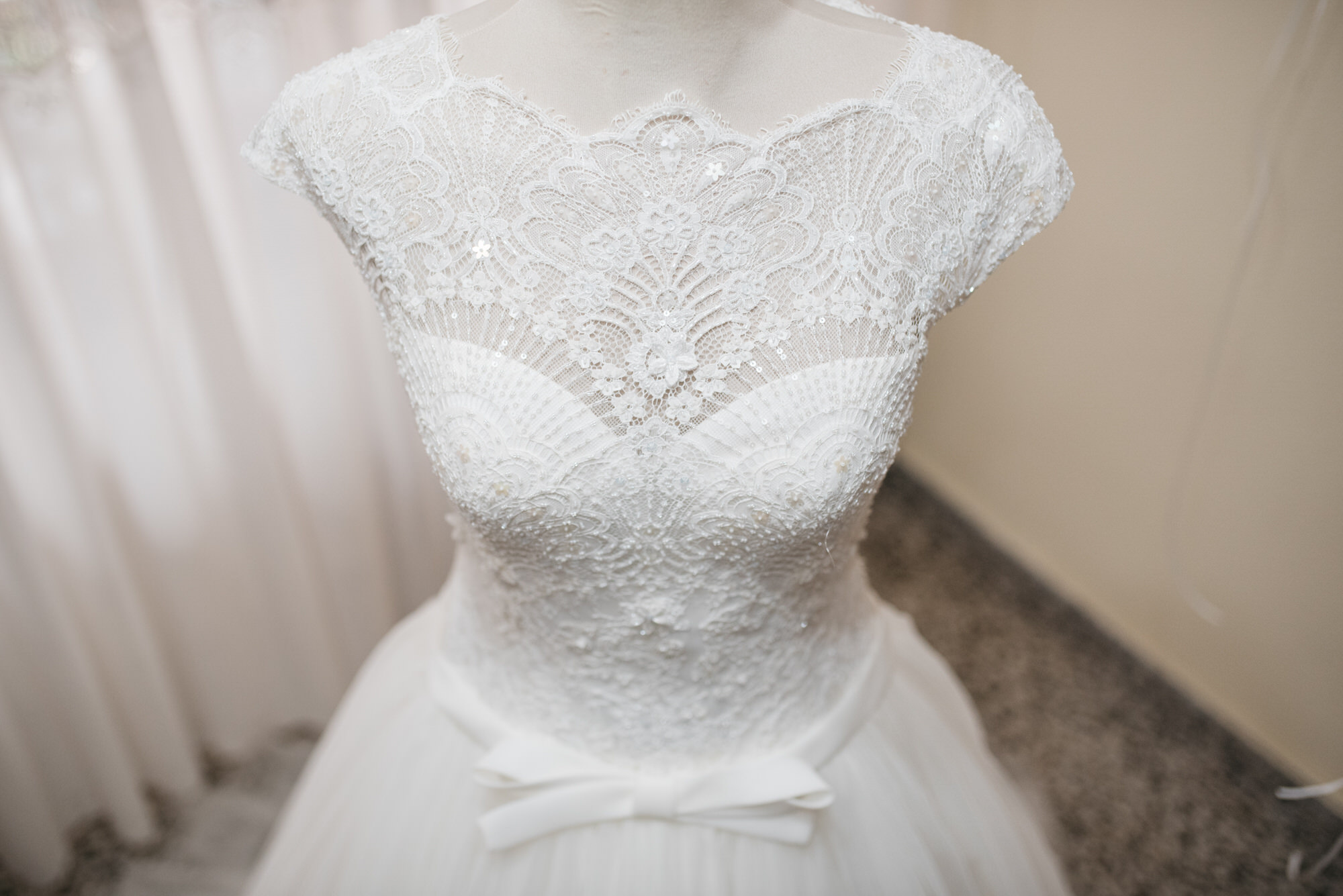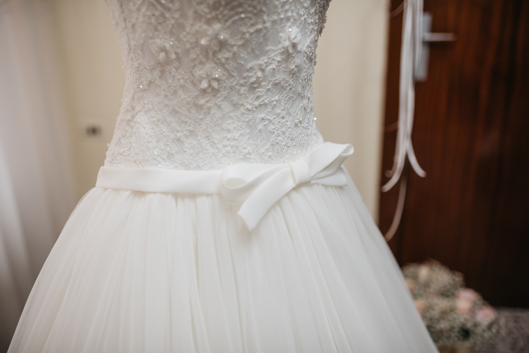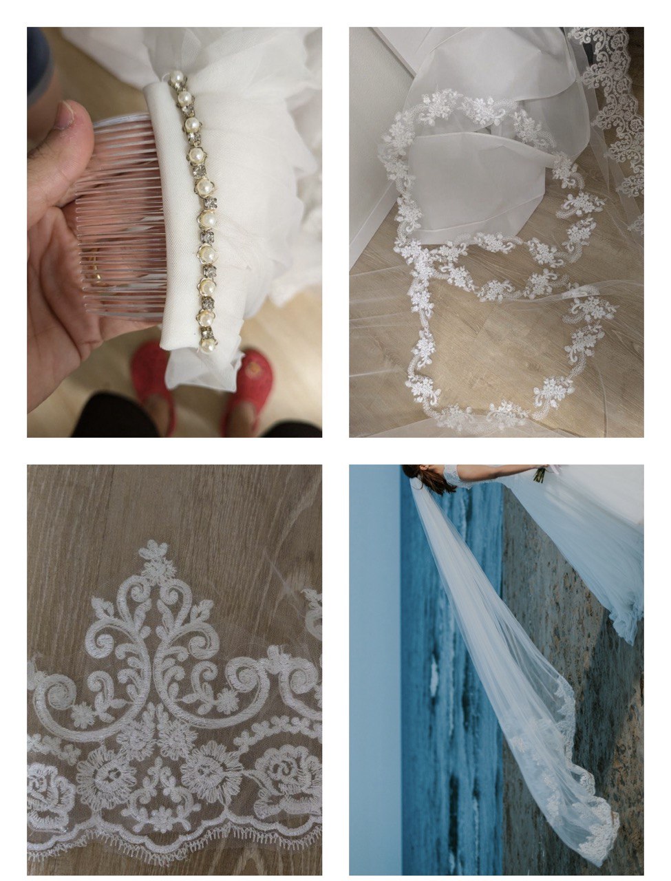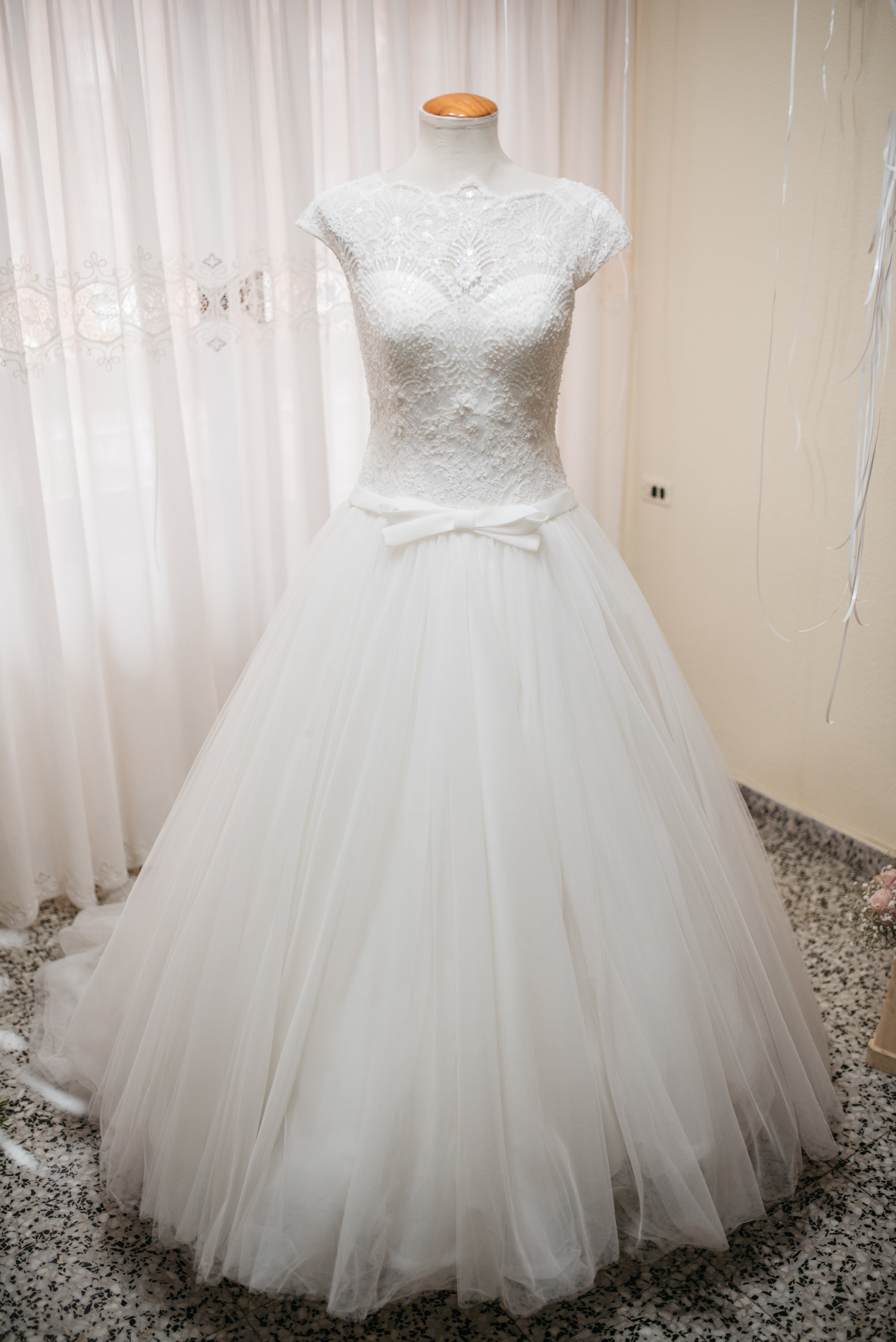 El vestido cuenta con un cuerpo de encaje bordado con finisimos cristales y la falda de tul con un poco de cola. Incluye cancán y también un velo de encaje con diseño de 3 metros incluido en el precio.
