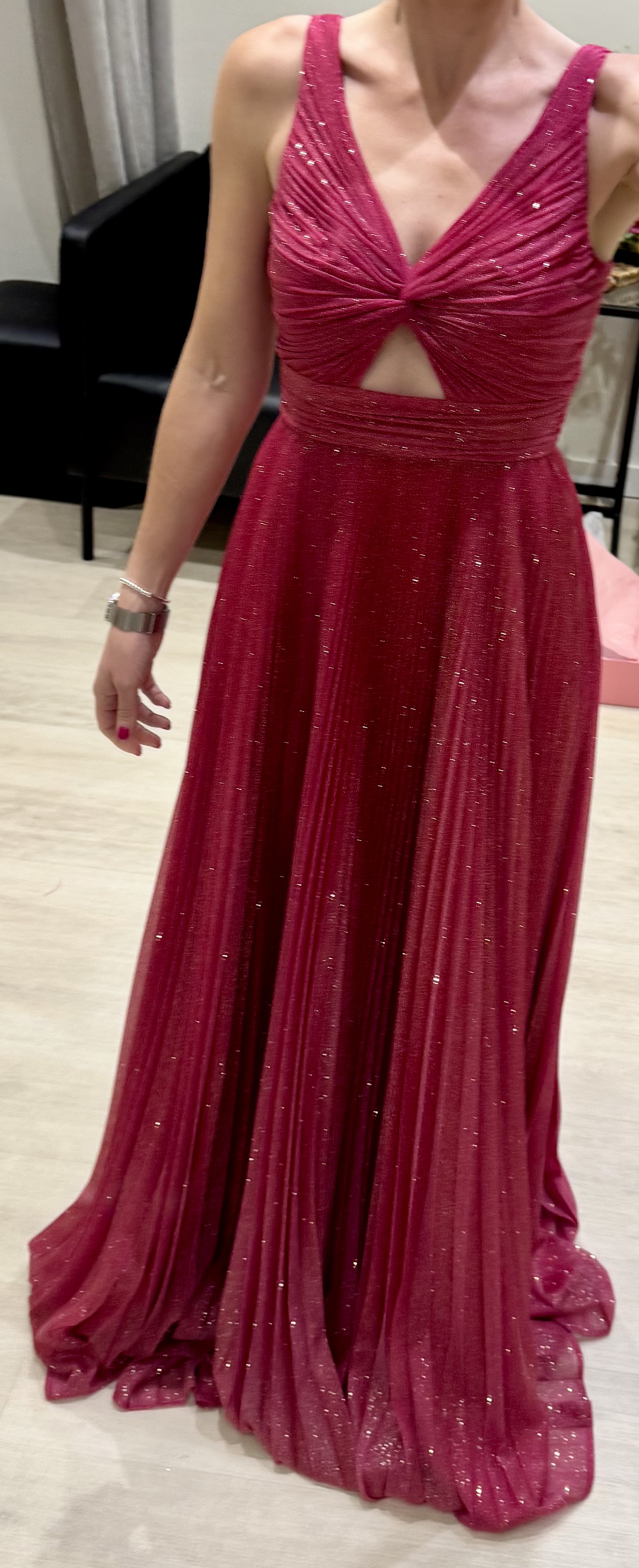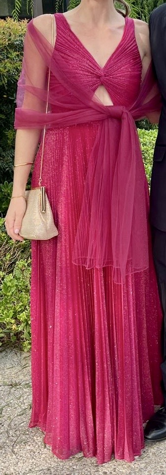 Vestido de gala largo y estilo moderno. Elaborado con lurex rosa y dorado. Escote V espalda abierta y tirantes.