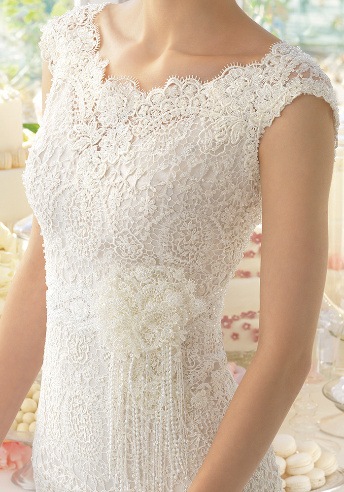 Fino vestido de novia de Aire Barcelona, de tejido guipur con pedrería.