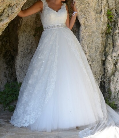 Vestido Montreal de encaja y pedreria de la colección de Aire Barcelona. La talla está entre 38-40. El vestido es todo de encaje y se abre en el centro con tul debajo. El escote es de corazon y el cinturón es añadido con piedras de swarovski. La espalda es escotada en forma de V. Tengo más fotos y se puede ver y probar sin compromiso. Solo tiene un uso y es del año 2016. Precio negociable.