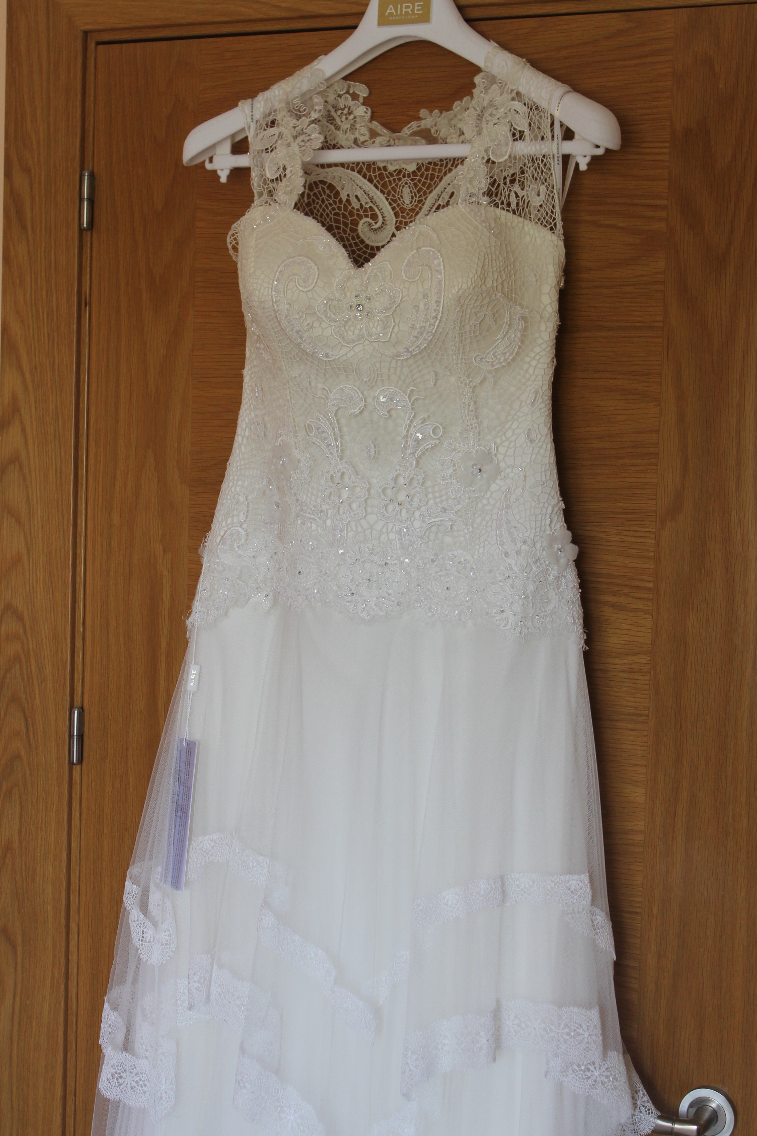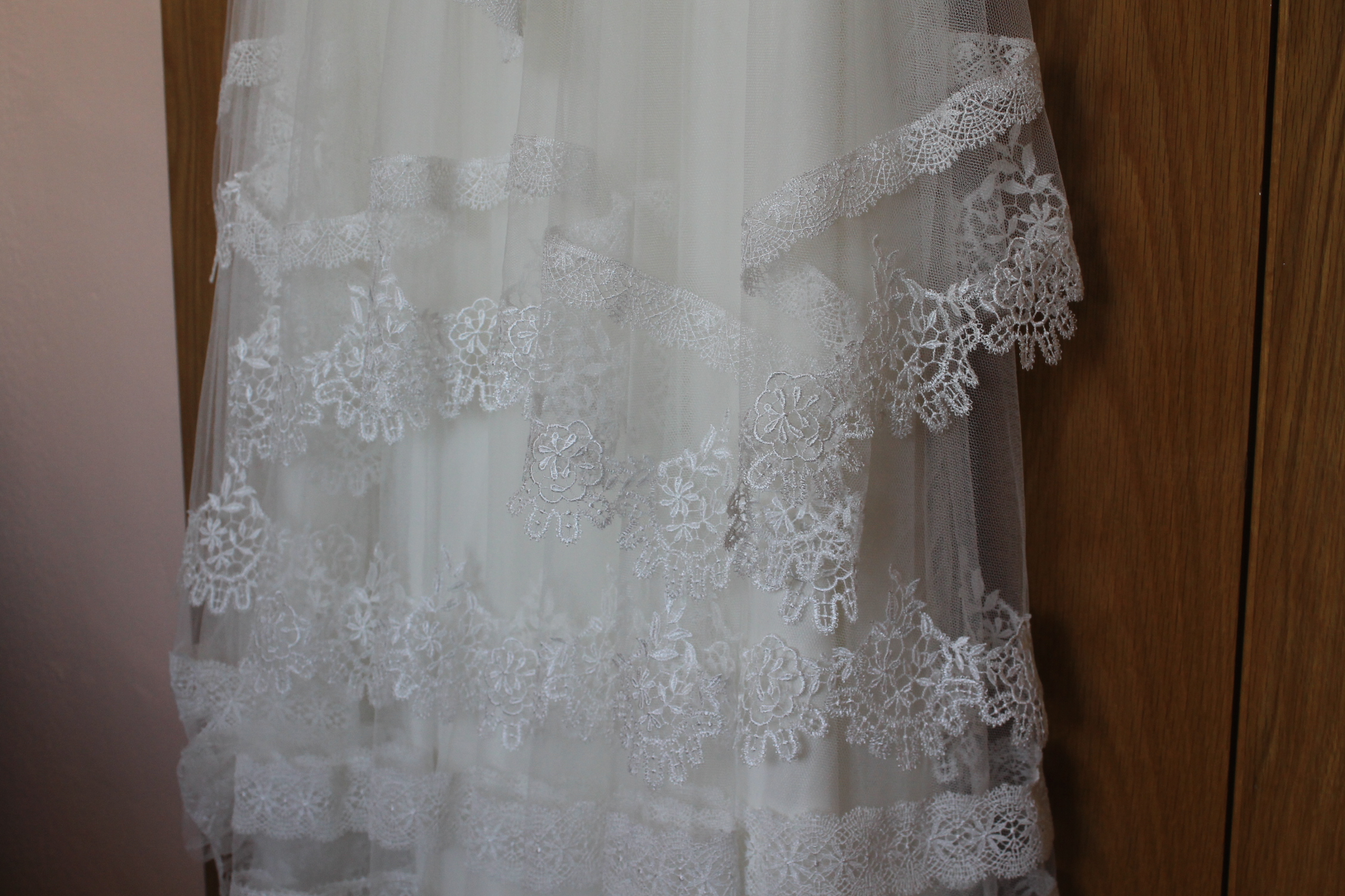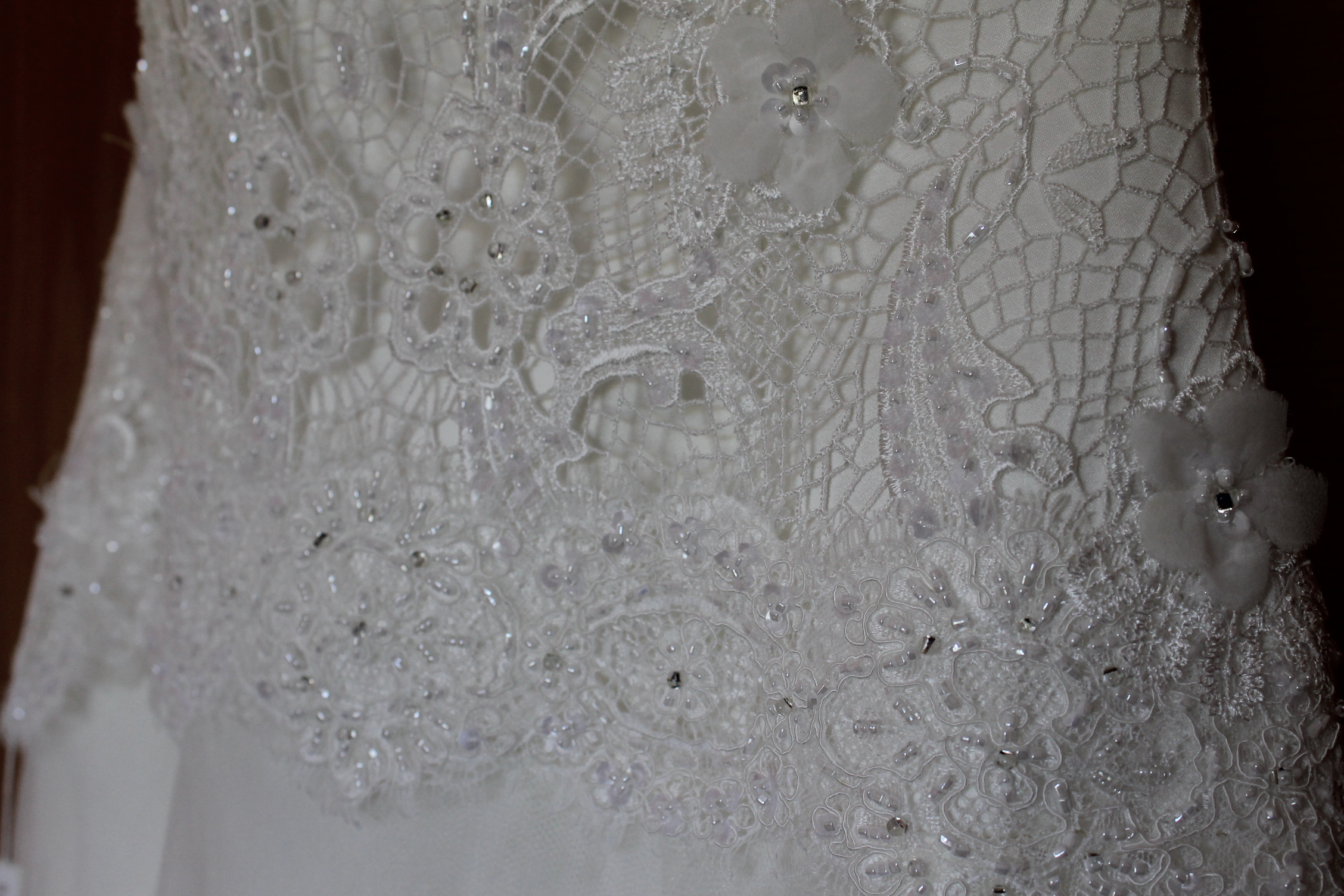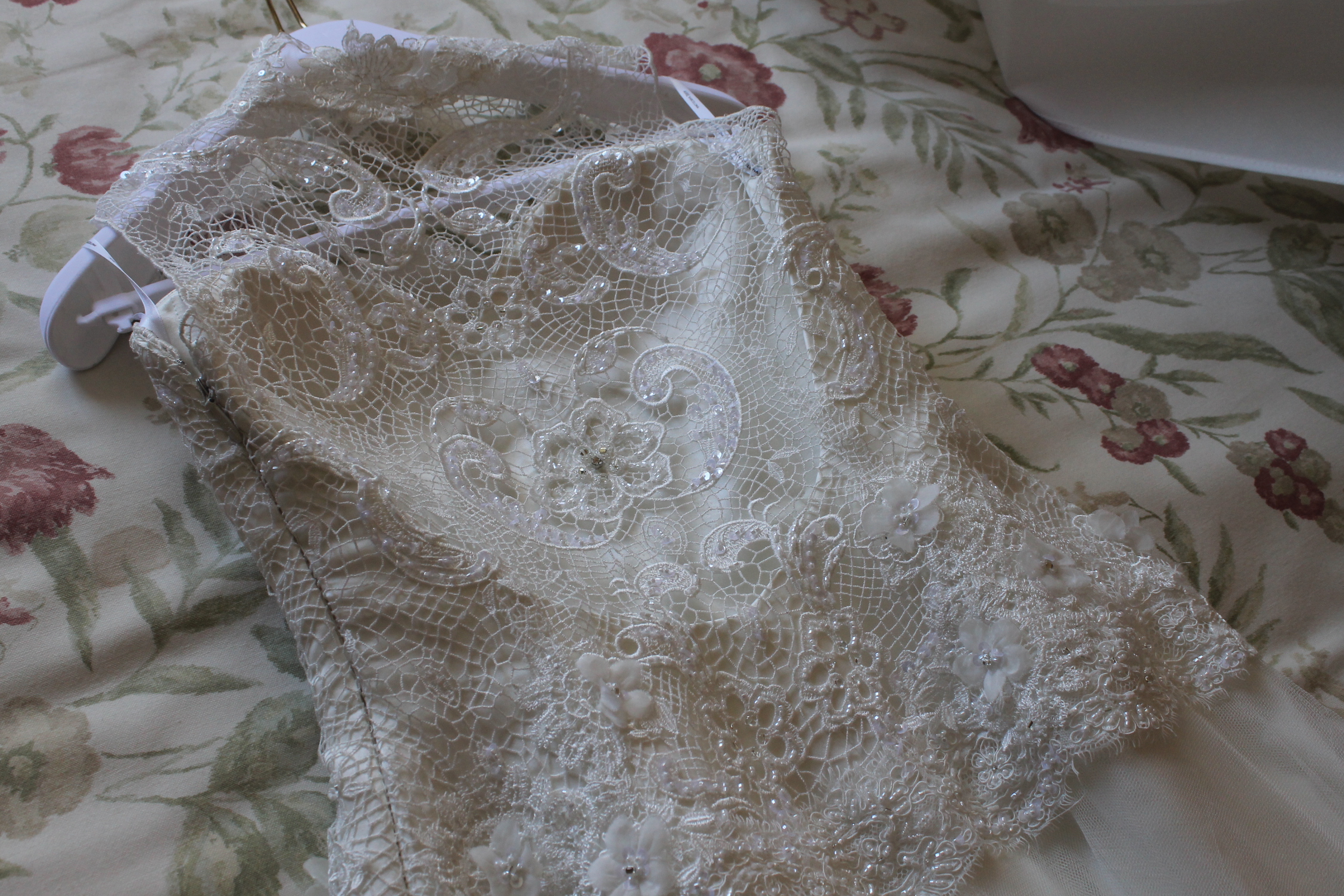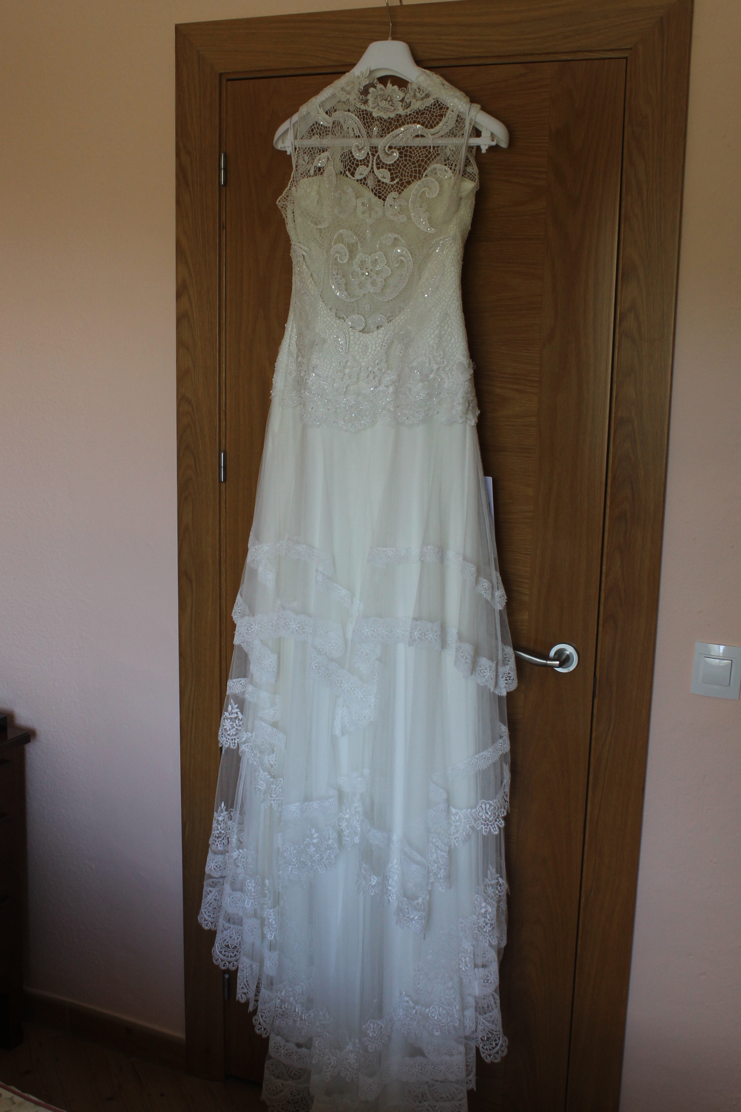 Es un vestido precioso, mucho más de lo que se aprecia en las fotos. El cuerpo es de guipur con flores de organza y detalles de pedrería muy fina, la falda de tul de seda con remates de encaje en cada volante.