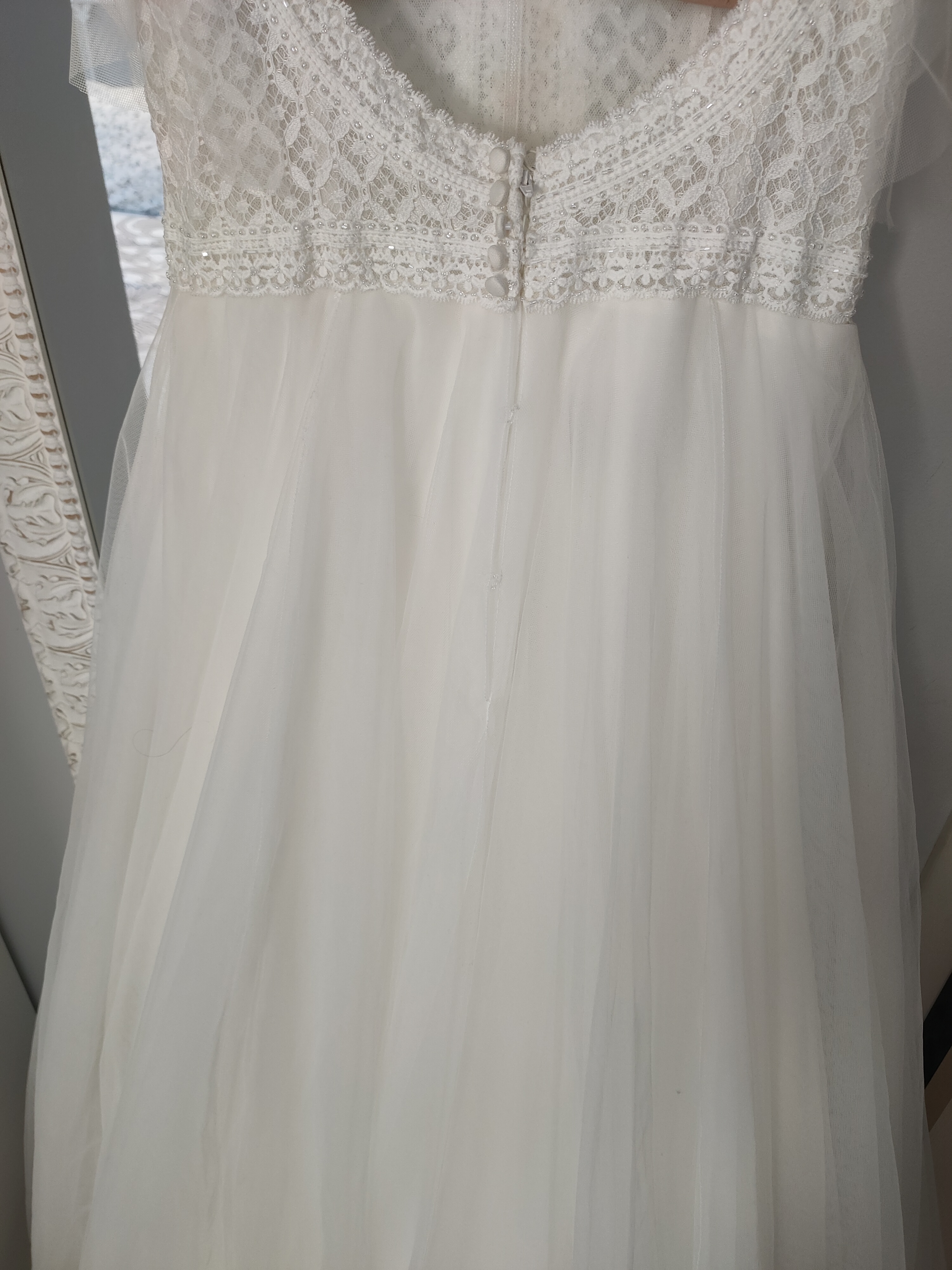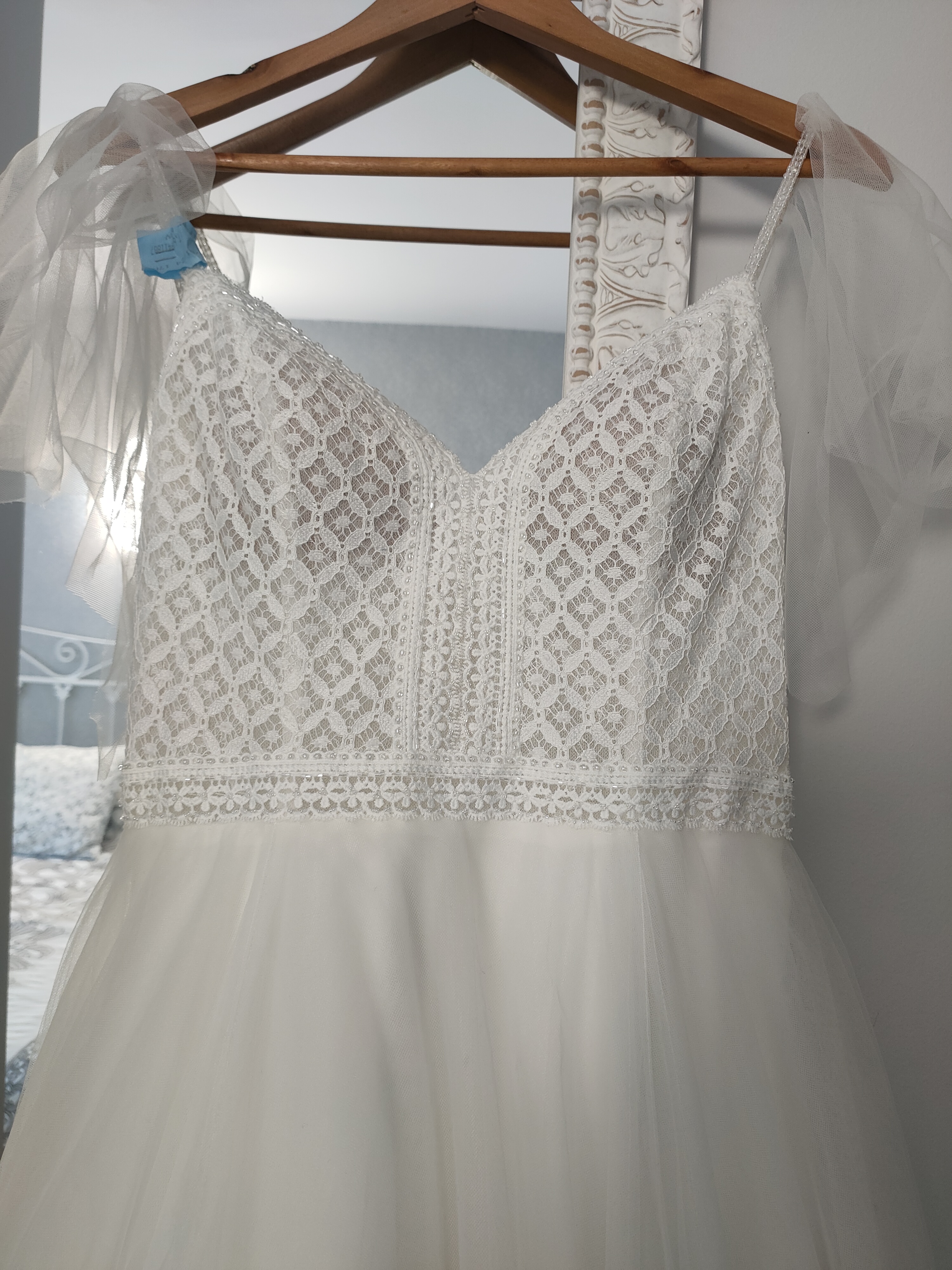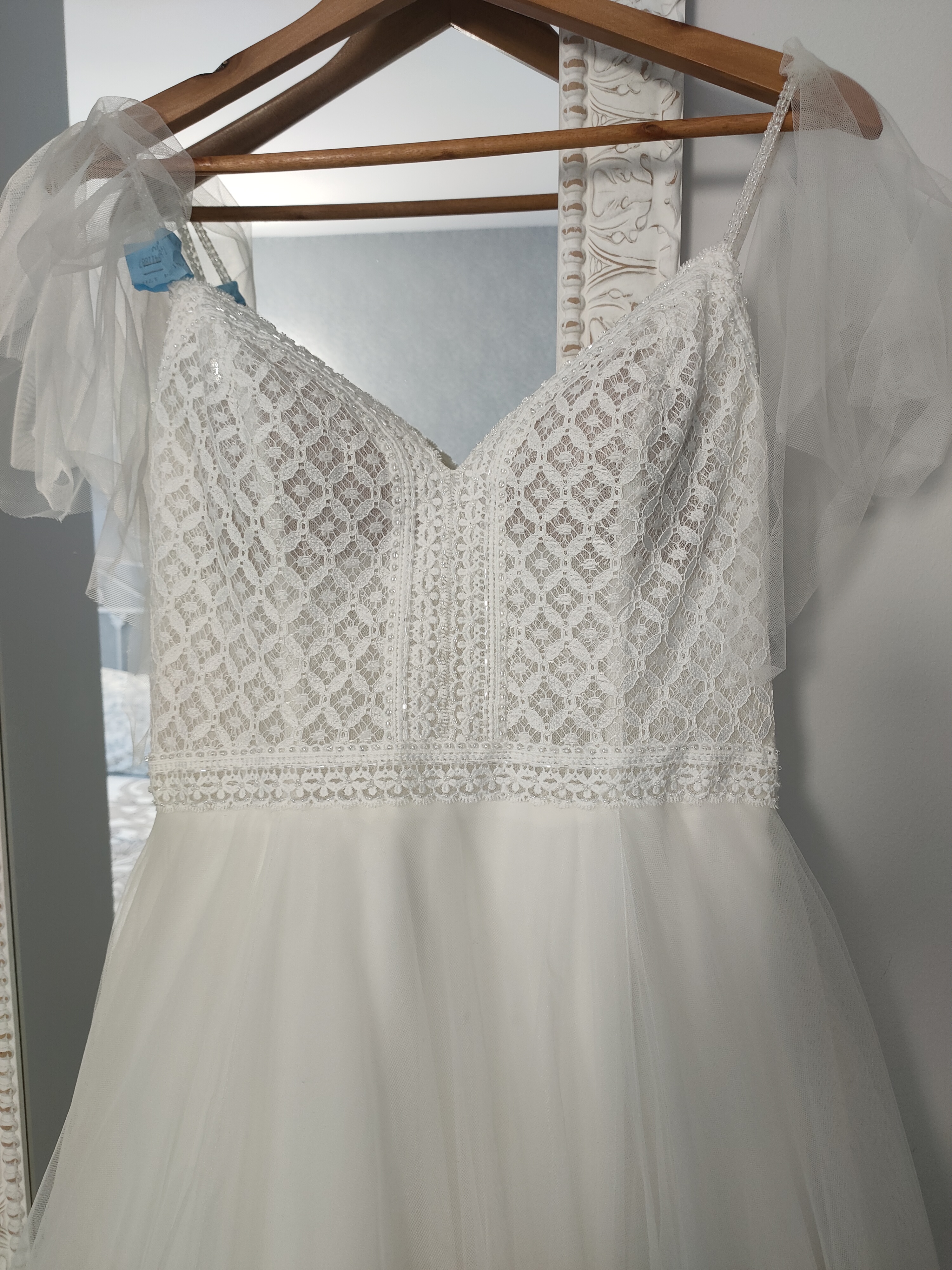Vestido de novia “Alma Mónaco”, segunda marca de Rosa Clará. Estilo bohemio, princesa, romántico. Comprado en julio del 2023. El color del vestido es blanco marfil, la parte de arriba es de guipur, con tirantes y con un ligero toque brillante. Cada tirante lleva un tul igual que la falda; el tul de cada tirante se puede quitar. Espalda descubierta con botones en la parte baja de la espalda, la falda es de tul con capas y forro. Aún lleva la etiqueta de la lavandería, está impecable. Vestido muy cómodo de llevar y muy favorecedor.