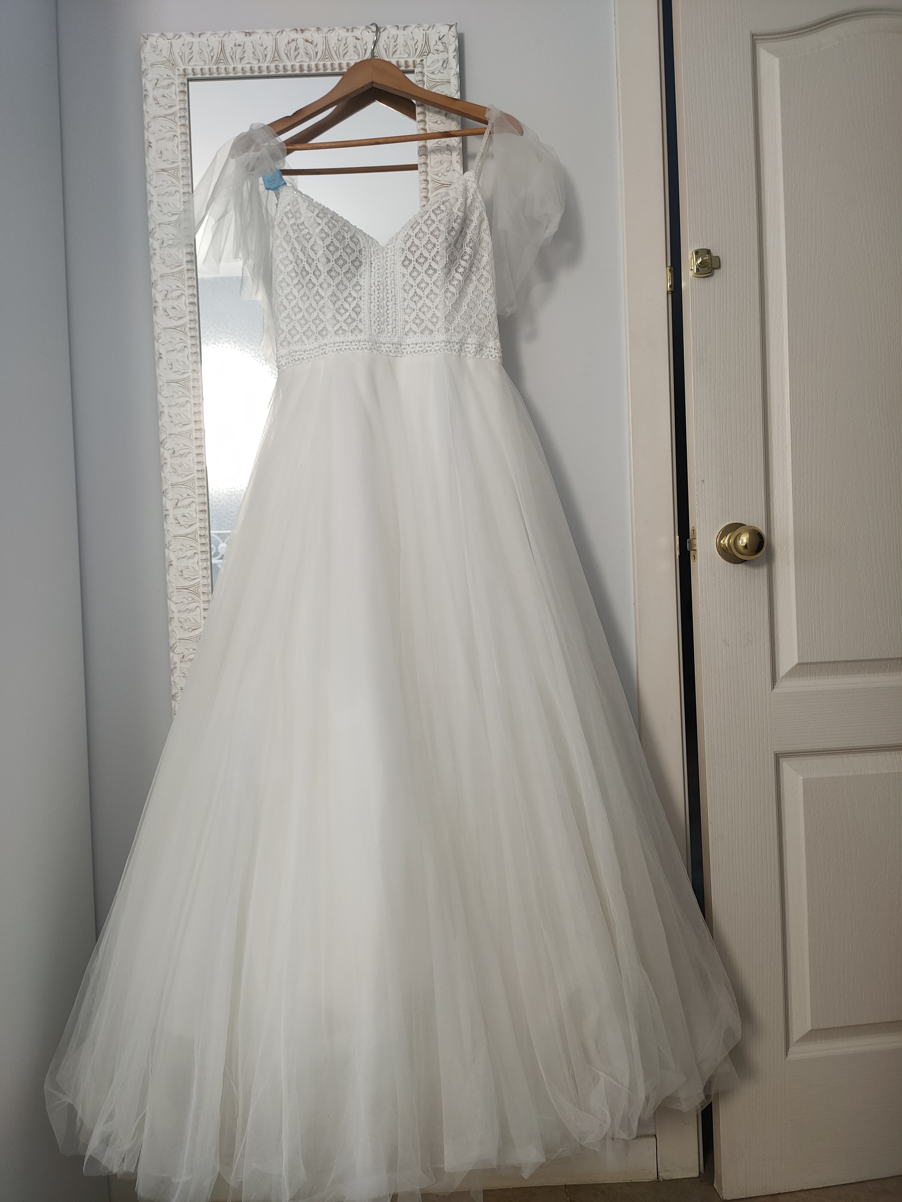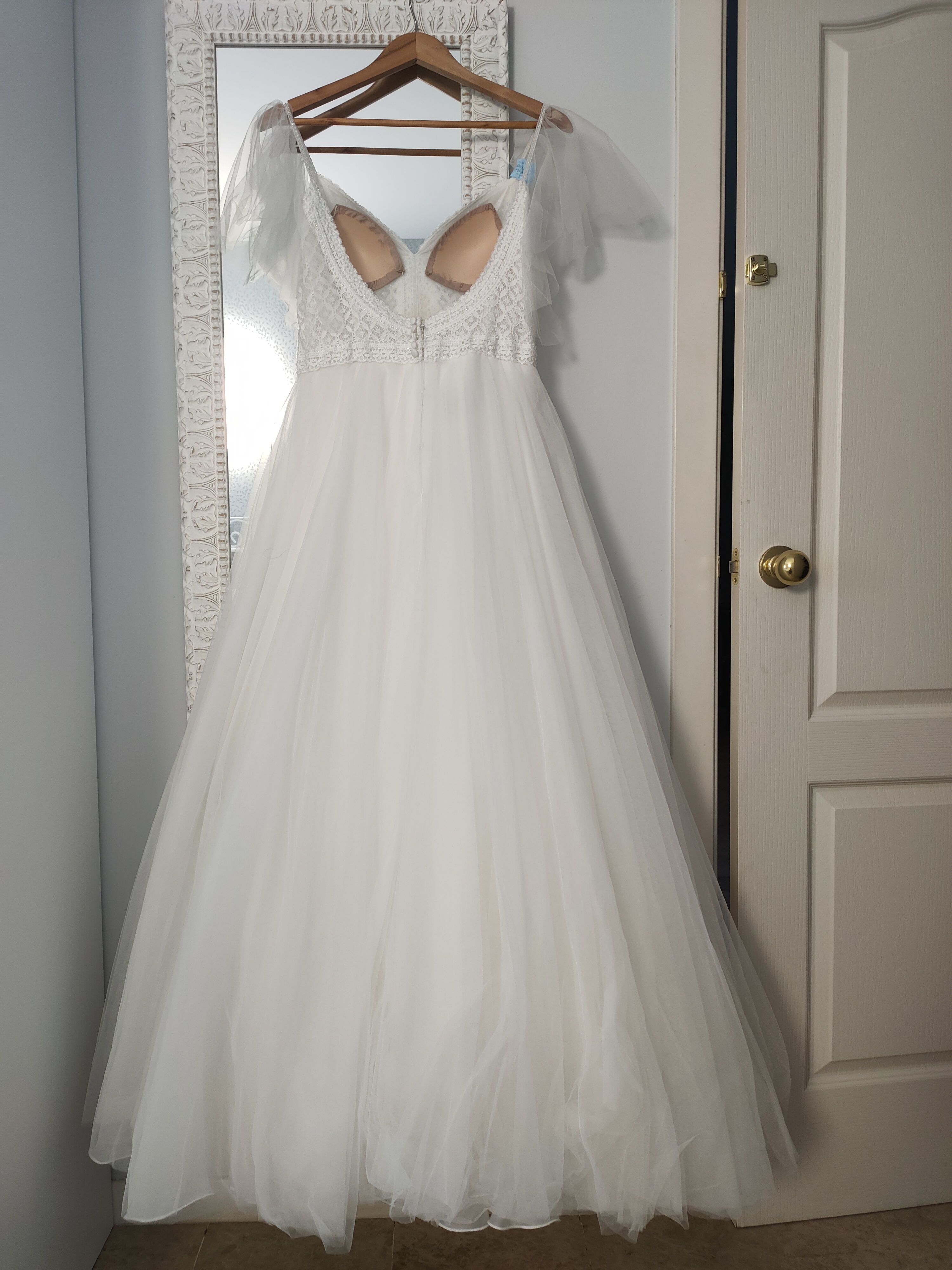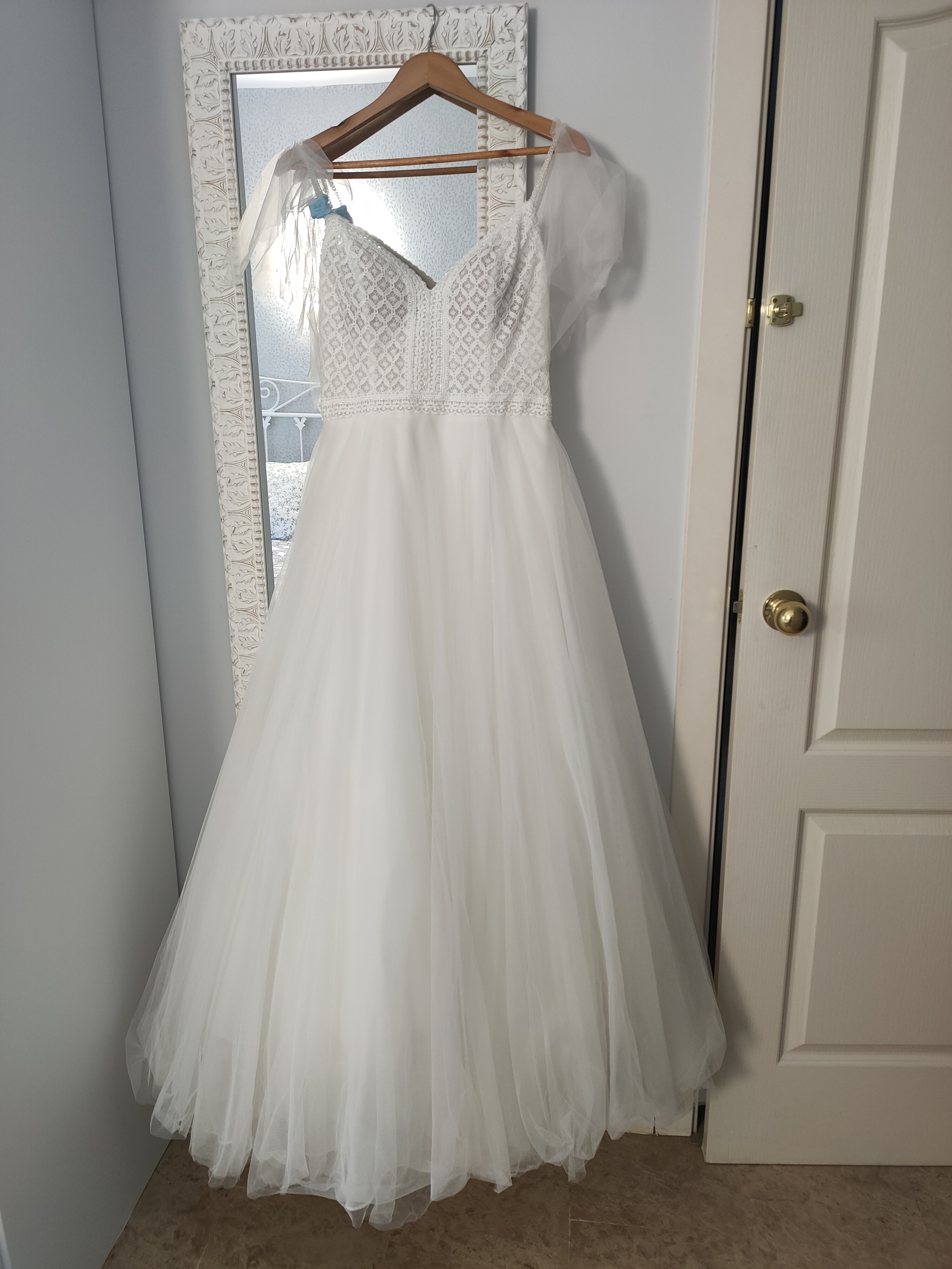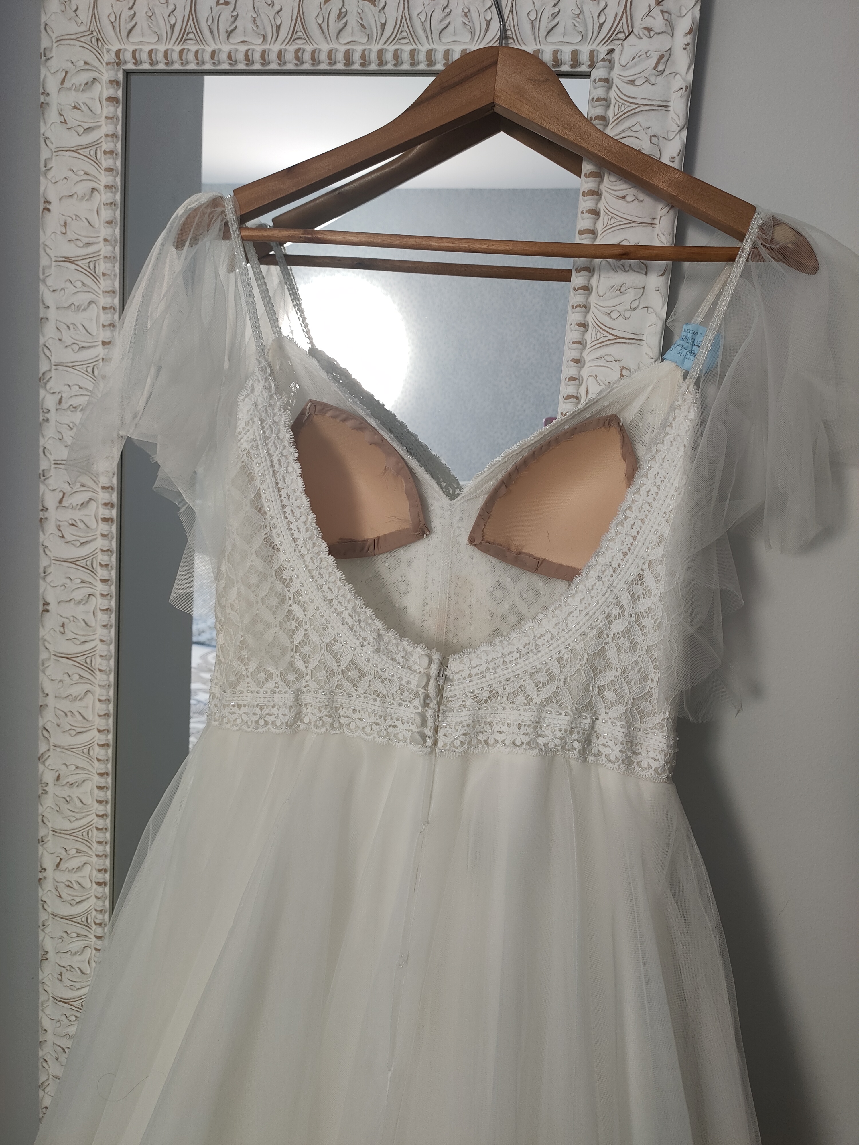 Vestido de novia “Alma Mónaco”, segunda marca de Rosa Clará. Estilo bohemio, princesa, romántico. Comprado en julio del 2023. El color del vestido es blanco marfil, la parte de arriba es de guipur, con tirantes y con un ligero toque brillante. Cada tirante lleva un tul igual que la falda; el tul de cada tirante se puede quitar. Espalda descubierta con botones en la parte baja de la espalda, la falda es de tul con capas y forro. Aún lleva la etiqueta de la lavandería, está impecable. Vestido muy cómodo de llevar y muy favorecedor.