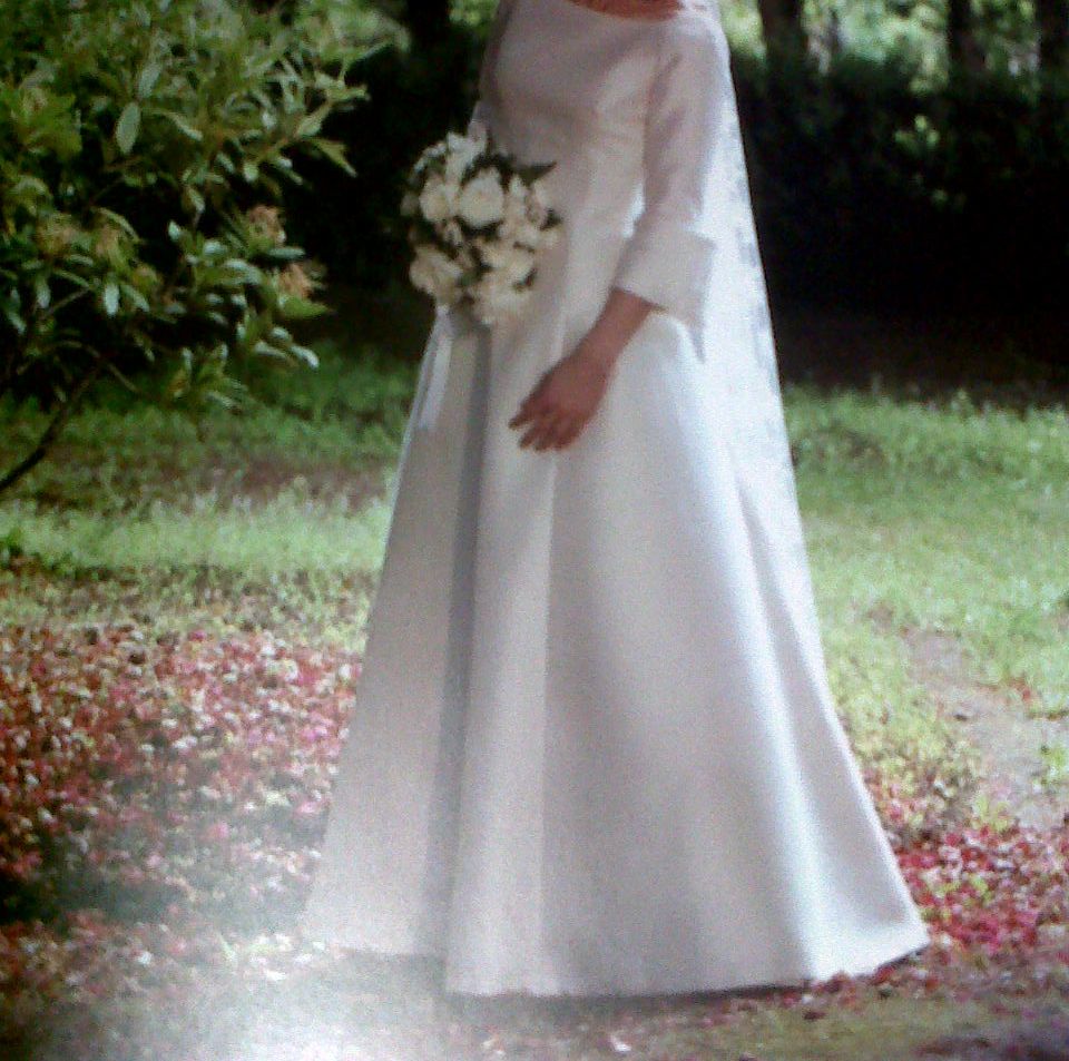 Vestido de novía de la colección BALENCIAGA, unión de elegancia y sobriedad.El vestido de novía es de mikado seda natural con textura ligeramente granulada, con cuerpo y buenacaida, con manga y escote barco, corte en A.