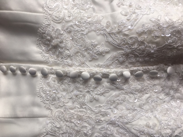 -Tiene un Cierre en la espalda con aplicación de botones cerrados con tela de raso.