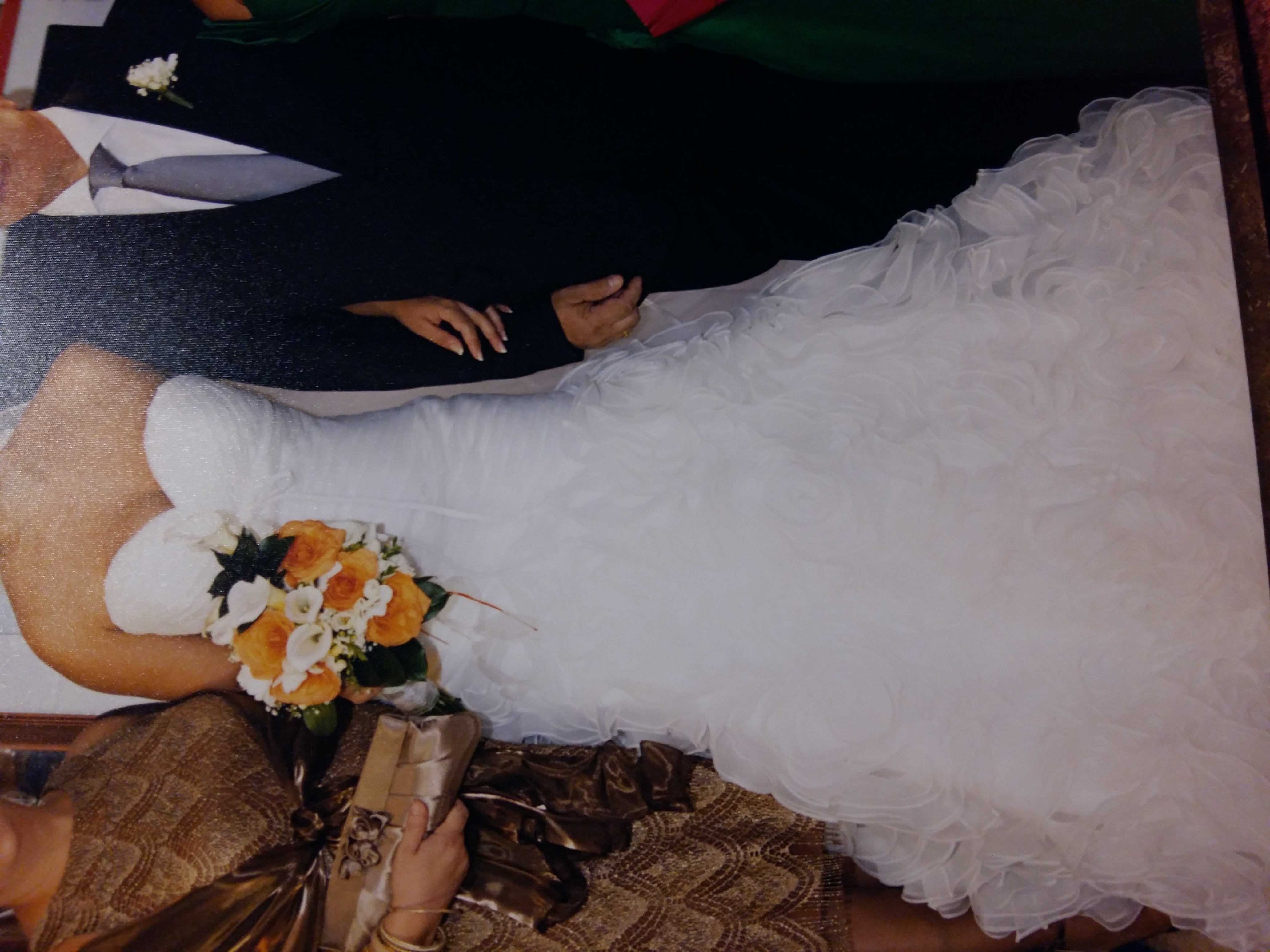 Vestido de rosa clara en blanco forma de corazón y volantes en forma de rosa.talla 42 ajustable a más pequeño.lo vendo también con el velo