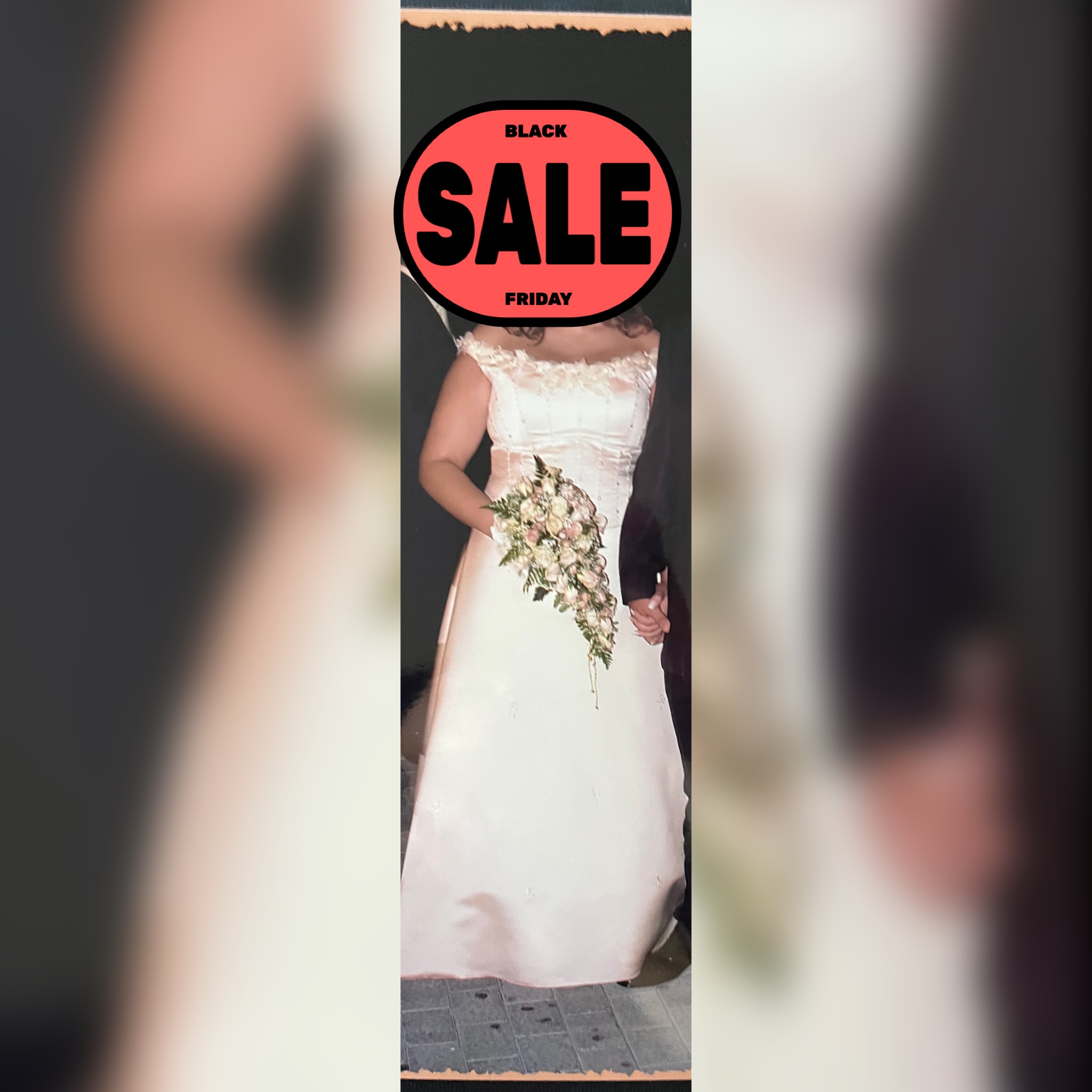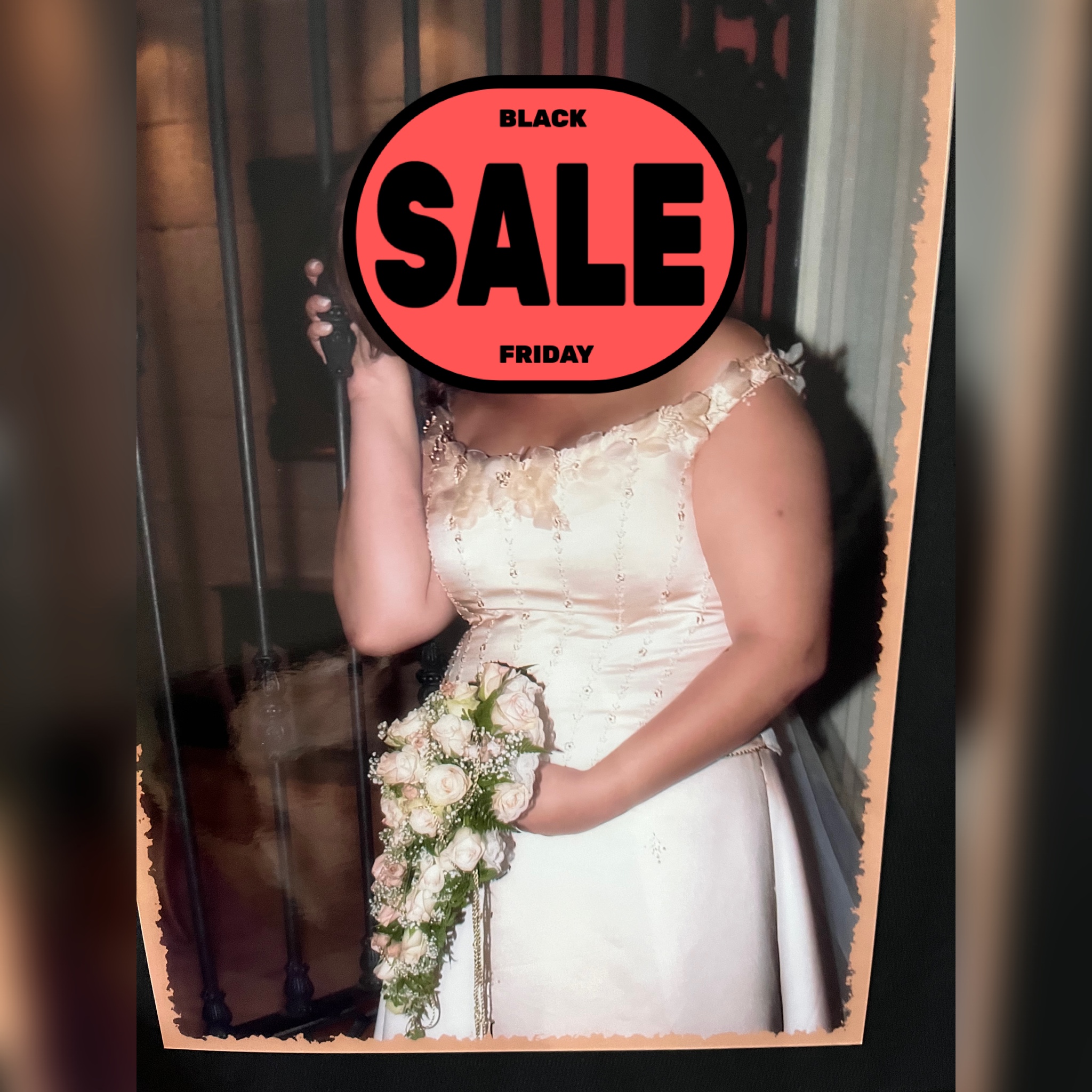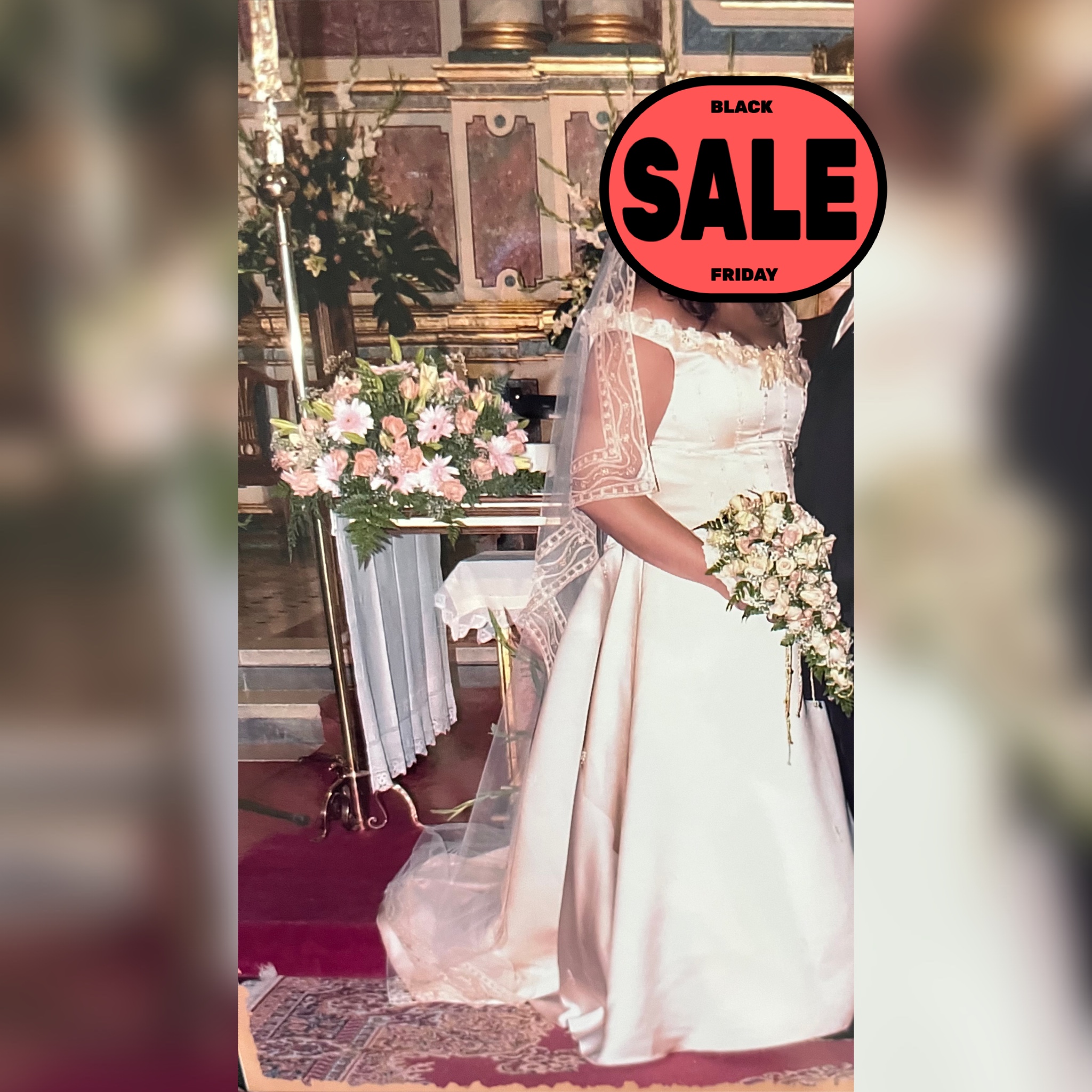 Precioso vestido en tono marfil/oro con precioso escote que realza figura. Espalda anudada.Se vende con cancan y opcional el velo (3 metros con ribetes en dorado)
