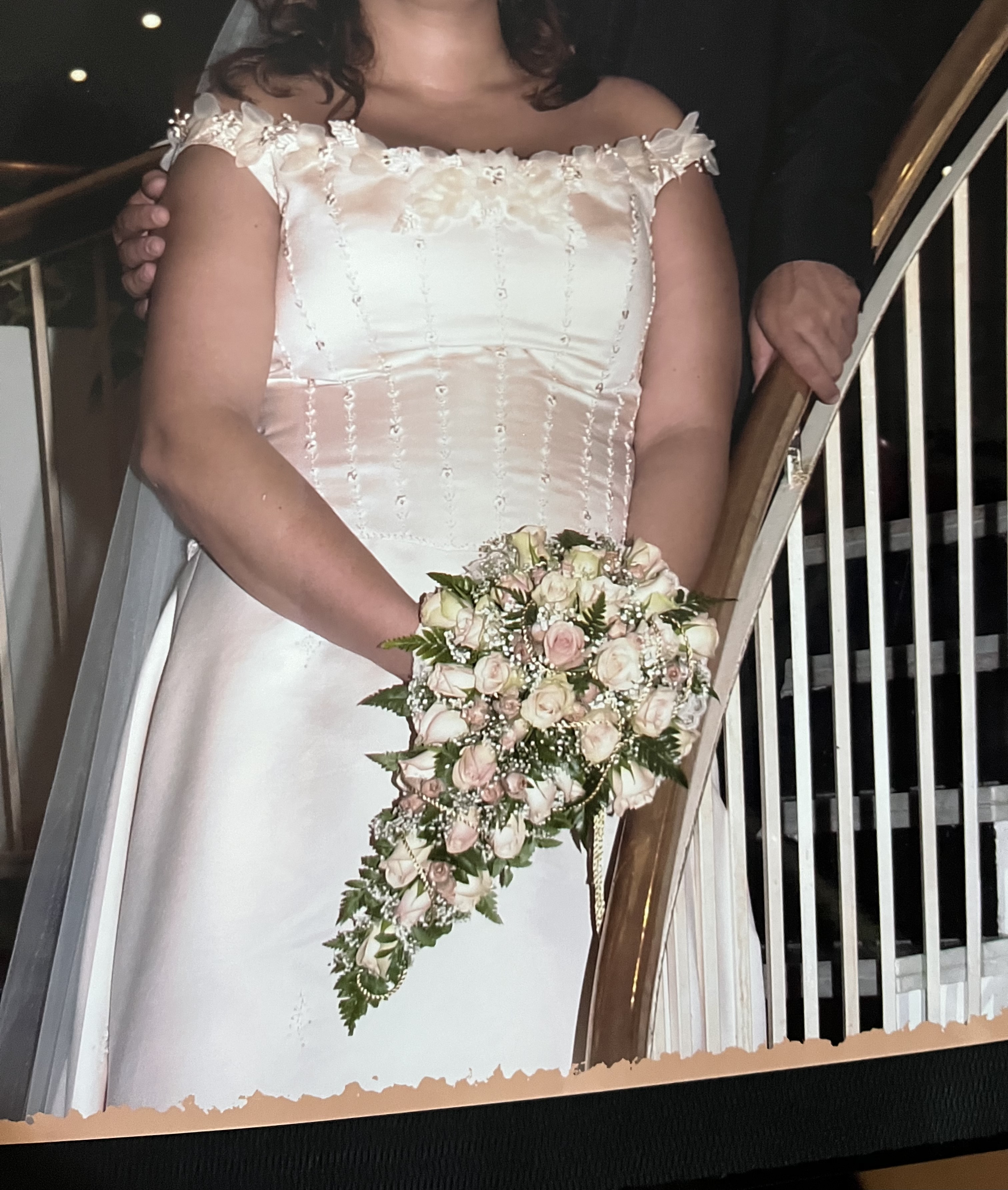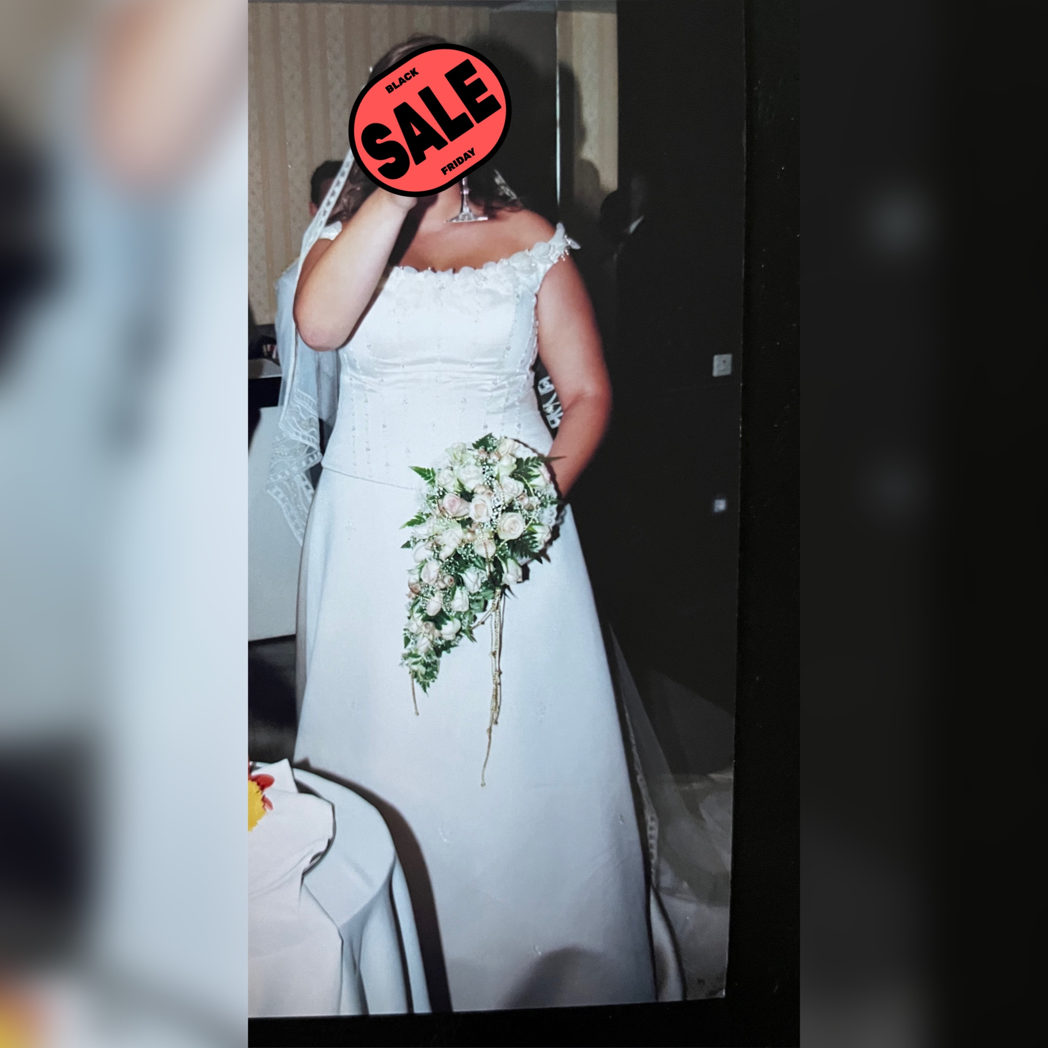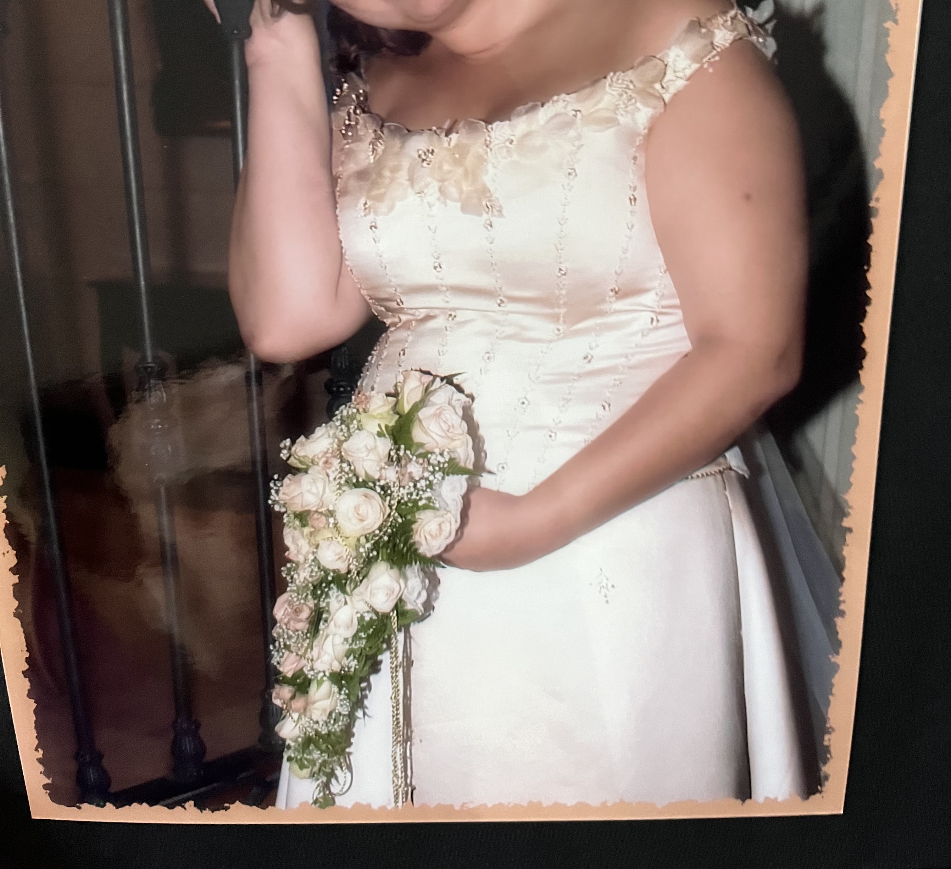 Precioso vestido en tono marfil/oro con precioso escote que realza figura. Espalda anudada.Se vende con cancan y opcional el velo (3 metros con ribetes en dorado)