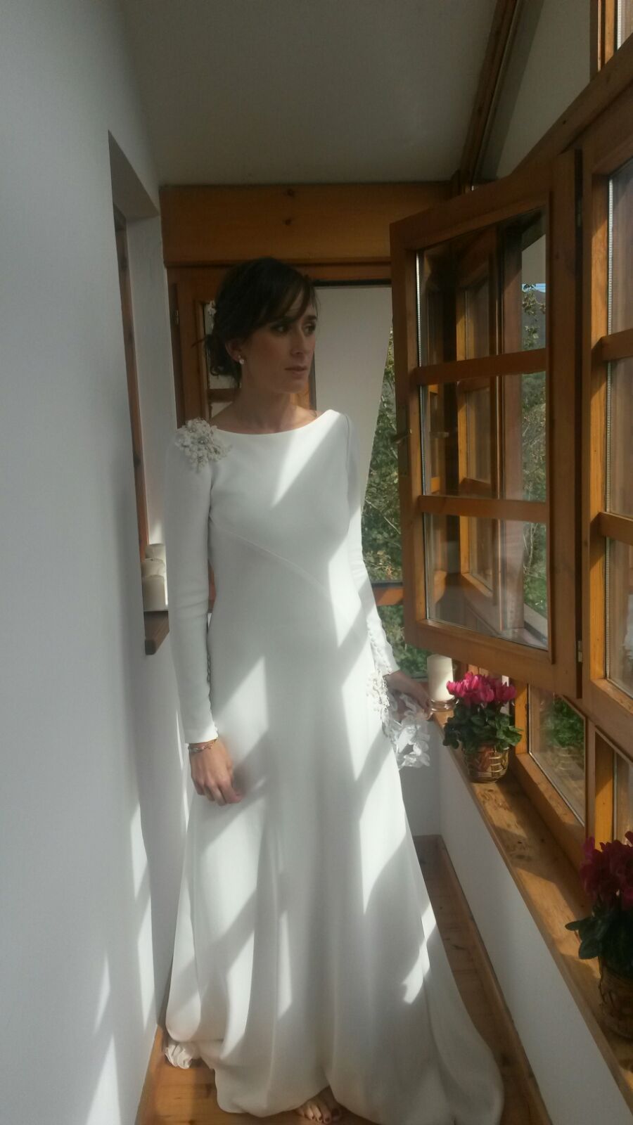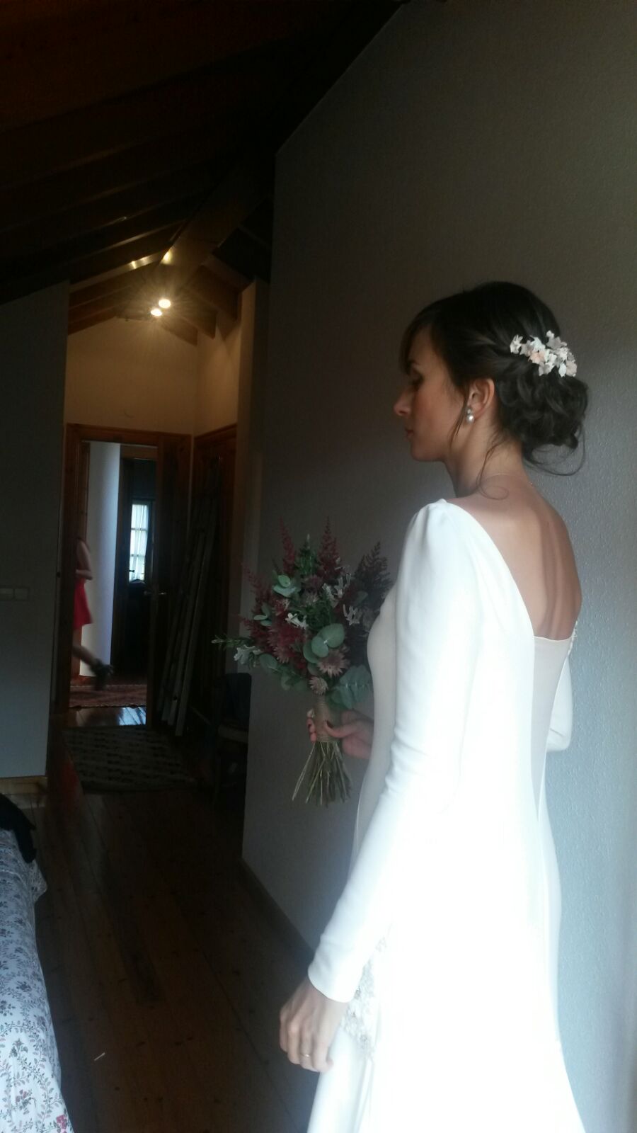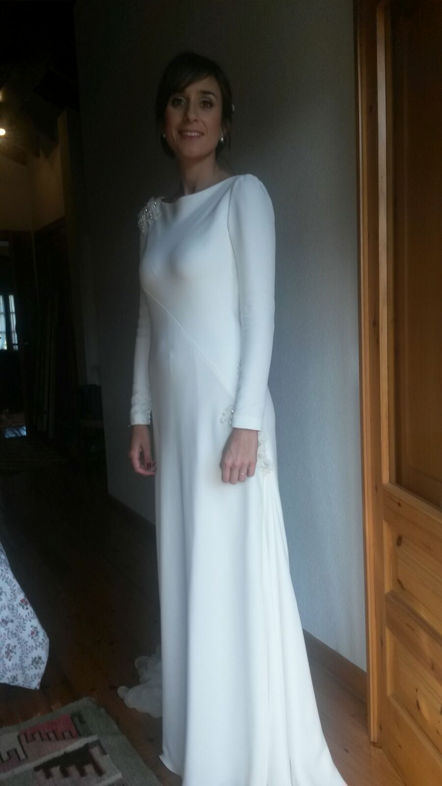 Vestido de novia hecho a medida. Sencillo y sin mucha cola. Tiene escote en la espalda en forma de V.