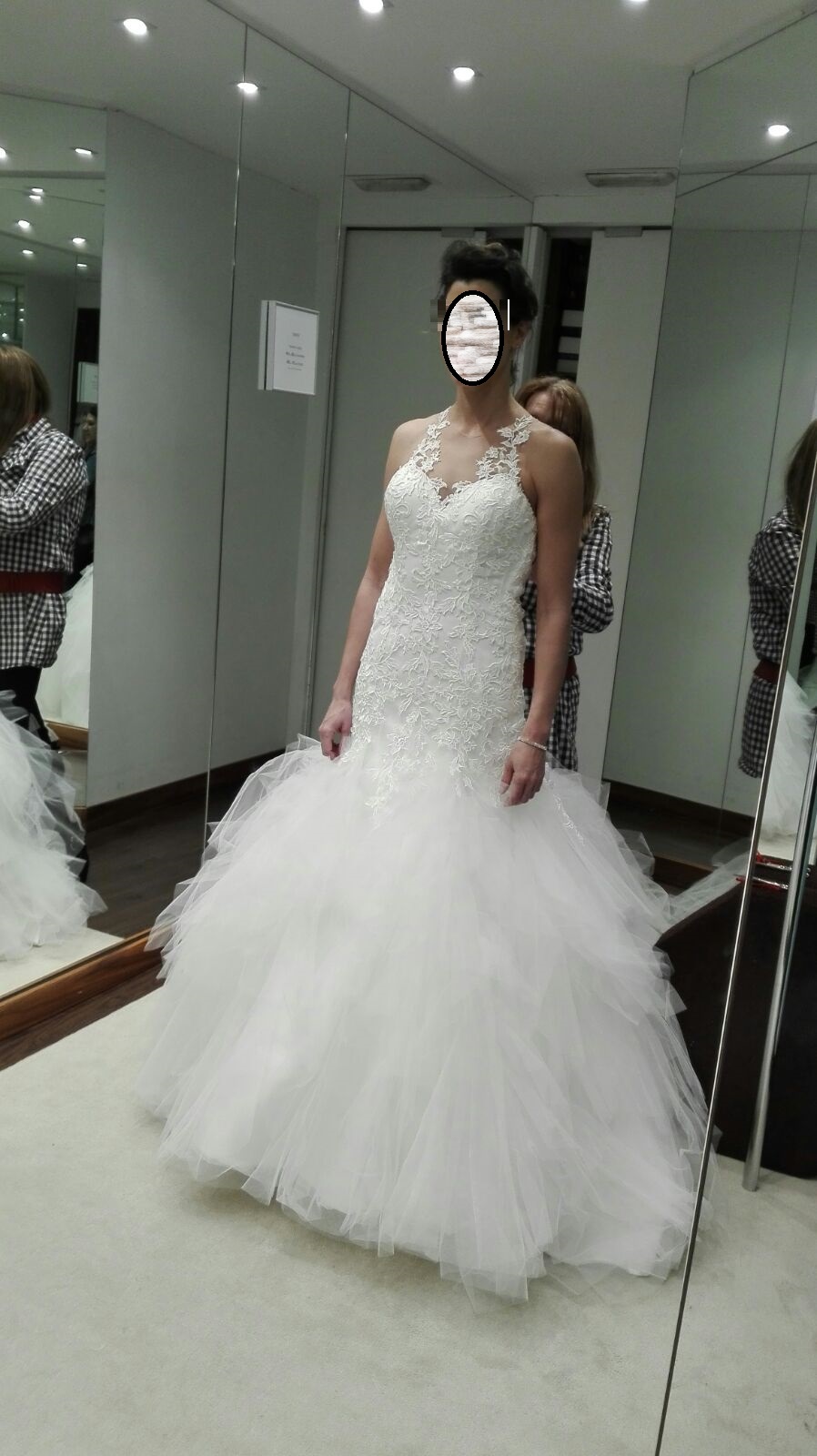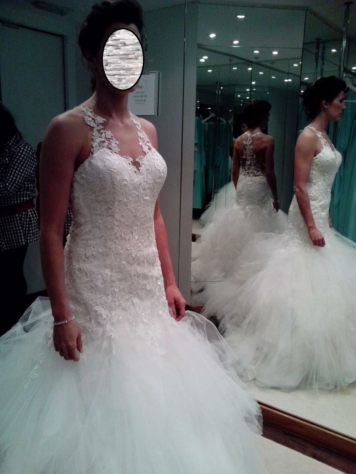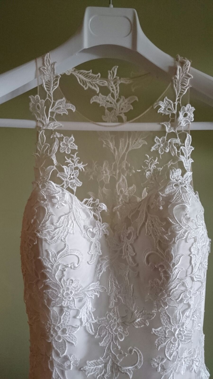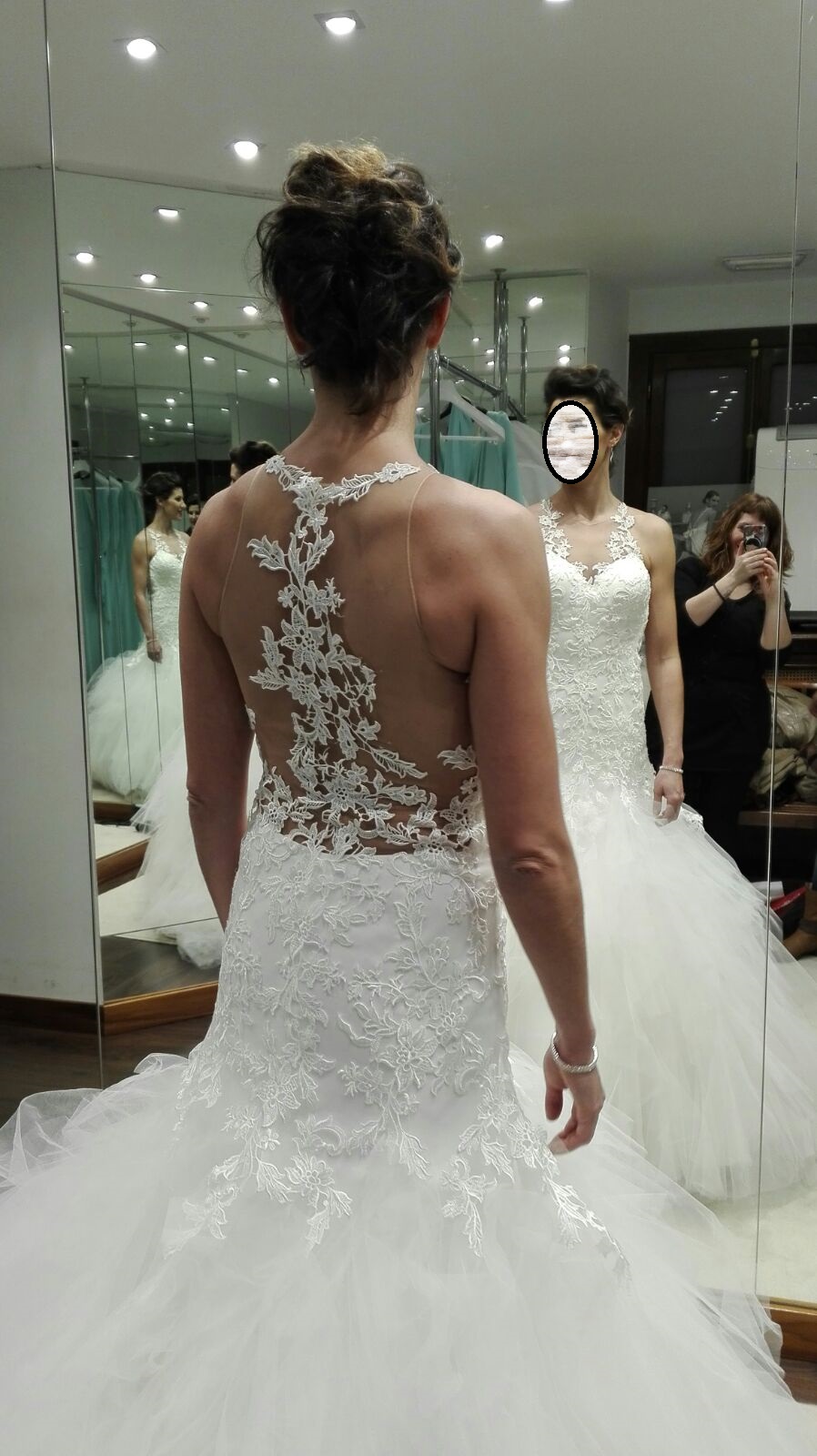 Vestido de boda de la colección Demetrios del año 2016, es el modelo 628. Estilo sirena, ajustado hasta medio muslo. Color blanco roto. Es de tirantes y con gasa toda la espalda y motivos florales, queda como si fuera un tatuaje y tuvieras directamente las flores sobre la piel. La parte de la falda es de muchisimos tules que le dan volumen al vestido y tiene una cola estilo capilla. Talla 38-40