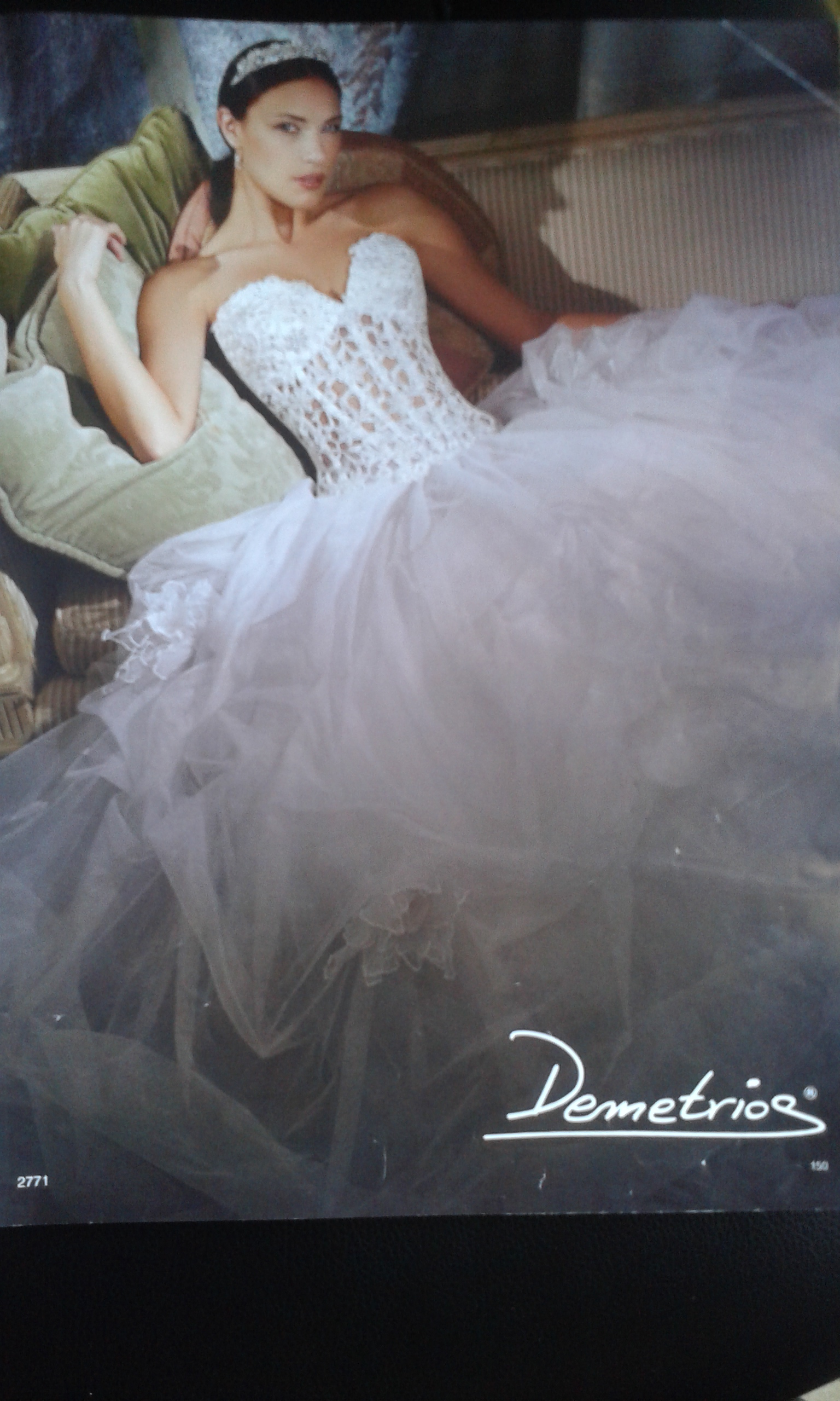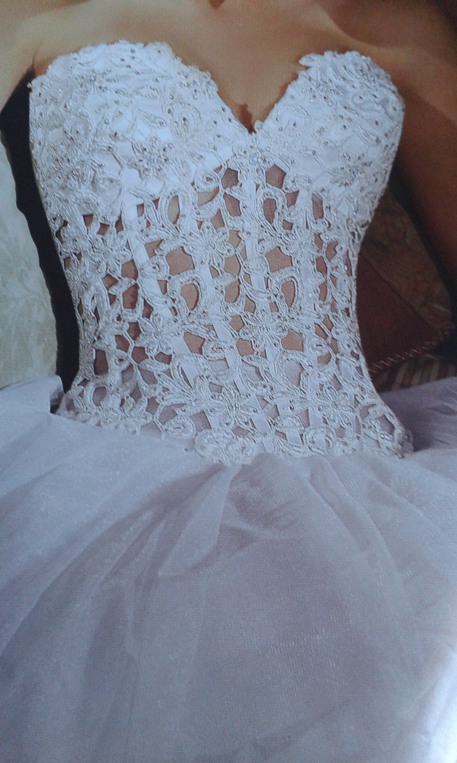 Solo esta puesto una sola vez el dia de mi boda y esta en muy buen estado, tiene 2 metros de cola , el corpiño de arriba es calado y todo bordado de fantasia la falda es de organza de cristal con flores grandes el cancan es muy ancho ideal para ese gran dia con el q soñamos estar guapisimas