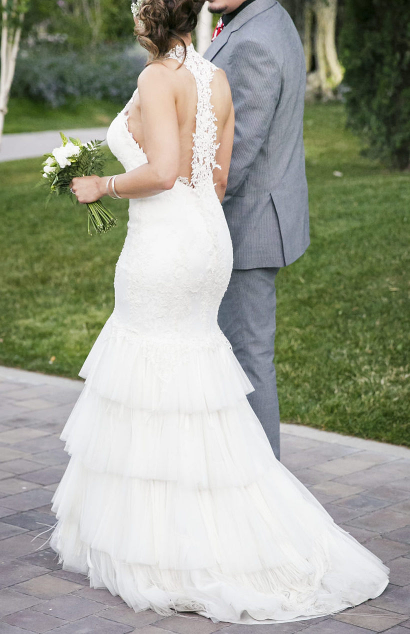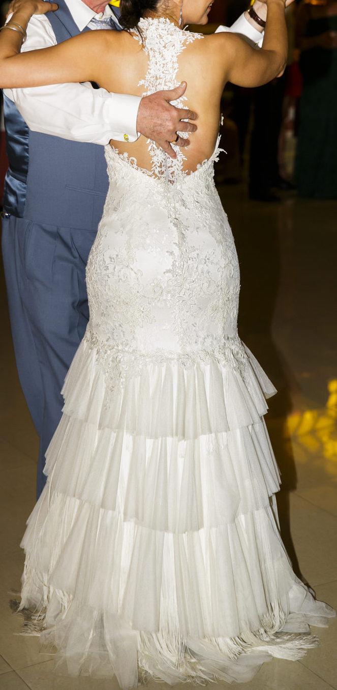 ESPECTACULAR VESTIDO DE NOVIA DE CORTE SIRENA CON FLECOS Y VOLANTES DESDE LA CADERA HASTA EL SUELO.