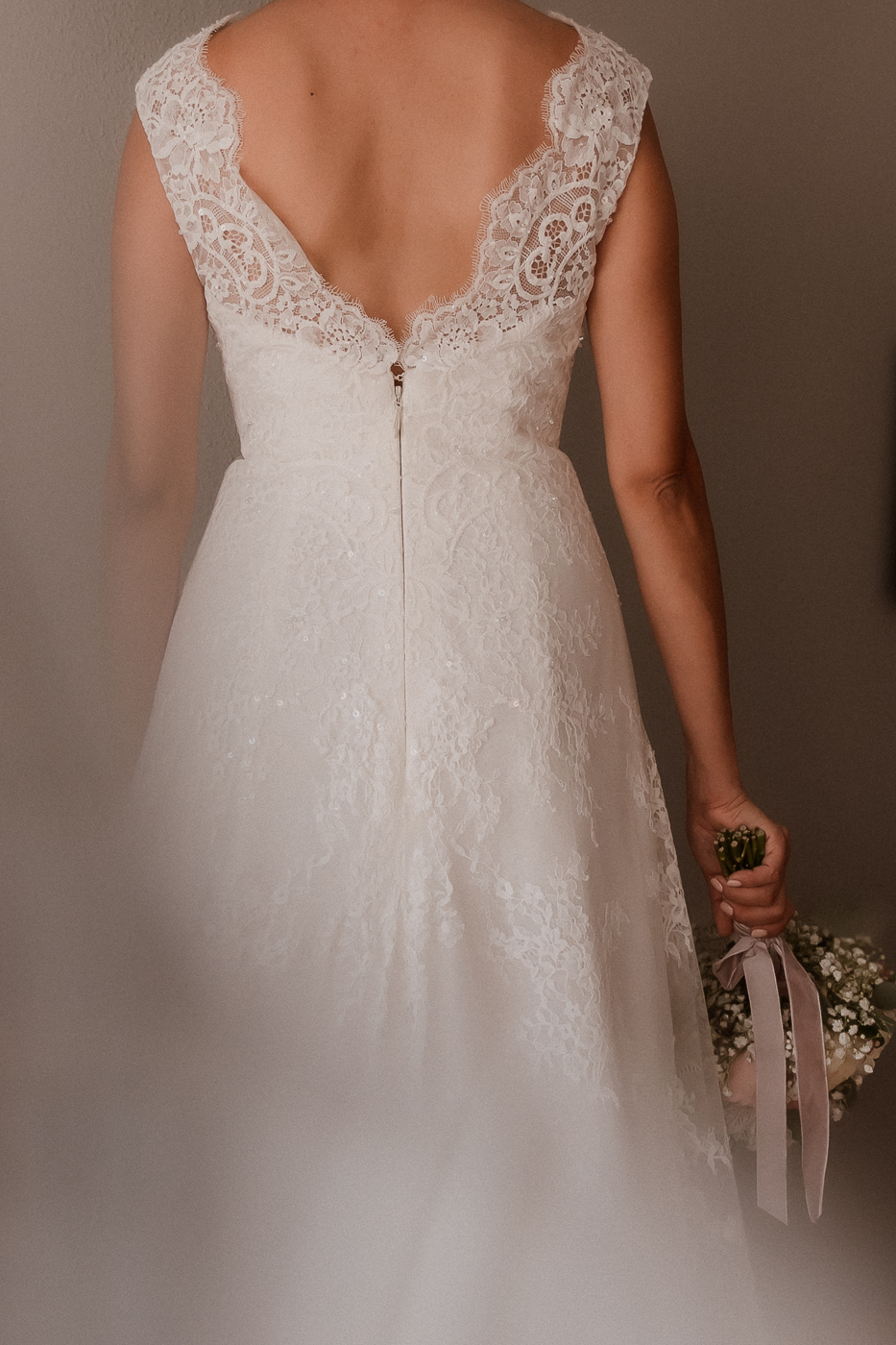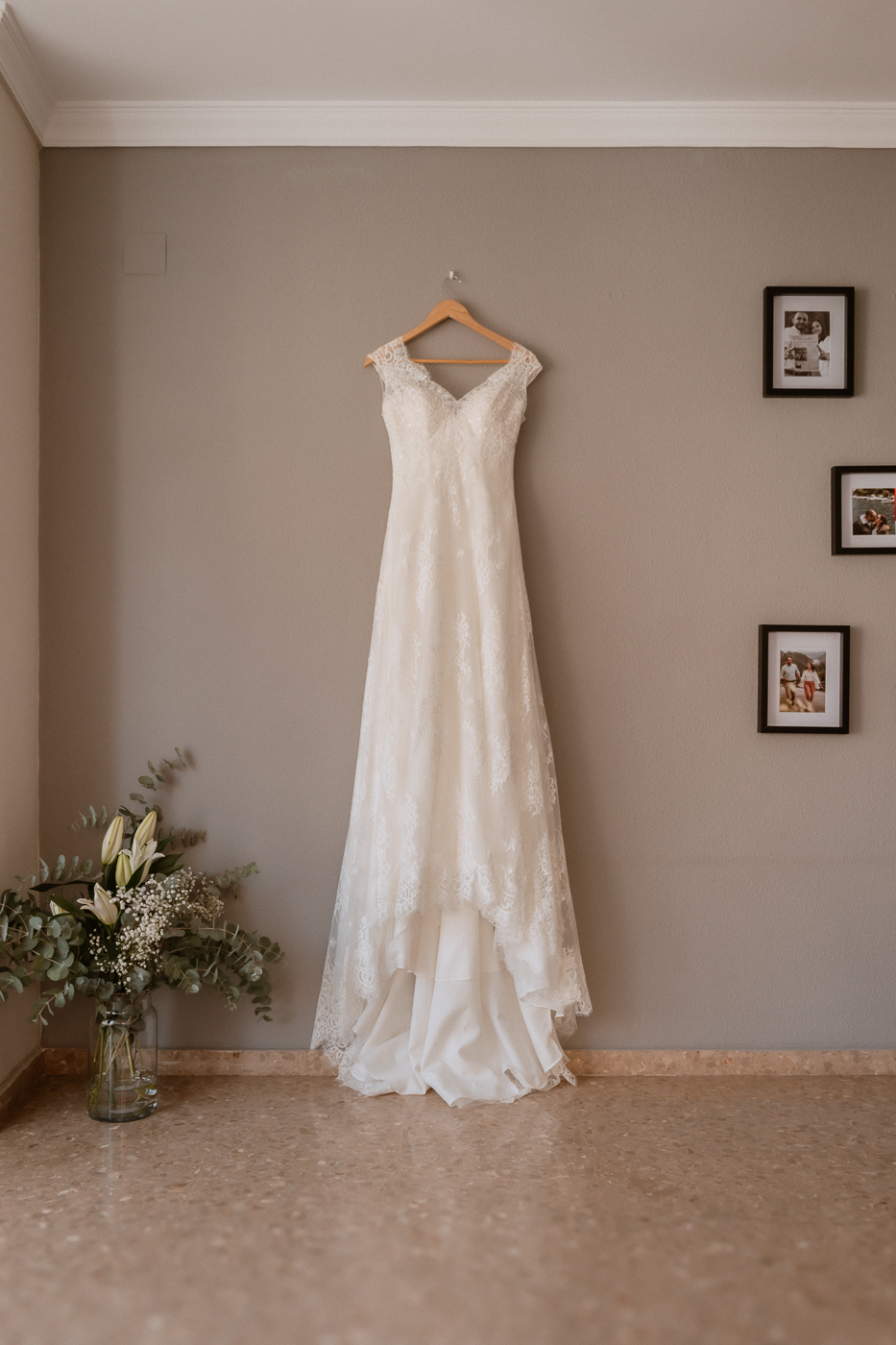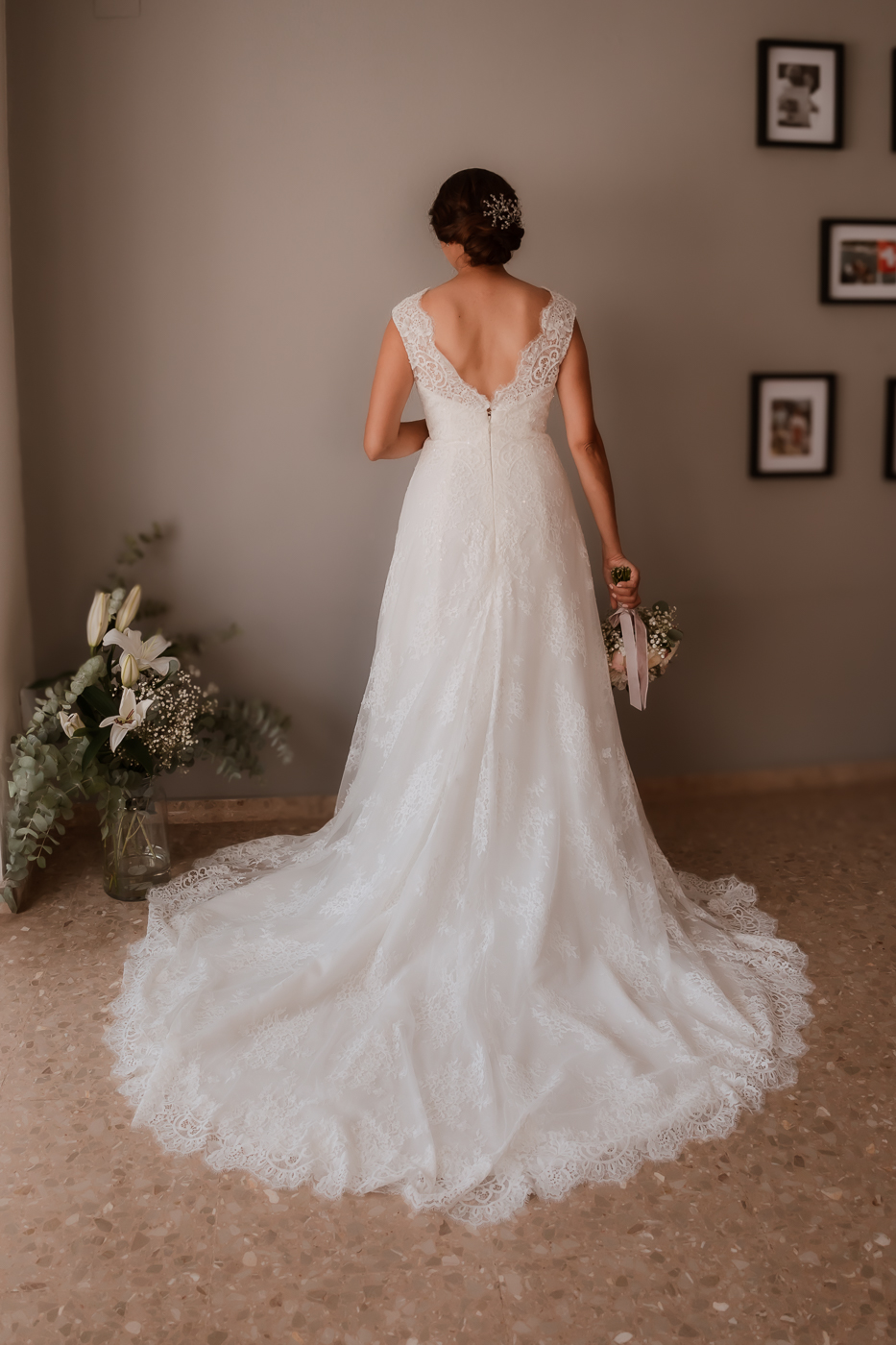 Vestido nuevo, se uso para la ceremonia nada mas un par de horas,tiene lentejuelas de decoración que le dan un toque especial, llevándose el vestido todo el protagonismo. Talla 36, los retoques que se le hicieron al vestido fue solo de hombros y de delante la parte baja para poder dar el paso y no pisar el vestido y caerse, por lo demás esta intacto.