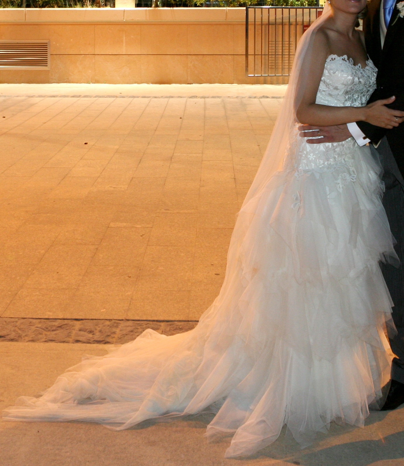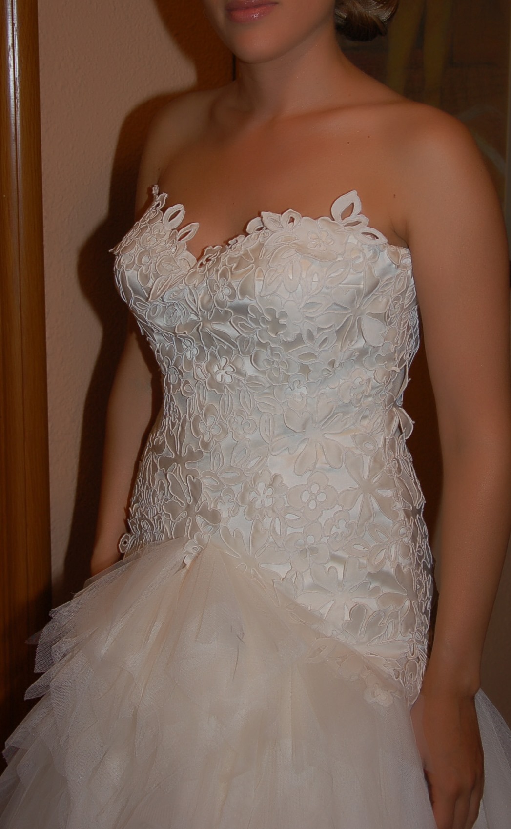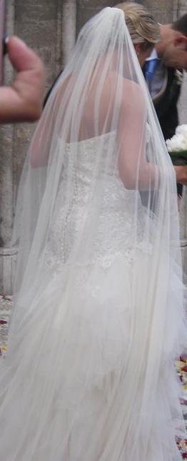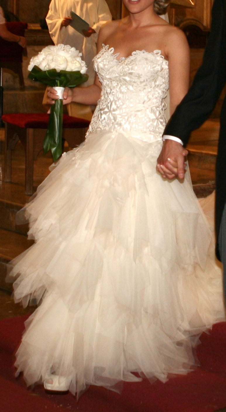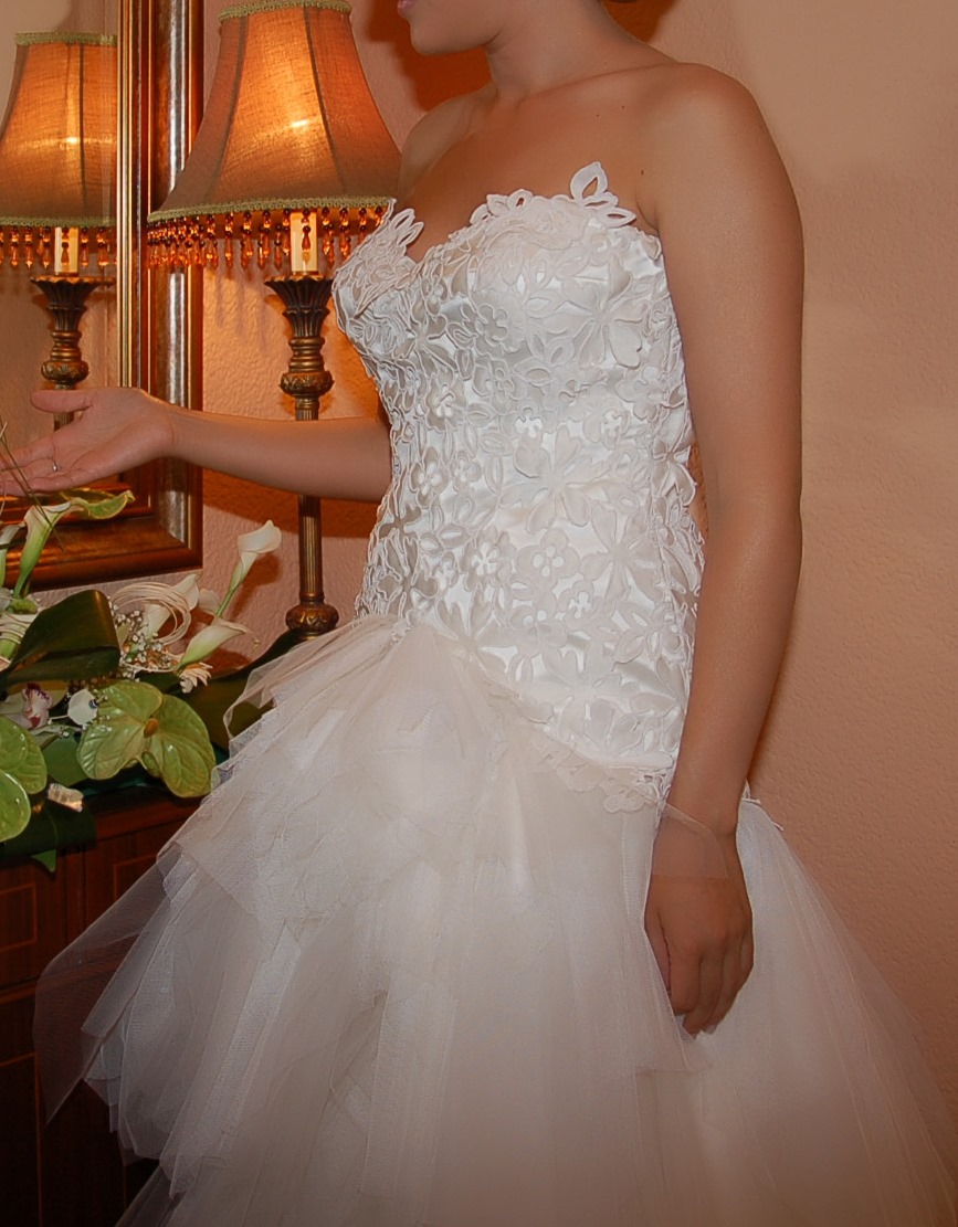 Vestido de guipur y tul hecho a medida por Hannibal Laguna . La falda tiene cola que se puede recoger con un botón. Cremallera invisible lateral en el cuerpo. La parte del pecho está confeccionada de manera que hace la forma del pecho aunque no lleves sujetador (talla de sujetador 90B). Mi altura es 1,61cm, para el vestido llevé zapatos de 7cm de tacón aprox.