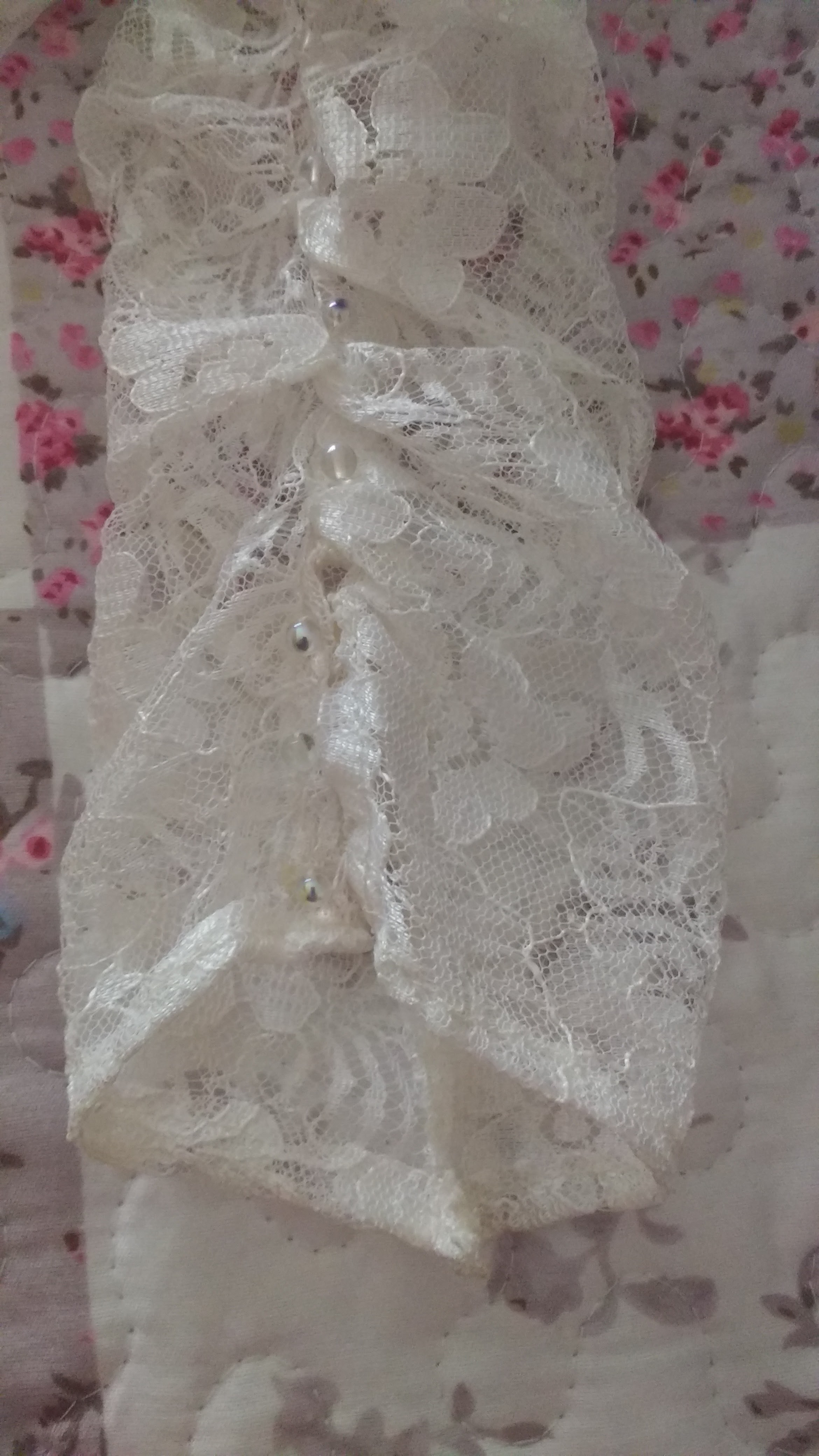 Compuesto de dos cuerpos con encaje, seda, tul, raso, perlas y cristales.