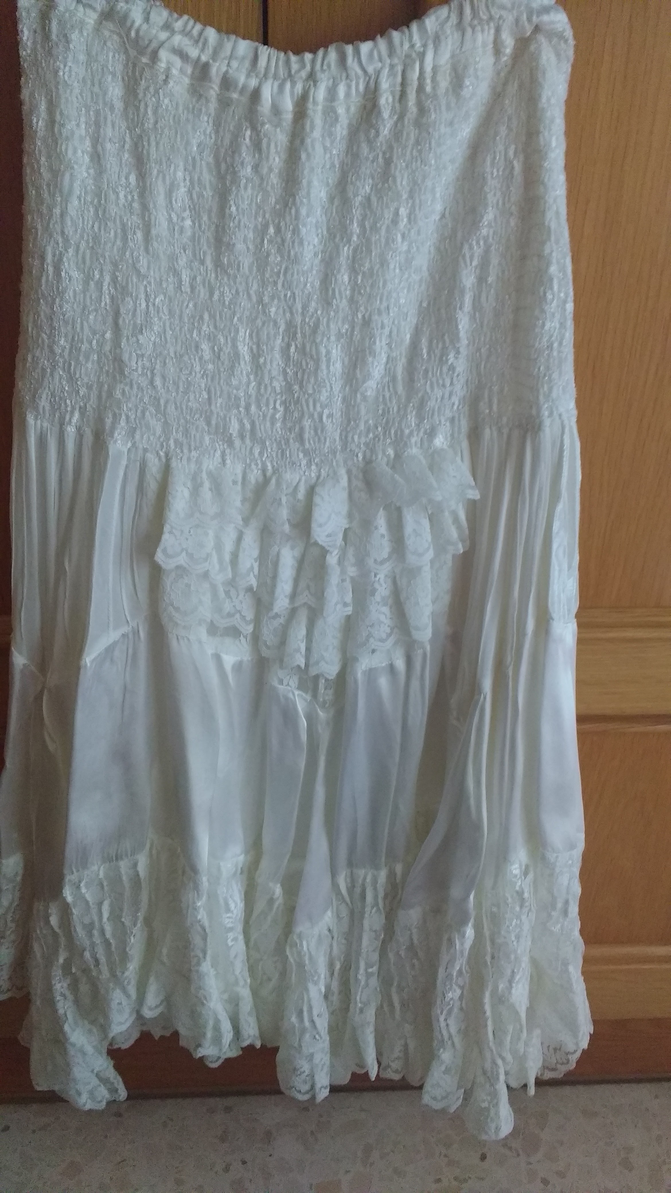 Falda a picos con puntillas y sedas y raso en la parte interior para darle mas volumen y en la parte de atrás, un toque especial de conjunto de puntillas, en la parte baja de la espalda para realzar la silueta femenina.