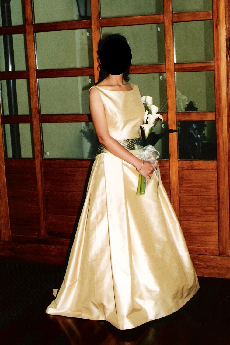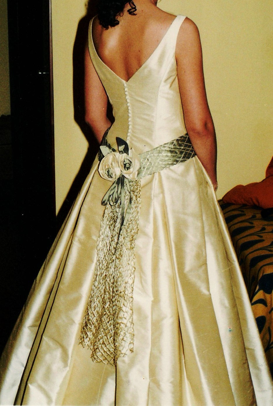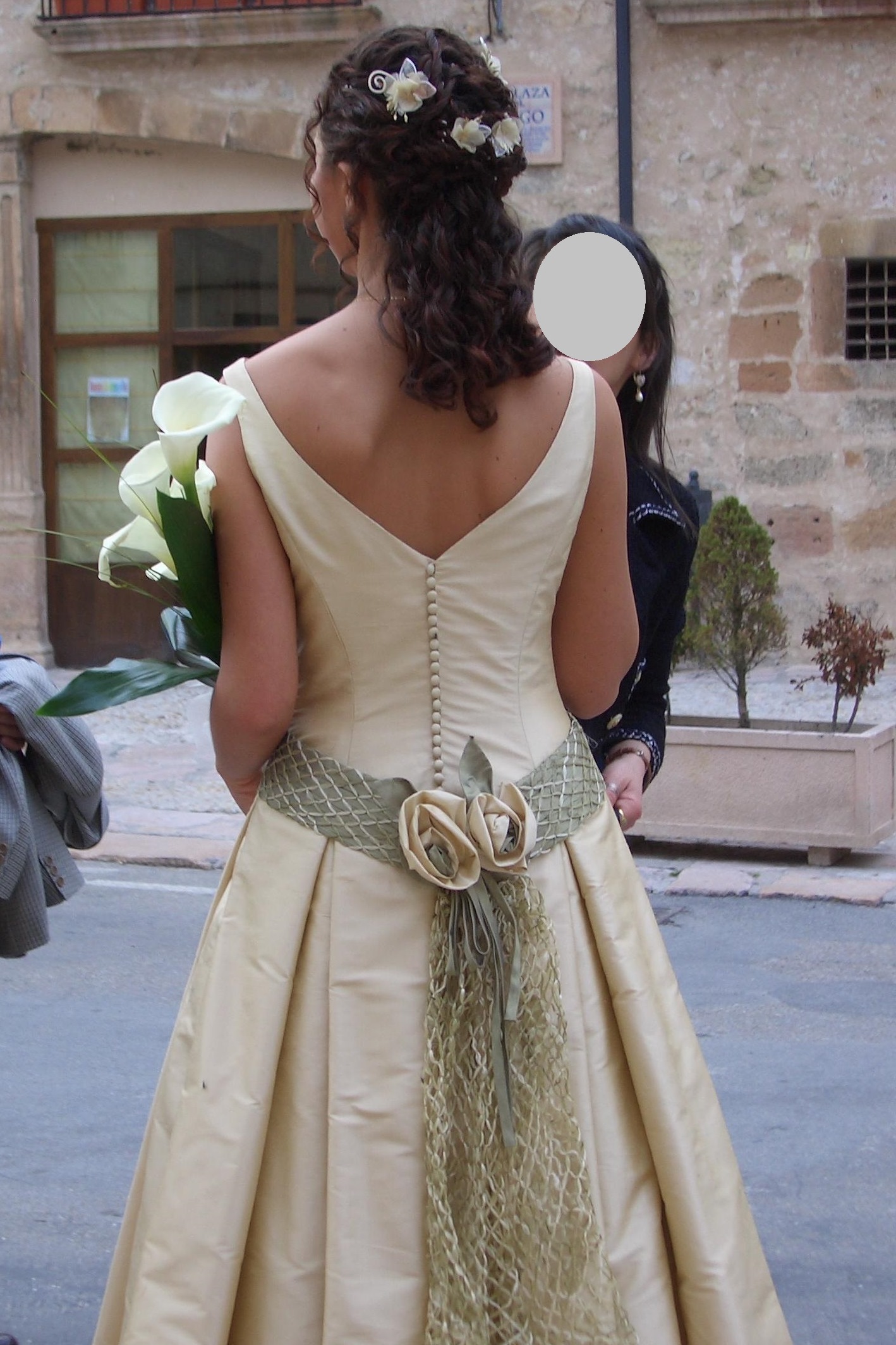 Precioso vestido de seda salvaje hecho a medida (aprox. talla 38-40), con cinturón en tonos verdosos. Regalo complementos, cancan, detalles florales del pelo y zapatos de salón color champagne número 39 (4-5 cm de tacón) muy cómodos.