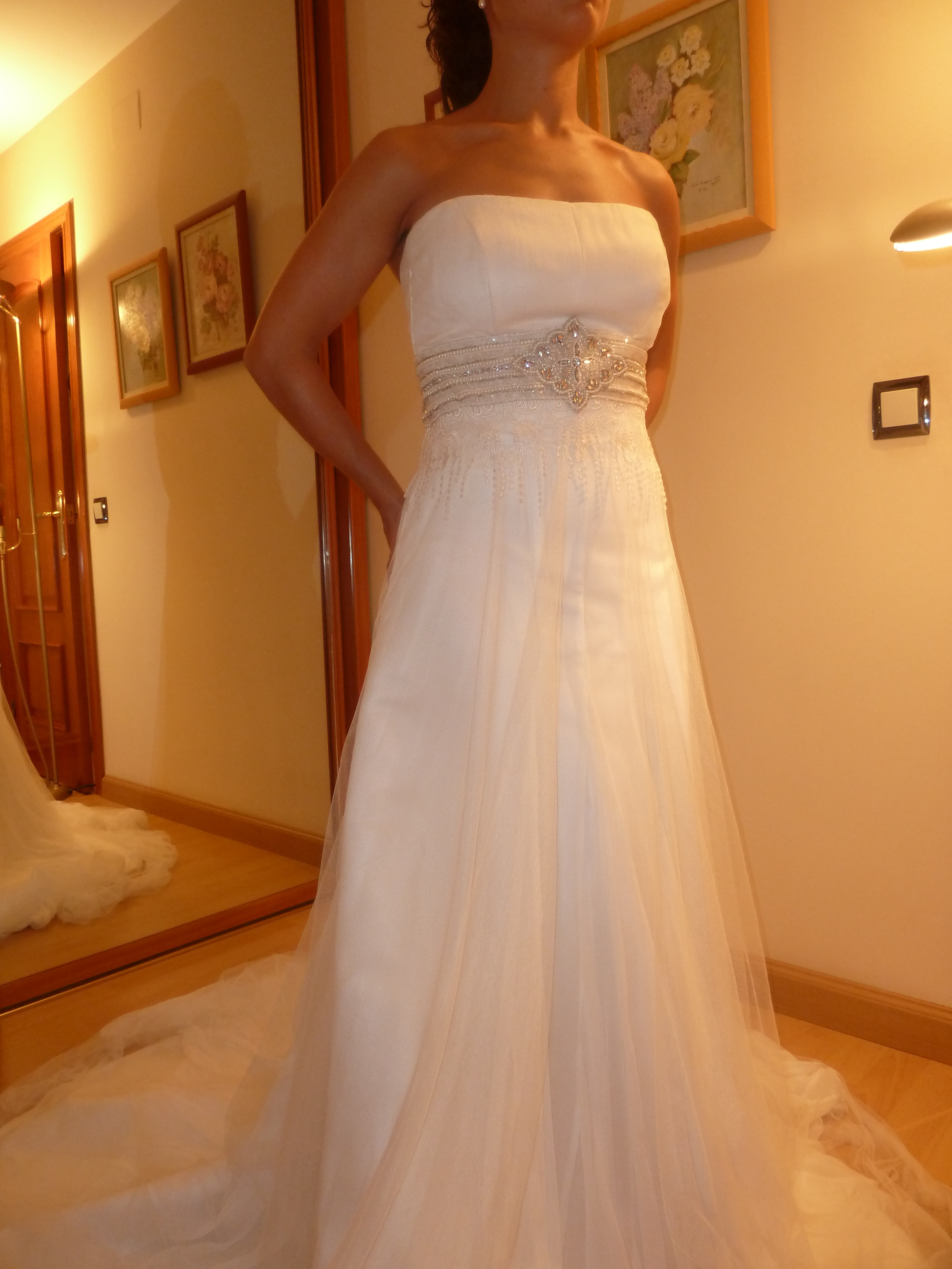 vestido nuevo a estrenar de la colección 2013 de inmaculada garcía, no tiene arreglos. Talla 36. Es una mecla de estilo entre actual pero con toques vintage. Pedrería a la cintura y toques de encaje y tul. Es sencillo pero muy bonito. A las chicas bajitas como yo, nos estiliza mucho ya que tiene mucha caida desde la cintura. No pesa nada y es muy cómodo de llevar ya que los materiales son de primera calidad.