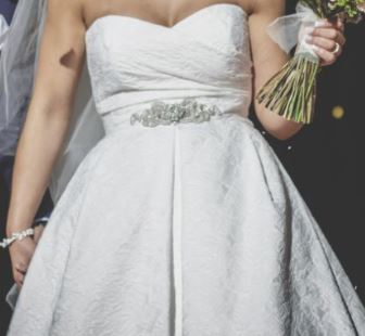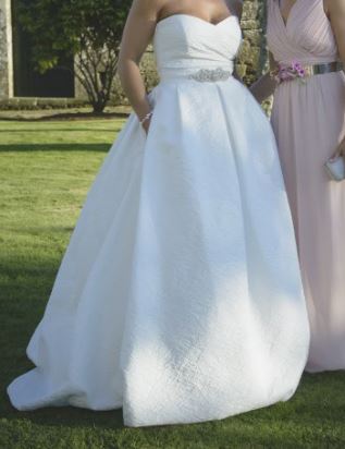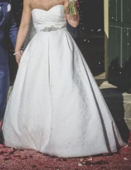Este vestido de Jesús Peiró colección 2016 en color Blanco Roto está en estado impecable. El corte y la silueta recuerda muchísimo a los vestidos de Dior usados por Celebrities como Jennifer Lawrence,; dado lo ajustado de la parte superior con escote palabra de honor forma corazón con un pequeño drapeado, y también gracias al volumen de la falda y el “cuerpo” de la tela brocada. Tiene bolsillos y tira interior para enganchar al sujetador y hacer que sea más confortable y se mantenga en su sitio en todo momento. La talla en realidad se mueve entre una 40 y una 42. El detalle en stras de la cintura habría que cambiarlo, pues se deterioró un poco con la limpieza de tintorería. Aunque igualmente se incluye. El cancan se vendería a parte de interesar (140€). Este es muy espectacular, pues se compone de muchos volantes de tul y aporta un volumen extra. En definitiva es un vestido espectacular aún dada su sencillez y muy cómodo, pues no es pesado y permite que te muevas con total libertad.