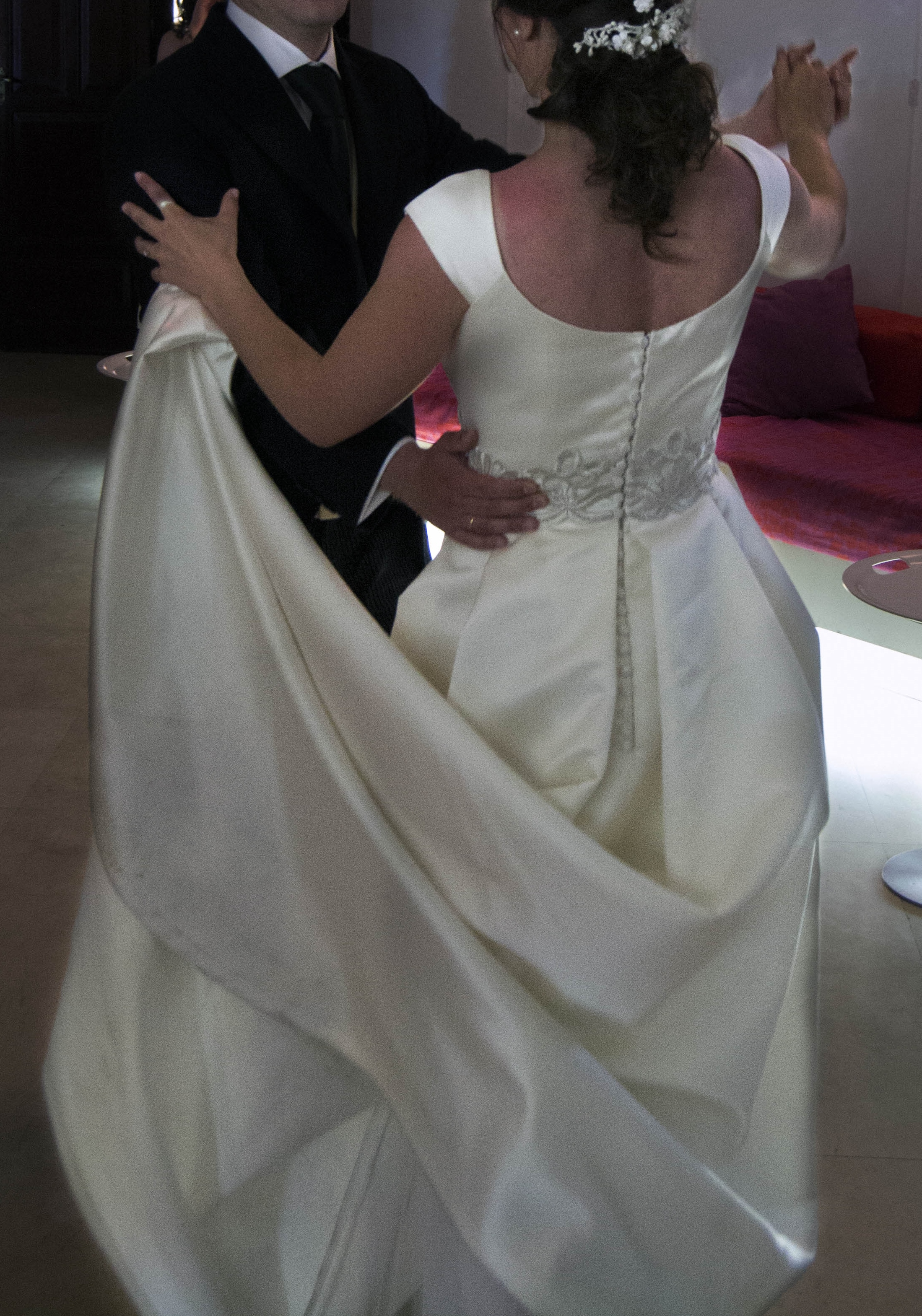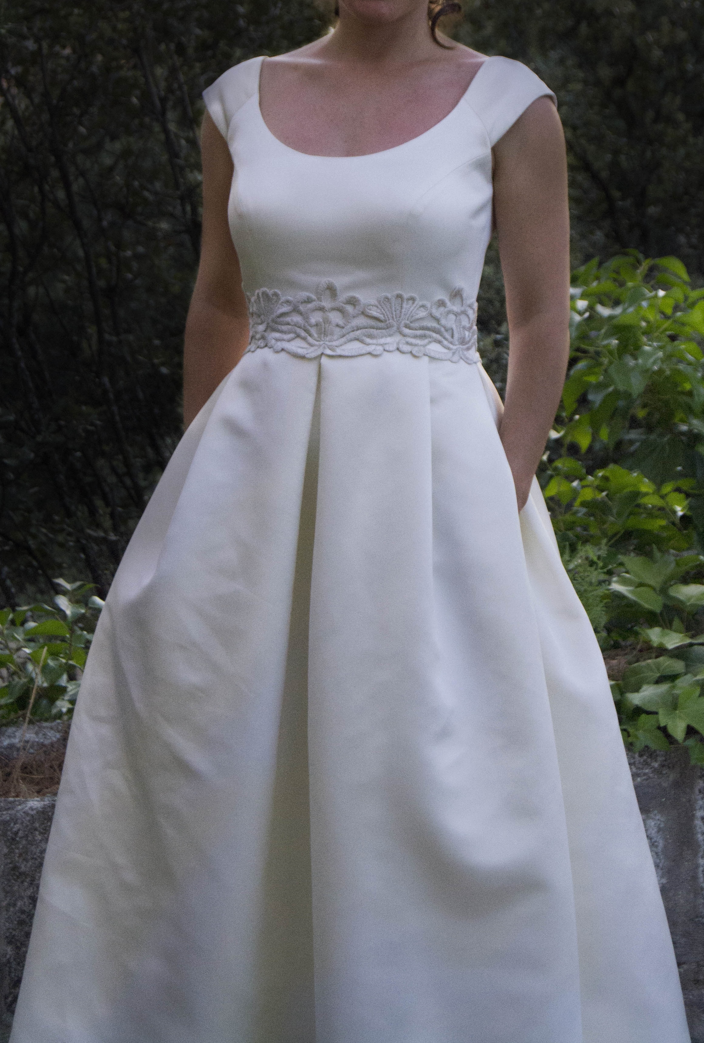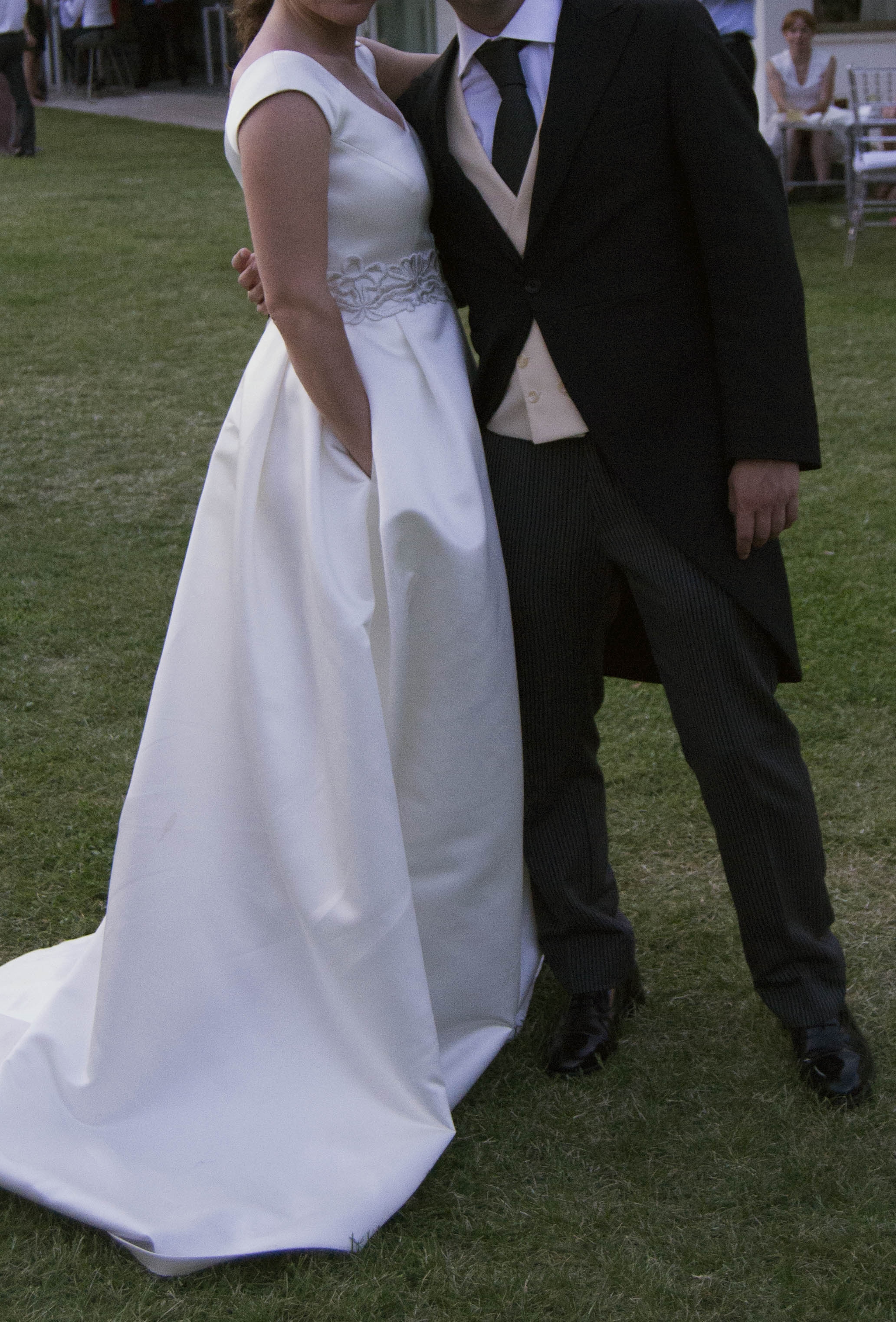 Vestido con mucho estilo, entallado en la cintura, con un fajín en color plata y una falda preciosa que lleva bolsillos incorporados; con una sola puesta y en perfecto estado. Recién recogido de la tintorería y planchado, listo para lucir en tu gran día. Comprado en Jesús Peirò a finales de junio de 2015. Muy buena opción porque está como nuevo y puede ser tuyo con un descuento de más del 50%. Can can incluido.