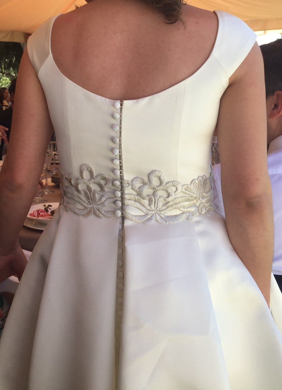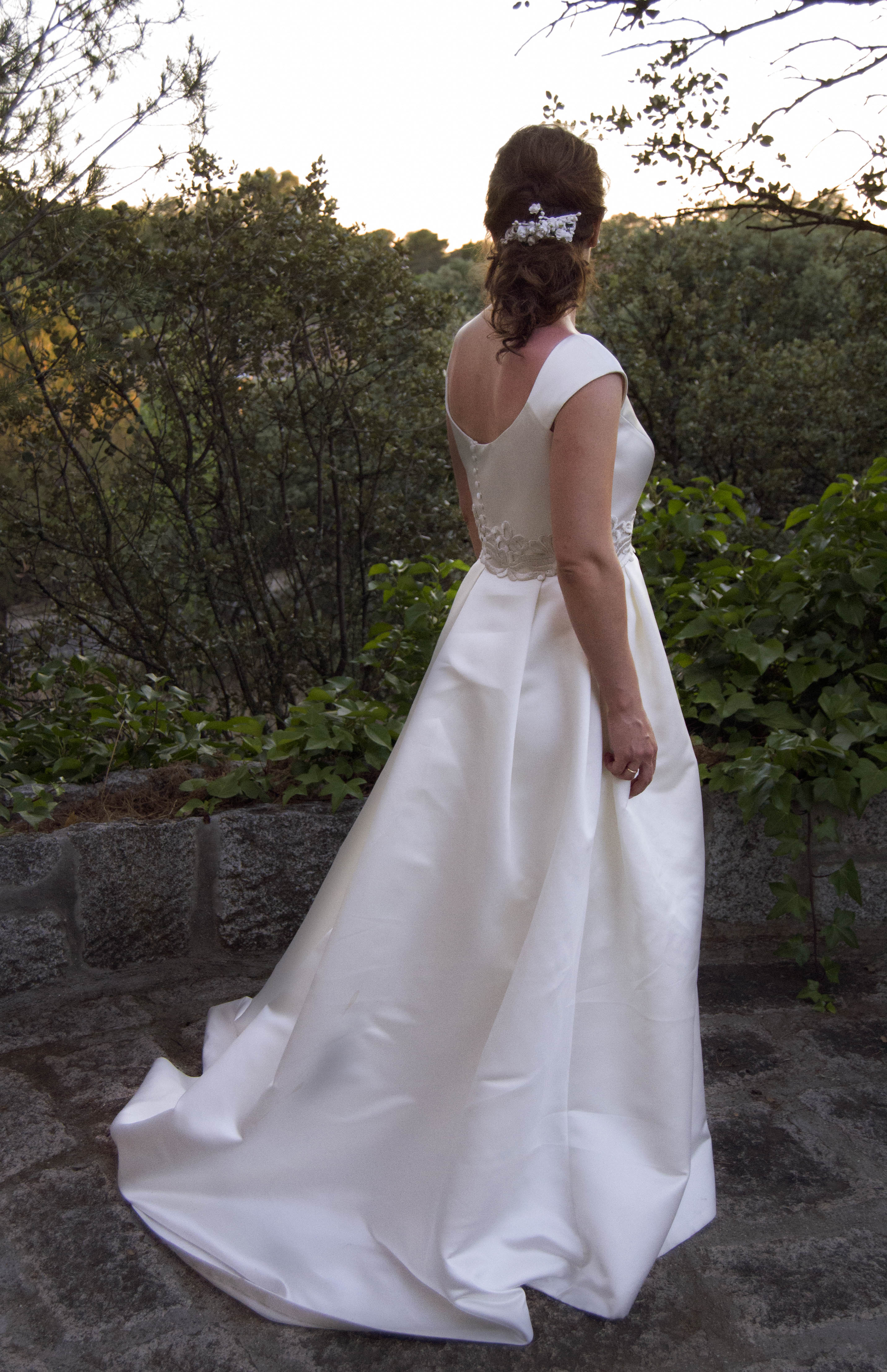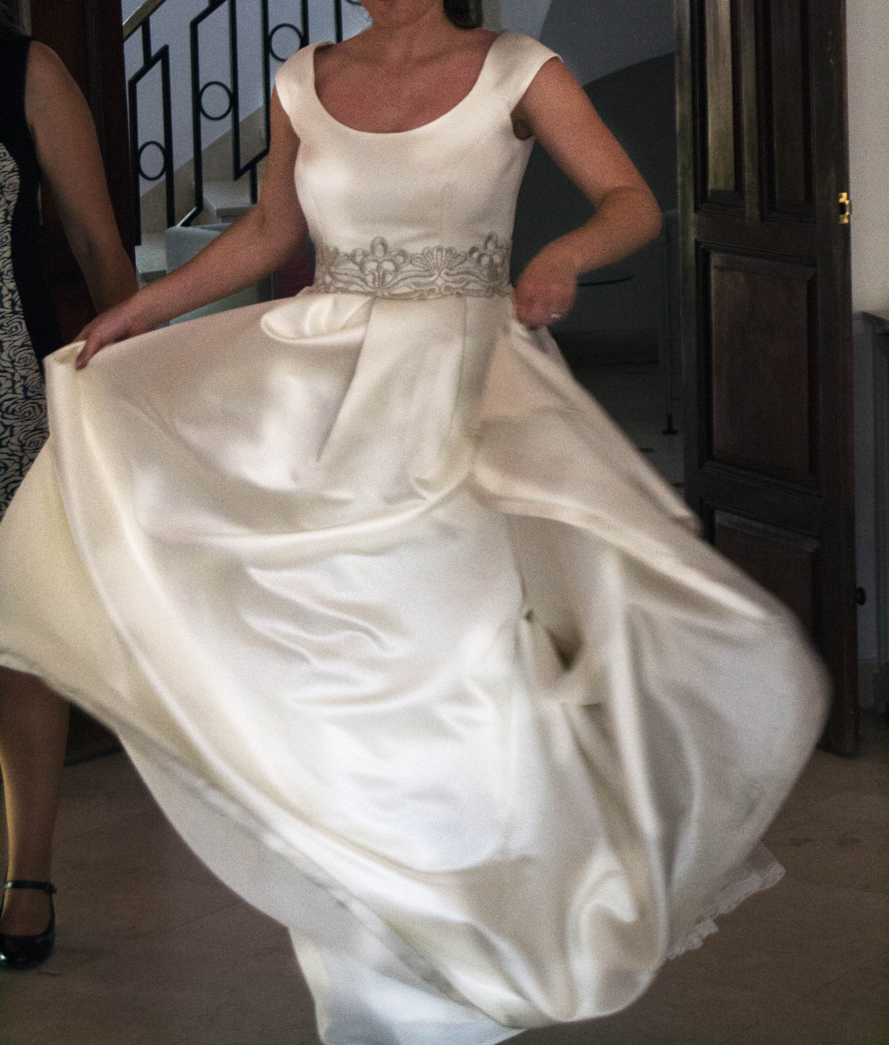 Vestido con mucho estilo, entallado en la cintura, con un fajín en color plata y una falda preciosa que lleva bolsillos incorporados; con una sola puesta y en perfecto estado. Recién recogido de la tintorería y planchado, listo para lucir en tu gran día. Comprado en Jesús Peirò a finales de junio de 2015. Muy buena opción porque está como nuevo y puede ser tuyo con un descuento de más del 50%. Can can incluido.