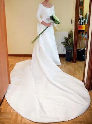 Vestido de novia de línea sobria y regia es este modelo de Jesús Peiró 2010. El cuello barco y las mangas tres-cuartos lo hacen resistente al frío y el cinturón-joya y la original cola le dan un aire diferente dentro del clasicismo.