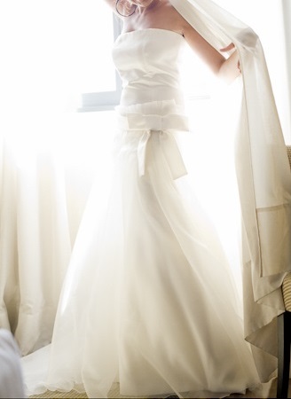 Vestido de novia en perfecto estado y recién recogido en la tintorería Élite de Madrid.