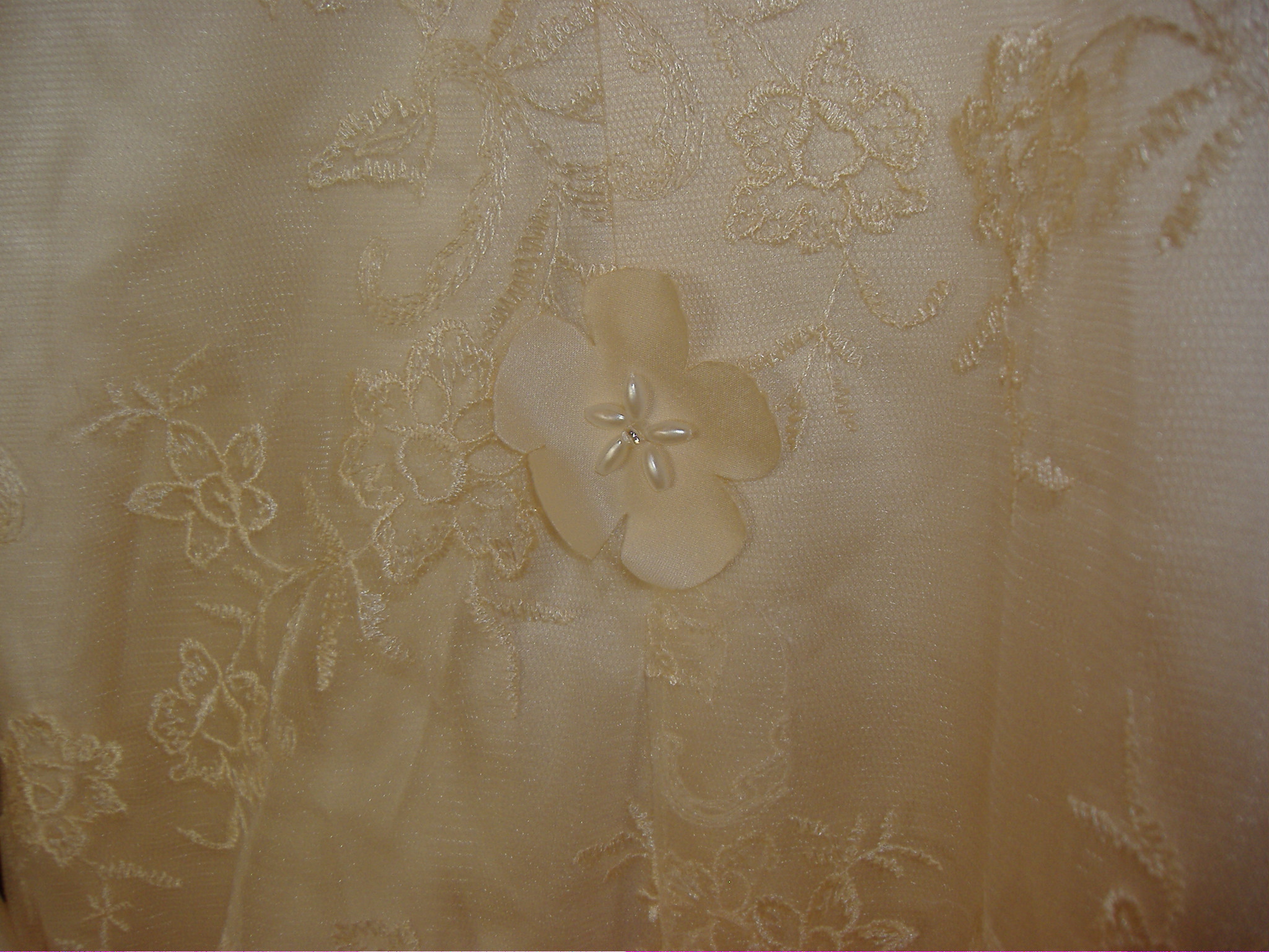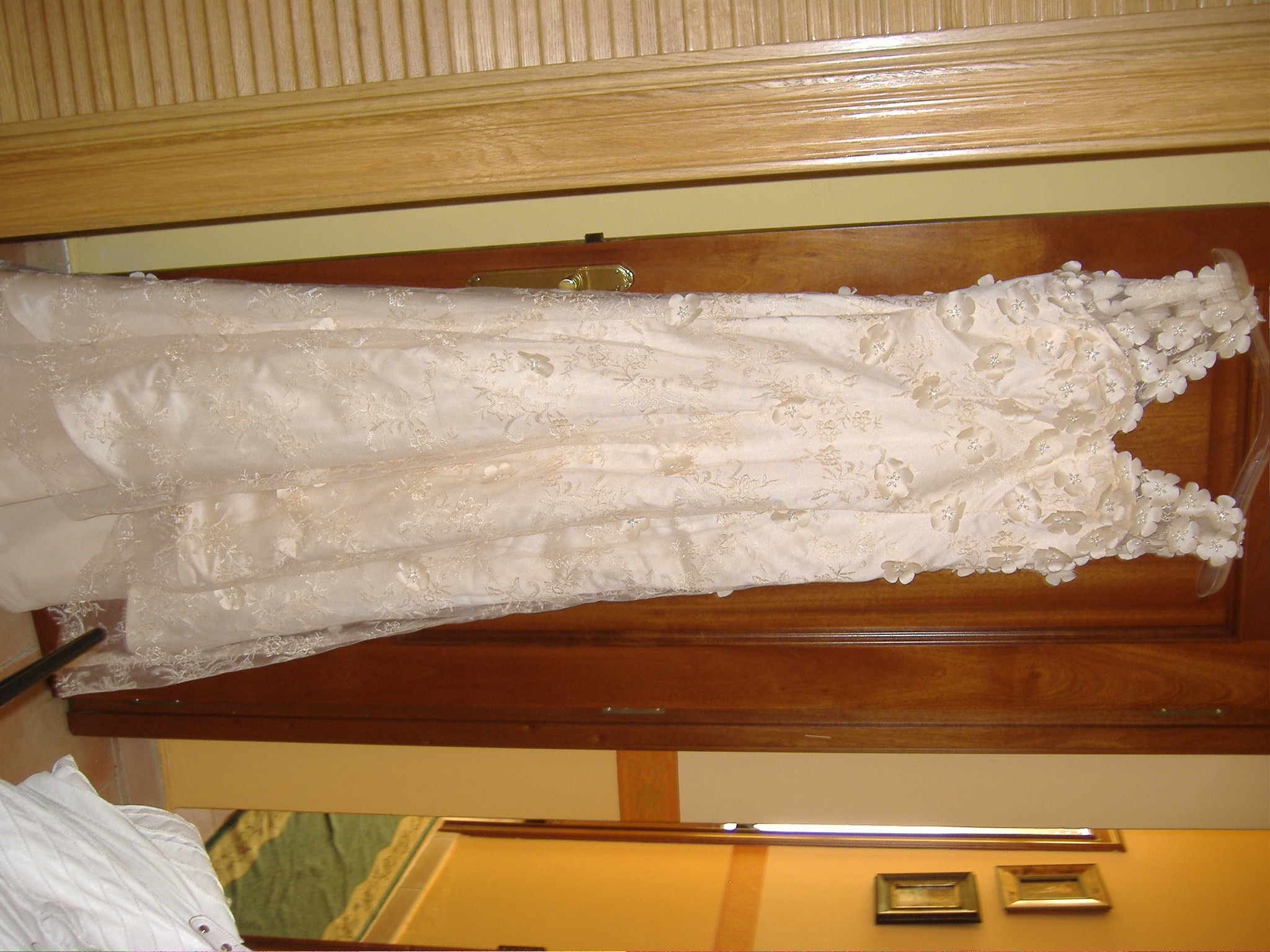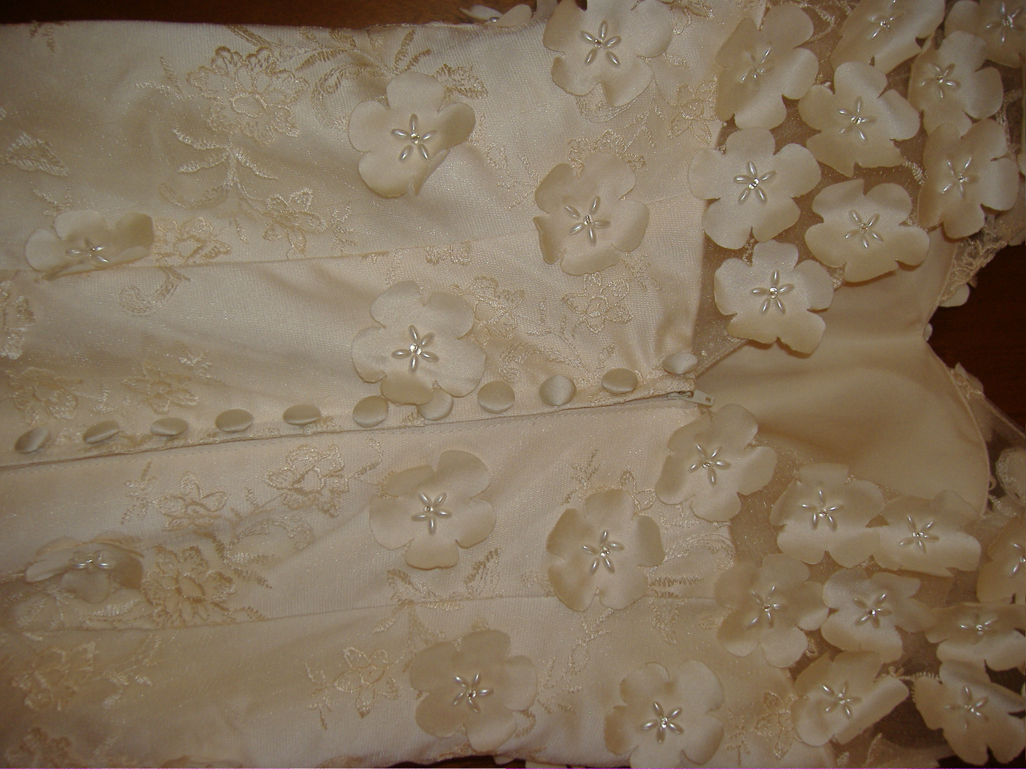 Vestido sin estrenar( lo compre meses antes de la boda y como no adelgace lo suficiente lleve otro).Es de color champagne, de encaje, con flores añadidas con perlas.Es de tirantes y escote en v. Pequeña cola.