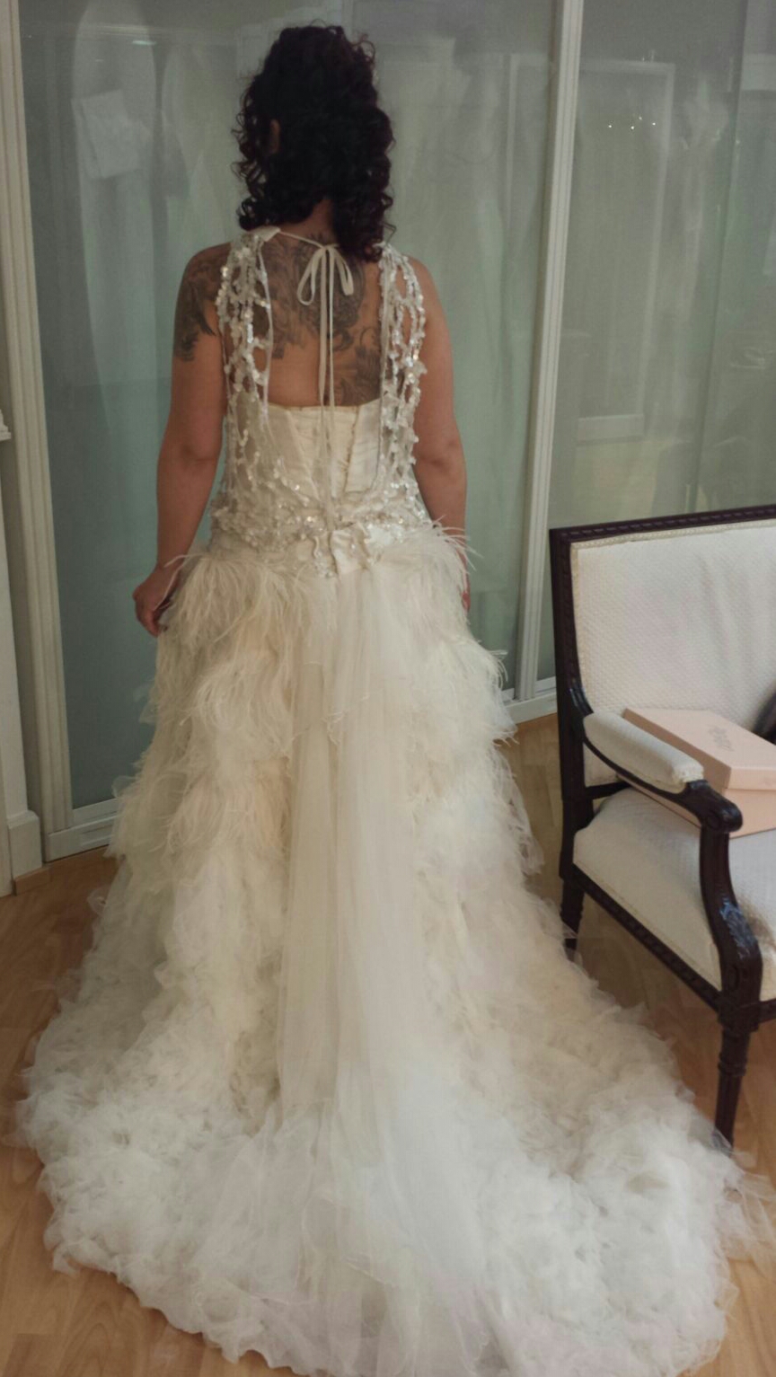 La sobrefalda lleva plumas de marabu con las que da un espectacular movimiento a la prenda.