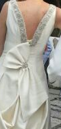 Vestido de seda natural, corte clásico: escote frontal tipo barco, escote de espalda en pico, estructura de brillos simulando un collar que se extiende siguiendo el pico de la espalda; remate con un lazo desigual y un broche de brillos. Vestido sencillo, elegante y que alarga la silueta gracias a las costuras frontales. Talla 38, 1 solo uso, limpiado en tintorería.