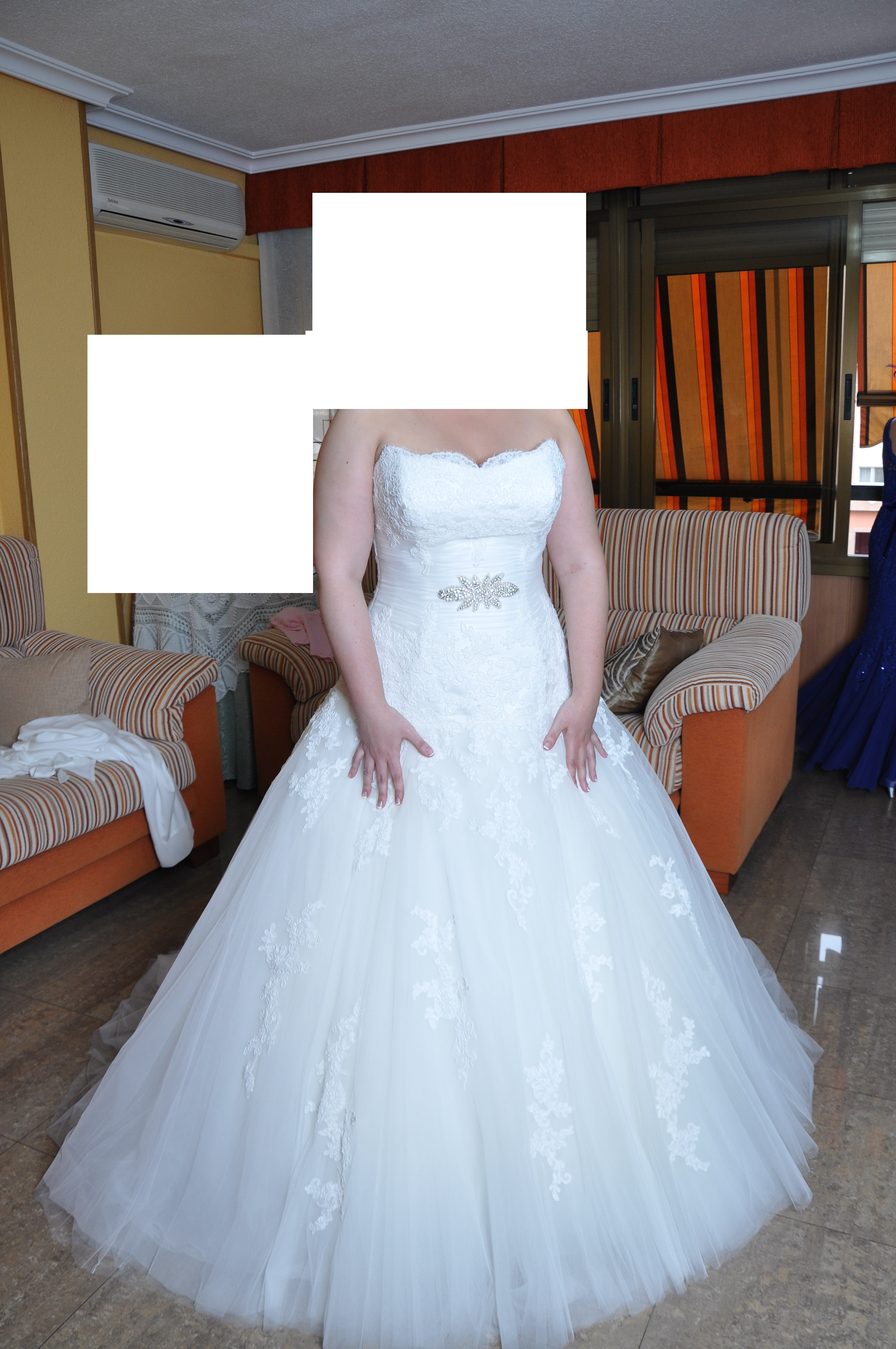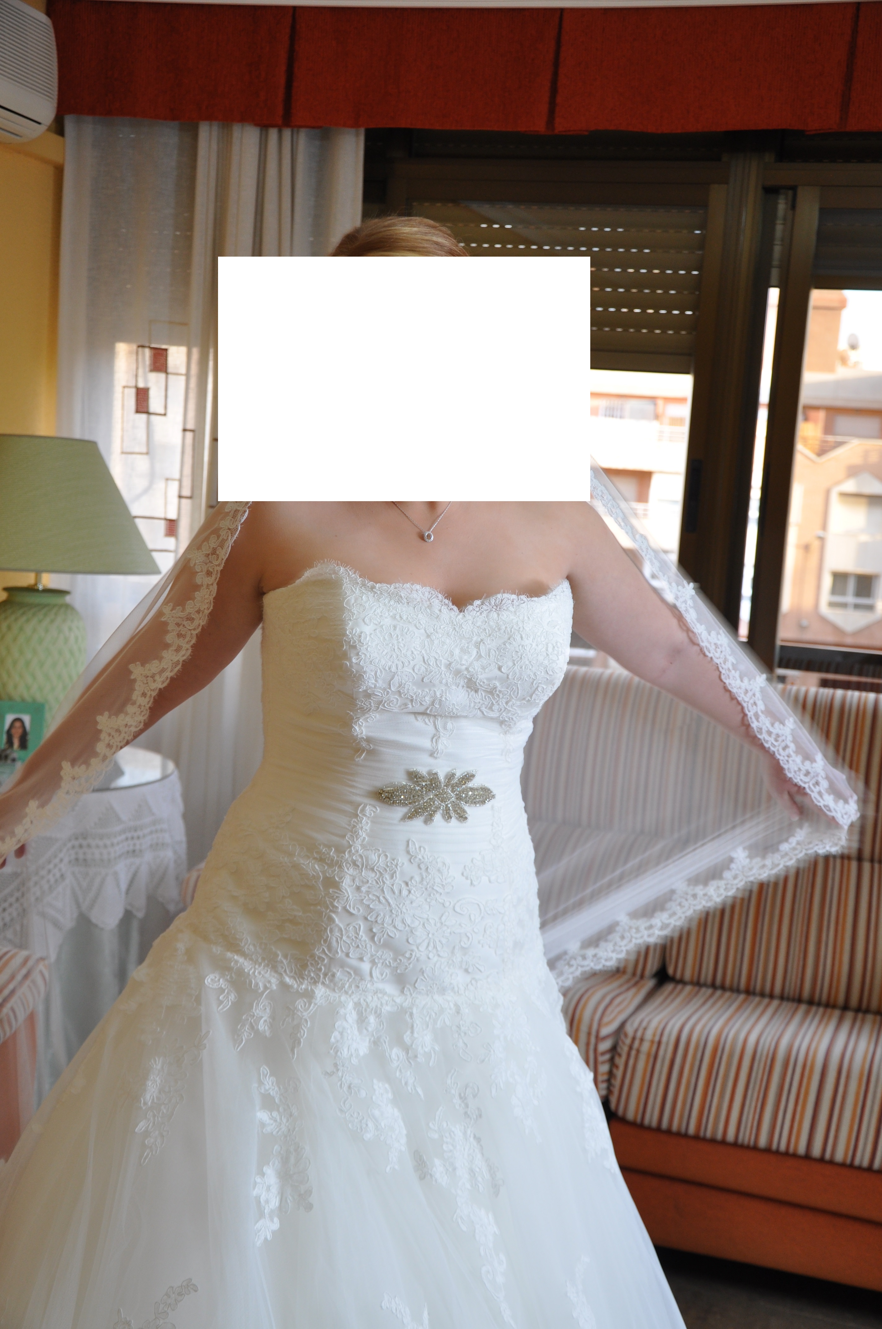 Vendo vestido la Sposa 2014, modelo Selecta solamente cogido del bajo, resto sin arreglar, altura 1,70. En la foto aparece con un aplique brillante que está descosido(para tintorería) pero se puede volver a coser o sustituir por otro o cinturón. Incluyo el adorno y el velo que no es del mismo modelo del vestido, pero que queda genial.