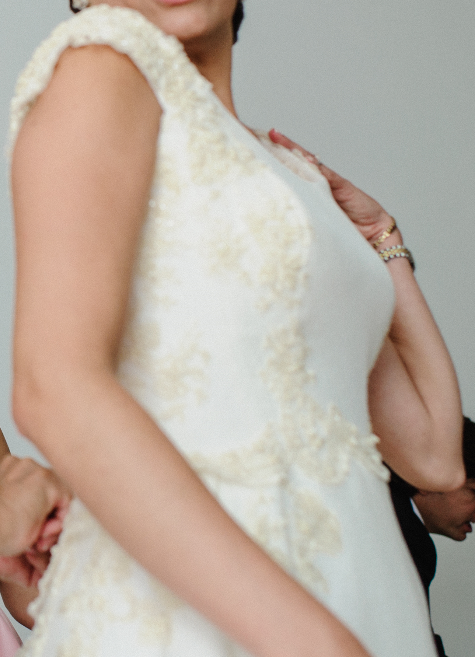 Vestido en una sola pieza cuyo cuerpo se configura con tela de pumeti el frontal, laterales, tirantes, cinturila y espalda con tela de pedrería de elie saab, falda de organza rustica con gran cola estilizada. Escote en la espalda en cuadrado y escote delantero en redondo.