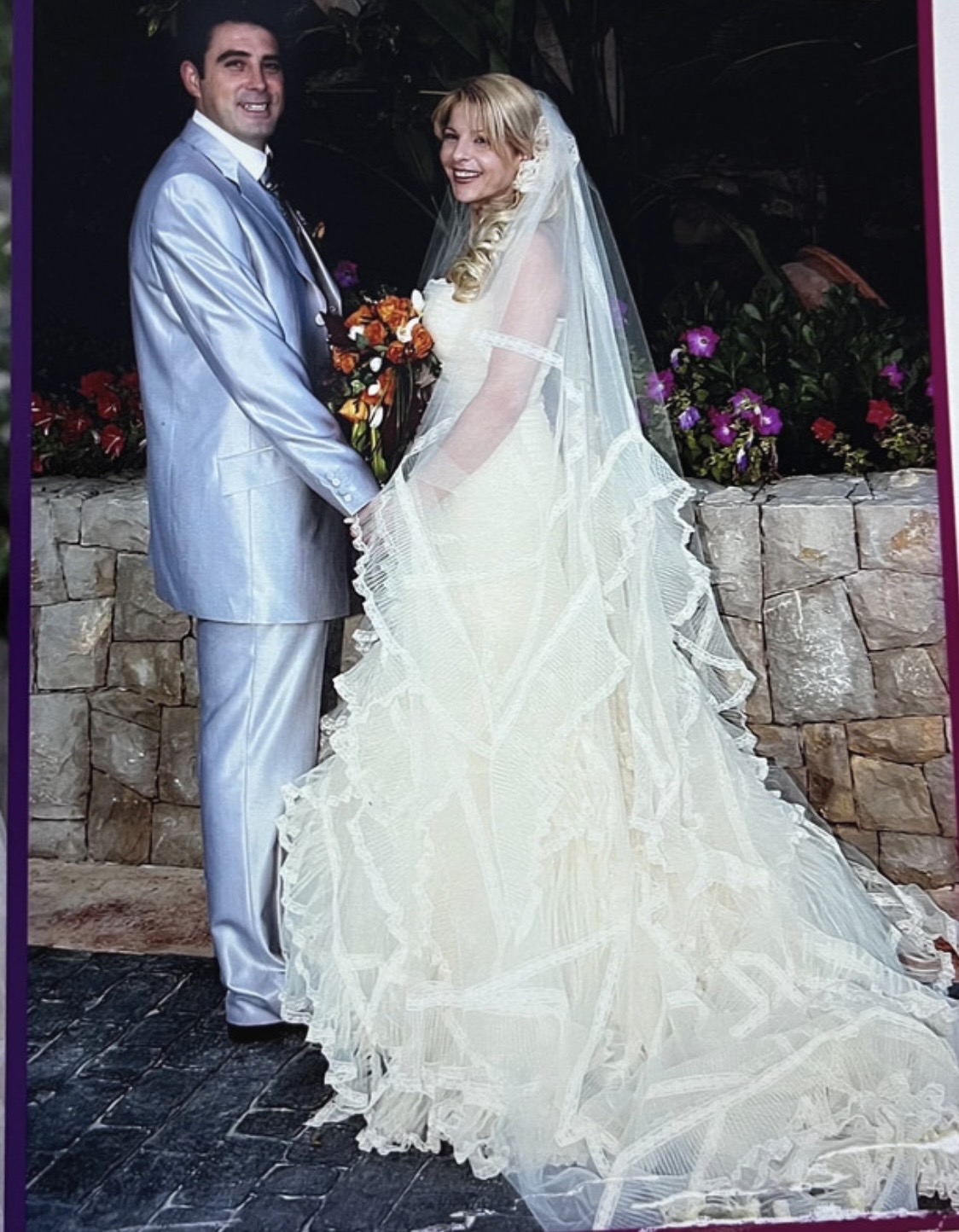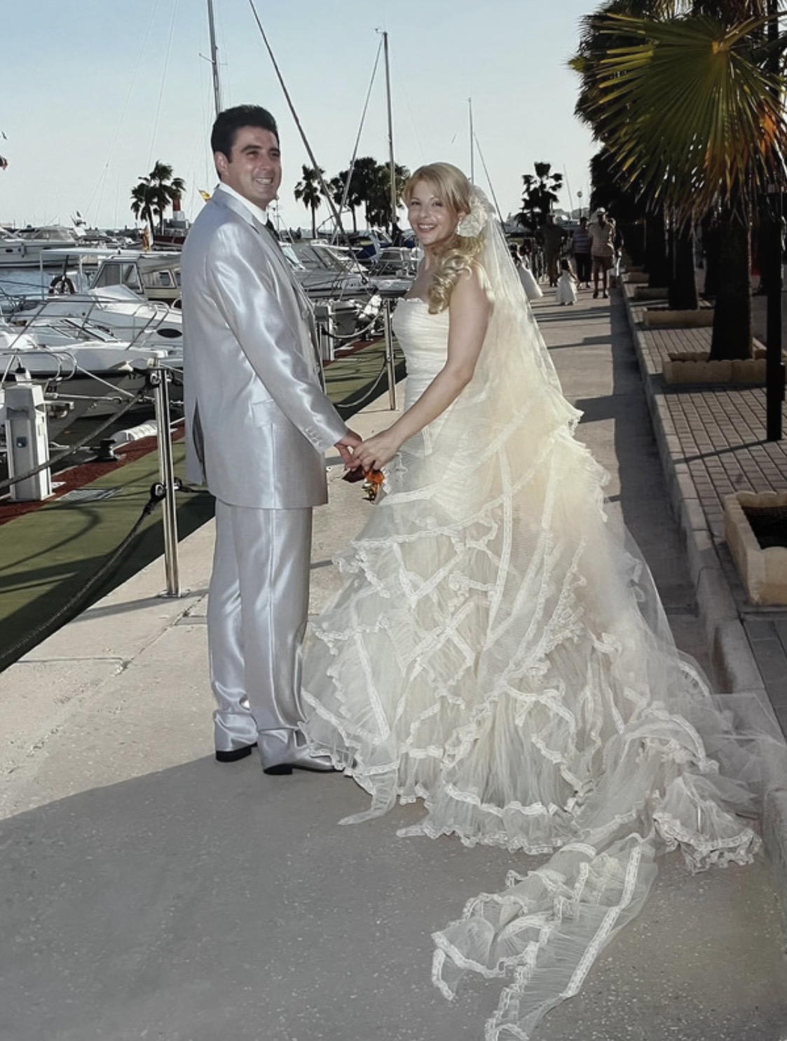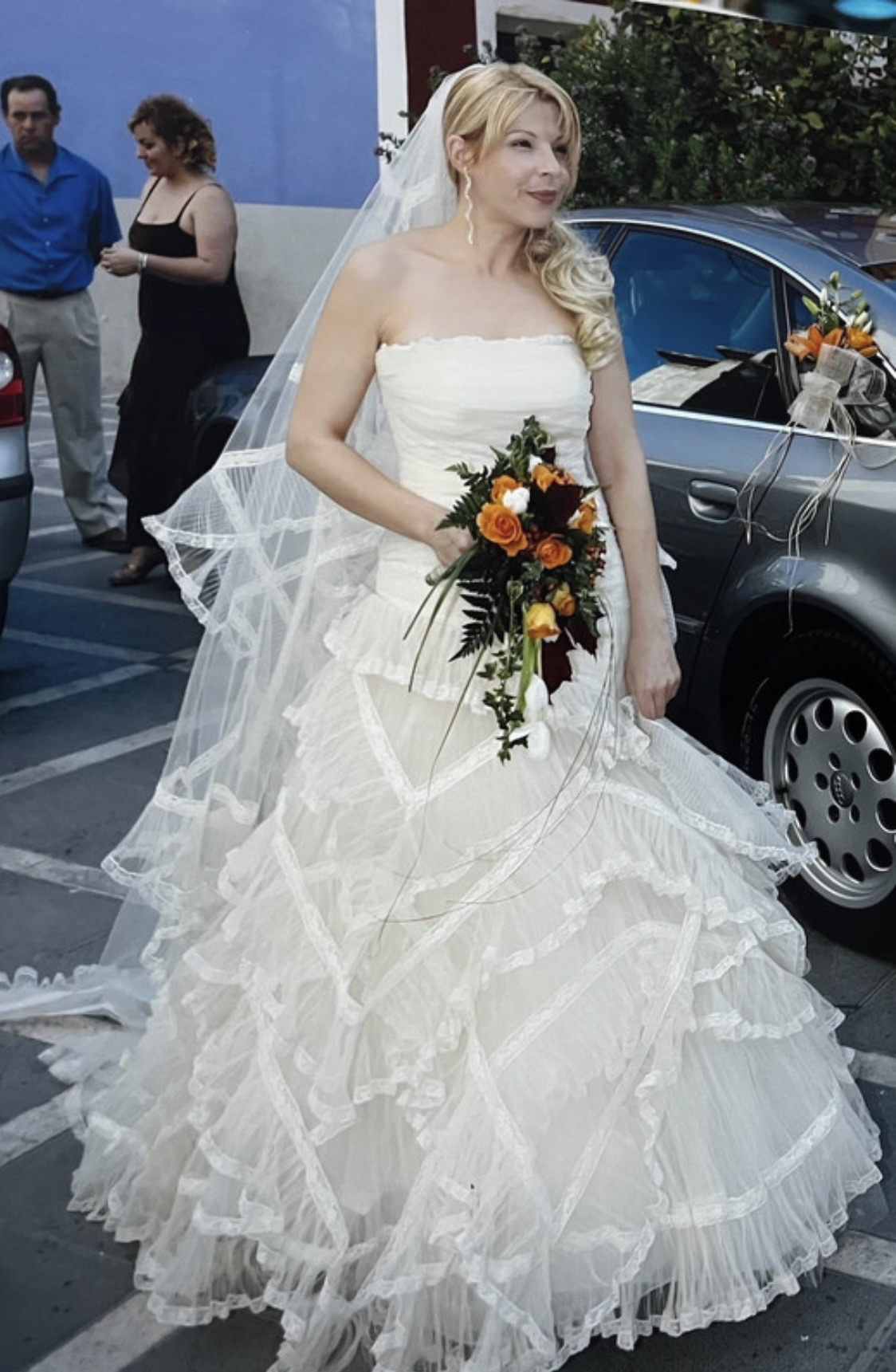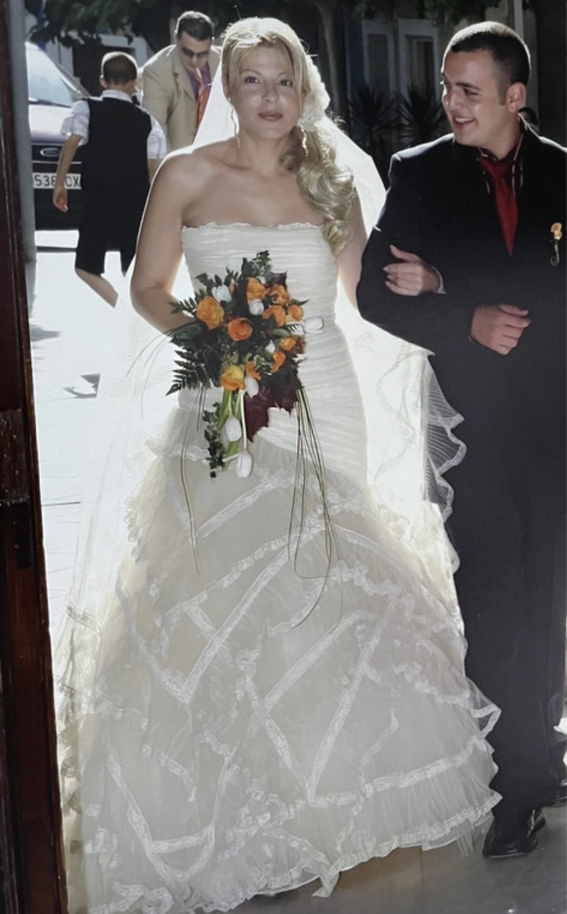 Precioso vestido Lorenzo Caprile que realza tu silueta, se vende con el velo a juego con los volantes del vestido