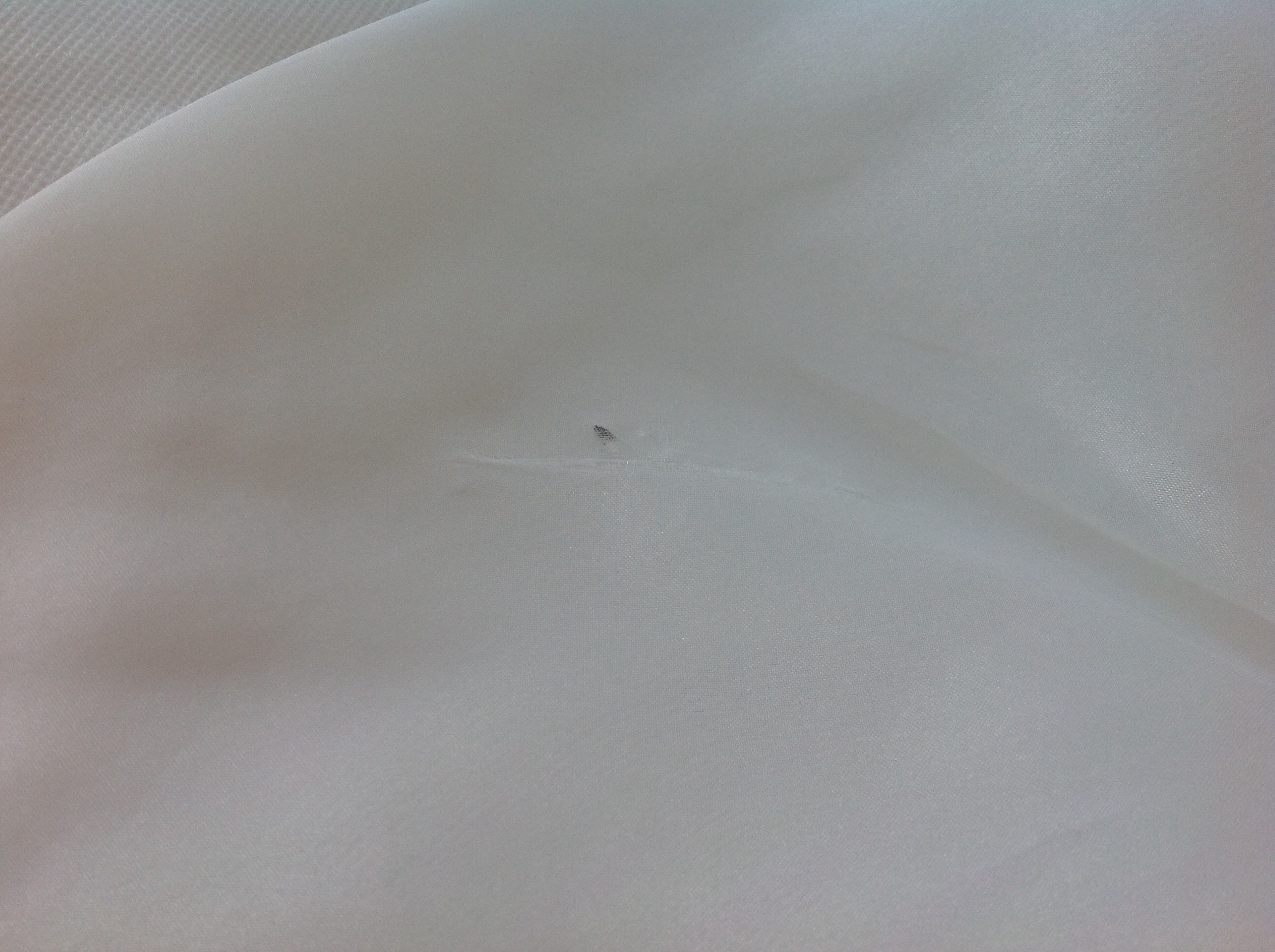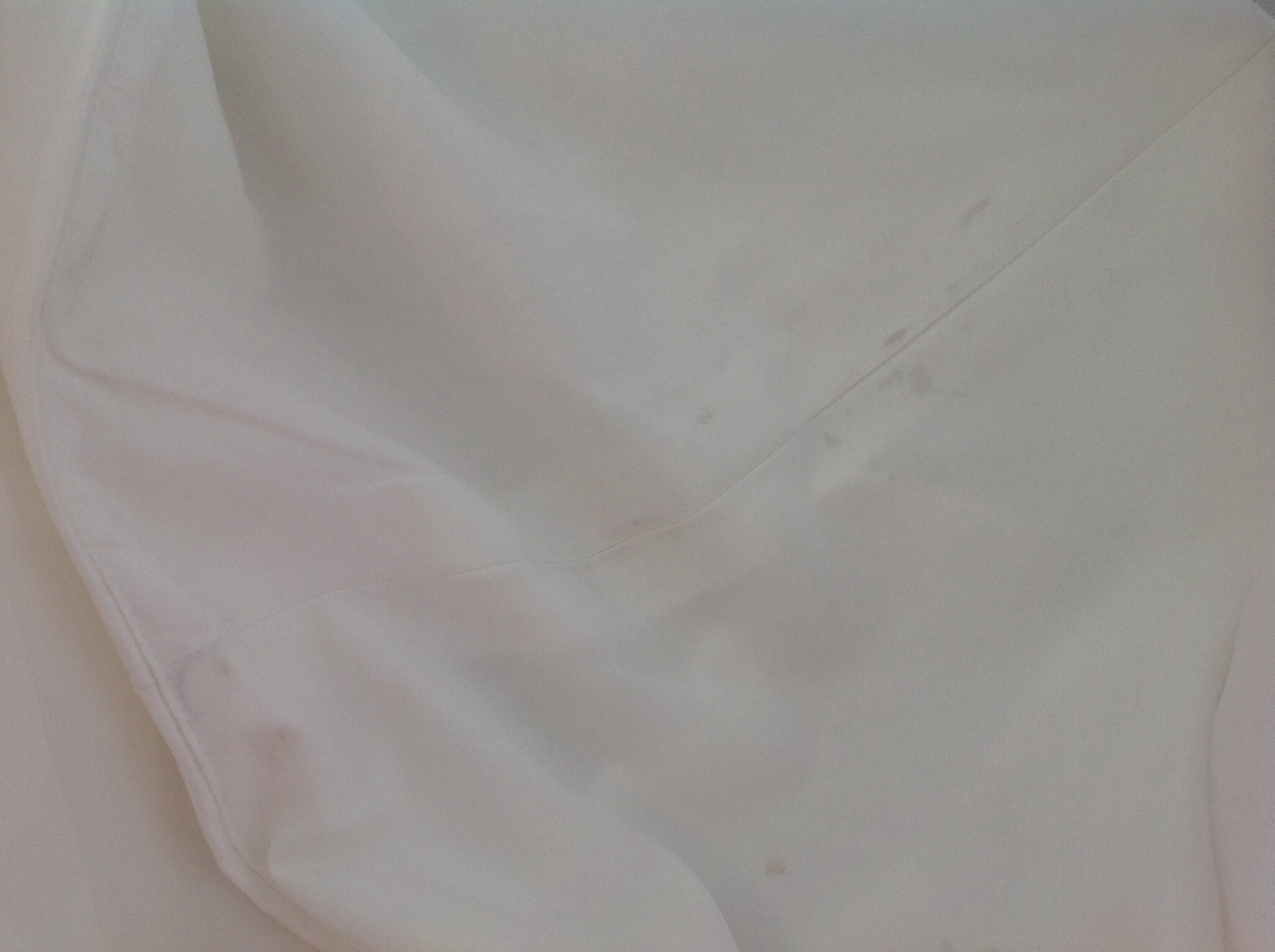 Estos daños y manchas no se ven, ya que estan por debajo de la falda en la parte que arrastra por el suelo.