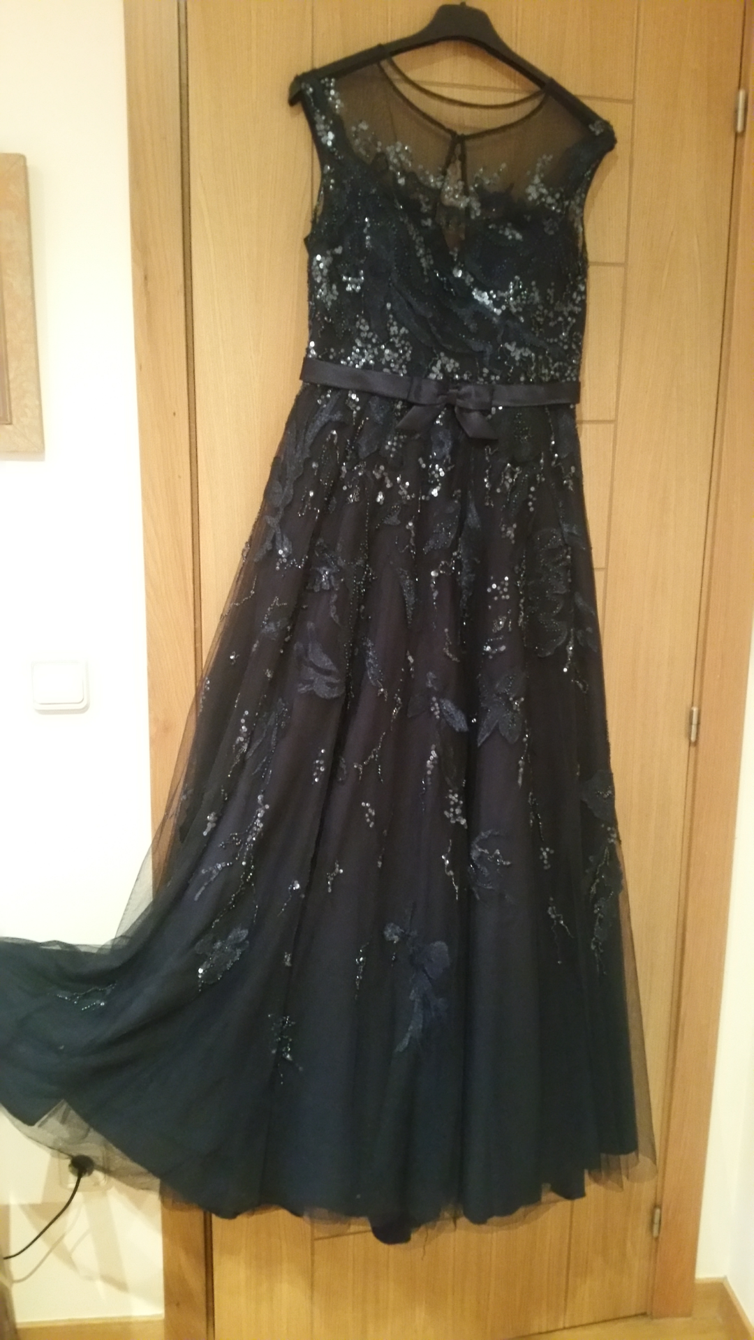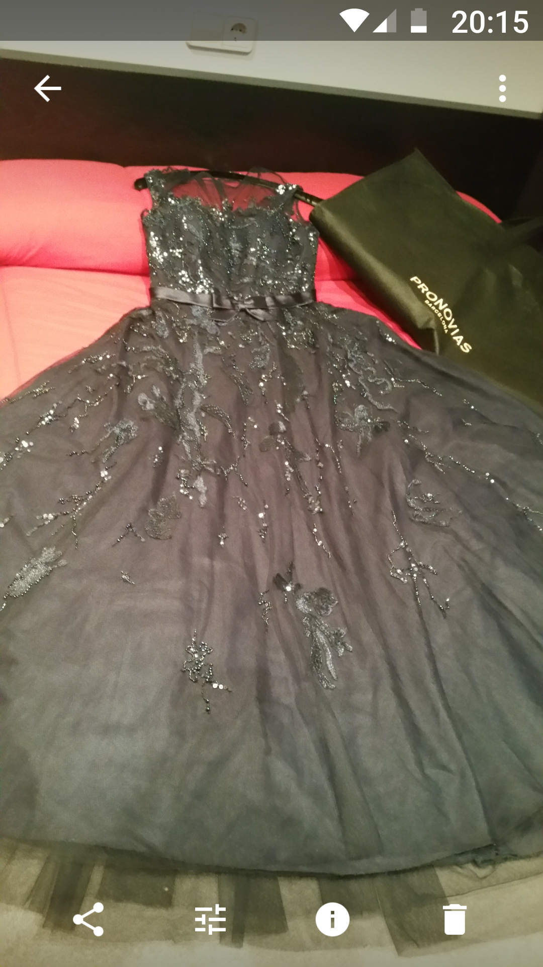 Espectacular vestido de tul mórbido , bordado con hilos y pedrería en azul noche , con una puesta de 8 horas . Es de Pronovias año 2017. Con obsequio de guantes en el mismo tono de satén y cartera plata con pedrería.