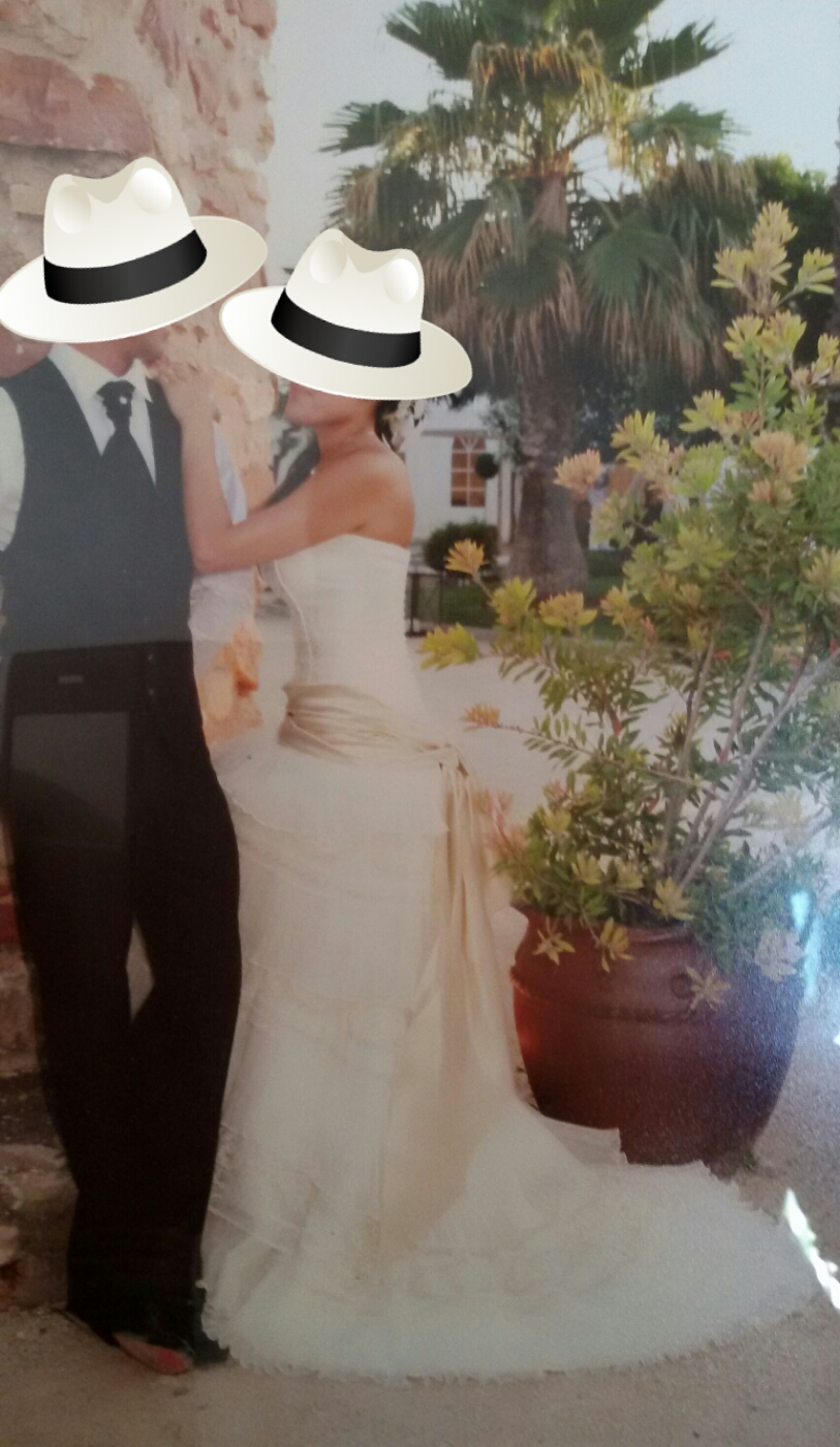 Vestido de novia en perfecto estado, no tiene rozaduras , manchas etc…, fue usado solo para la ceremonia, en blanco roto y dorados. Diseñadora patricia avendaño