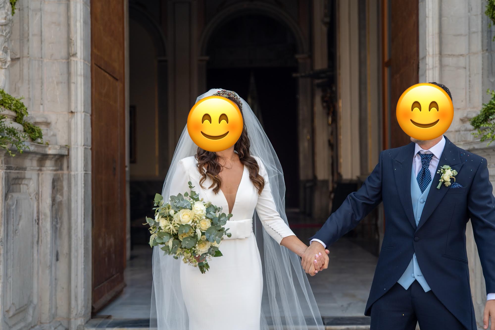 Vestido de novia en crepé natural, de corte sirena y cola. El cuerpo original era sin mangas pero el vestido me lo confeccionaron a medida y decidí que fuera con manga francesa rematada con los mismos botones que lleva en la espalda. El vestido tiene escote en V y en la cintura va rematado con una lazada rígida. La parte trasera va totalmente cubierta y rematada por botones forrados de la misma tela del vestido.
