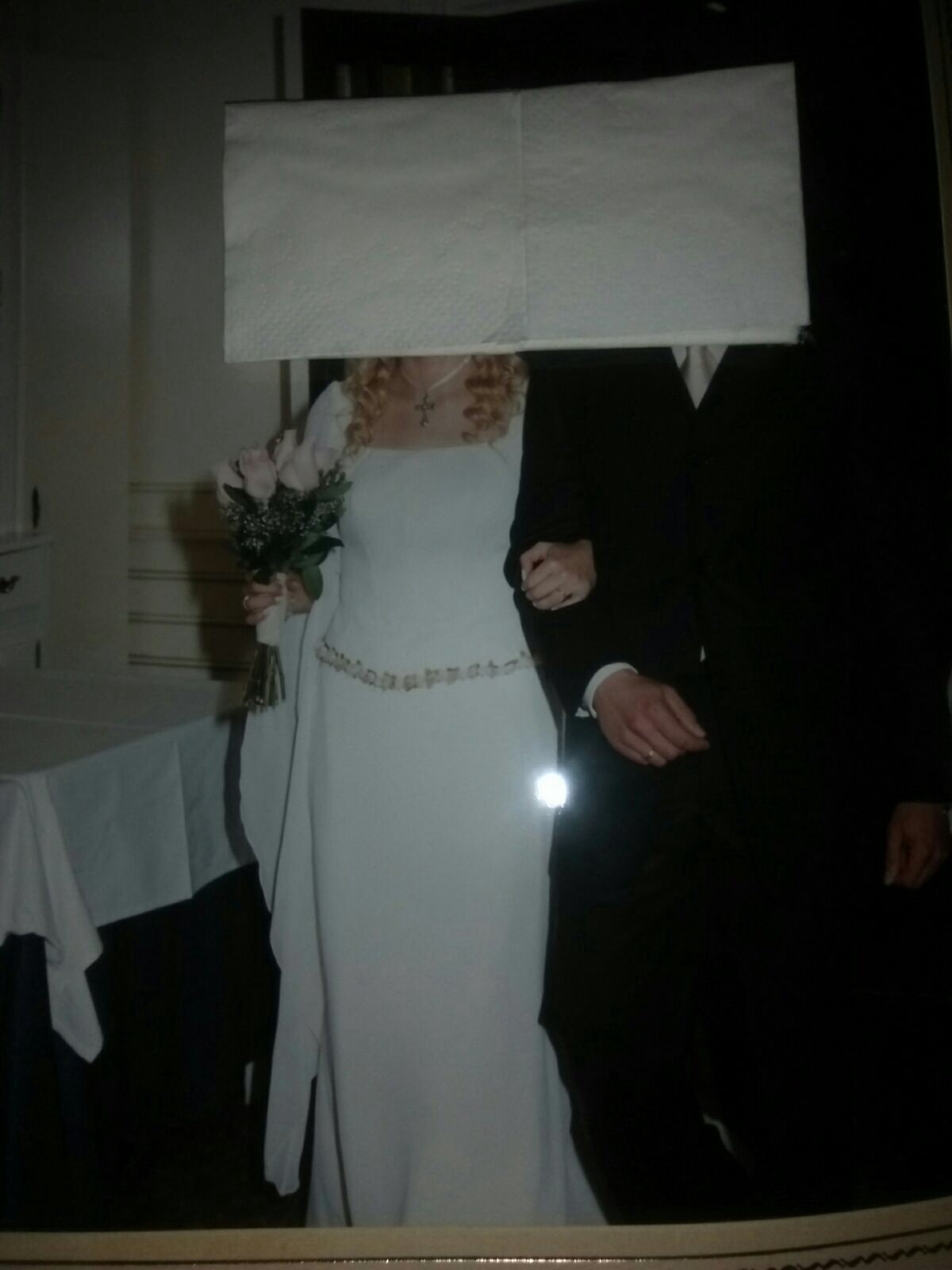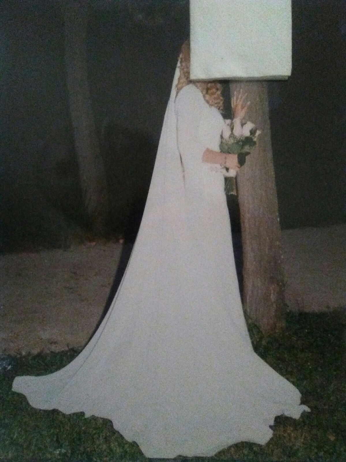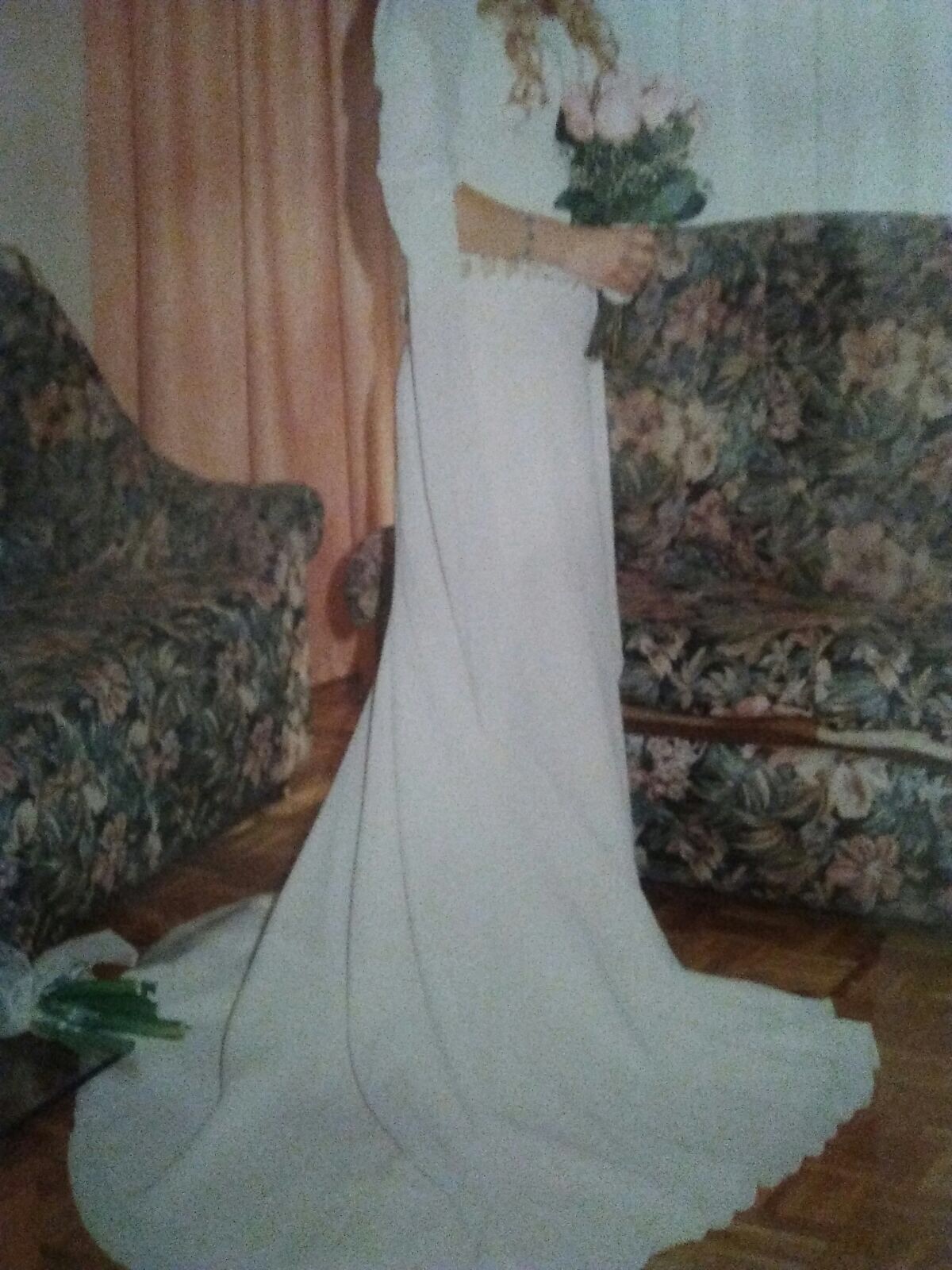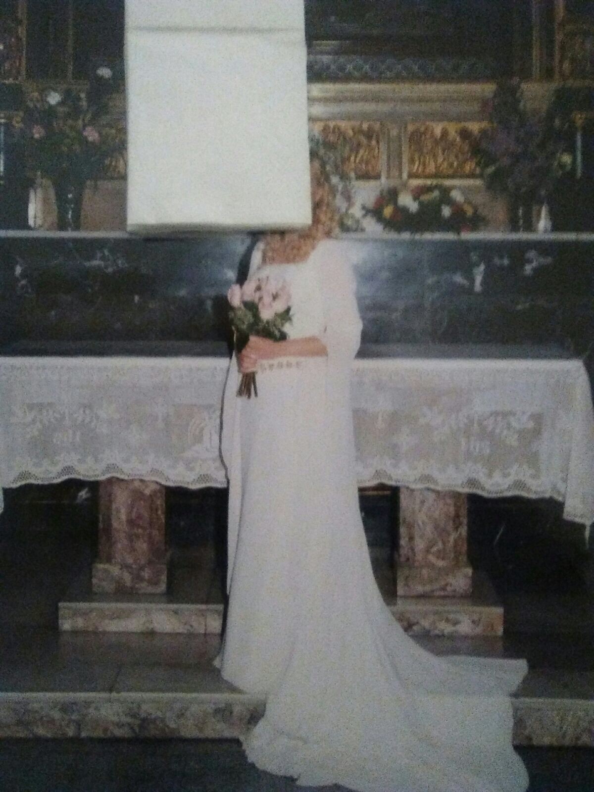 Precioso vestido de novia sólo usado una vez. Es un dos piezas falda y cuerpo. Incluyo el velo junto con la peineta y horquillas . Muy cómodo de llevar. Está limpio de tintorería en la misma funda donde me lo dieron. Las mangas son muy bonitas a medio brazo y luego caen. Mejor ver.