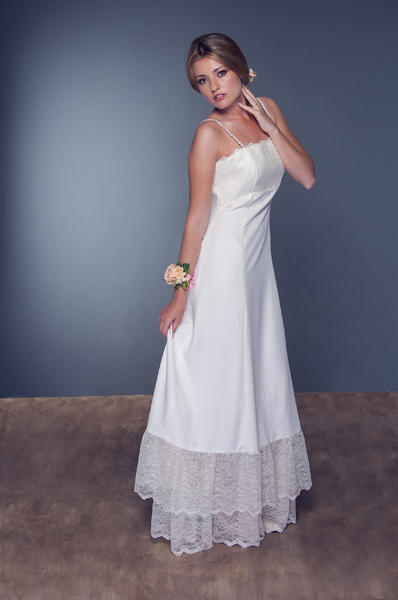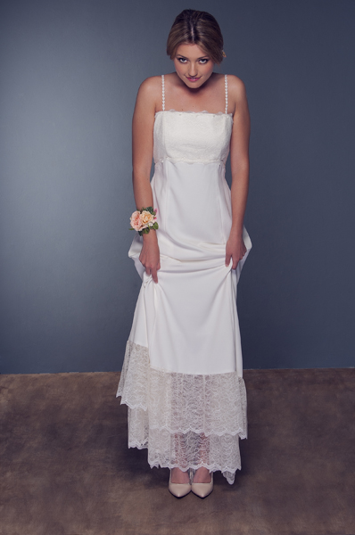 Vestido de crepe satén y chantilly, confeccionado en atelier en Barcelona.