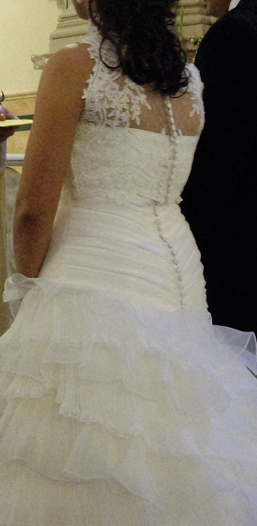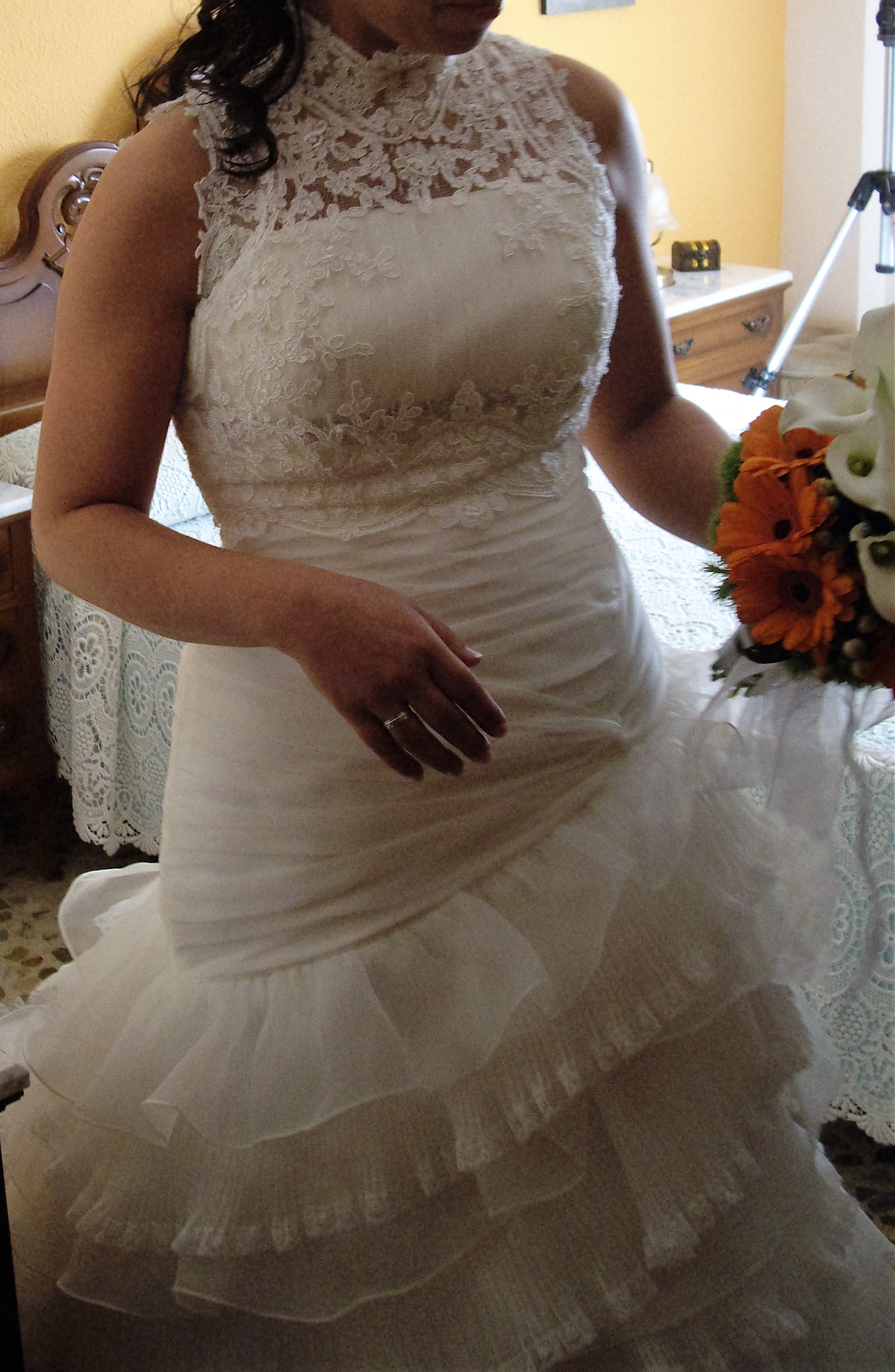 Además, bolero cuello alto sin mangas de encaje, con botones en la parte de atrás, siguiendo la misma línea del vestido.